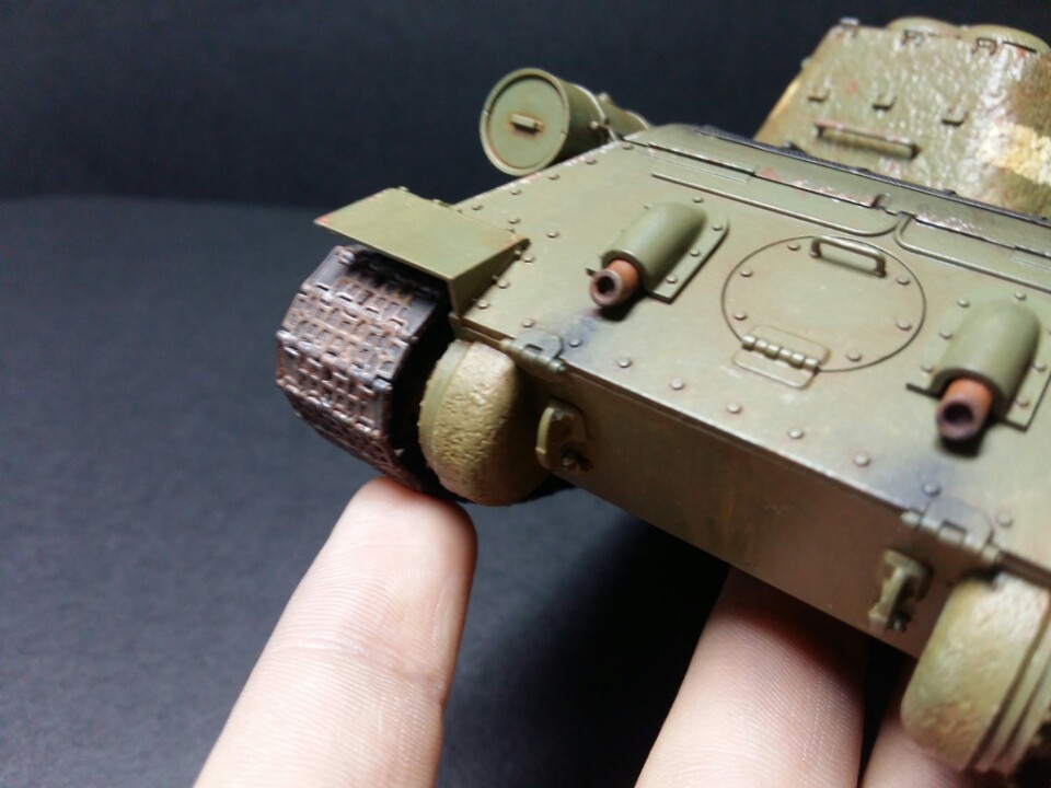 아카데미 T-34의 가장 큰 문제로 지목되는 벤틸레이터와 기동륜 기어 드럼의 주조 표현입니다. 아쉽게도 오류를 알면서도 제 실력의 부족으로 완전히 매끈하게 수정하지는 못했습니다. ㅠㅠ