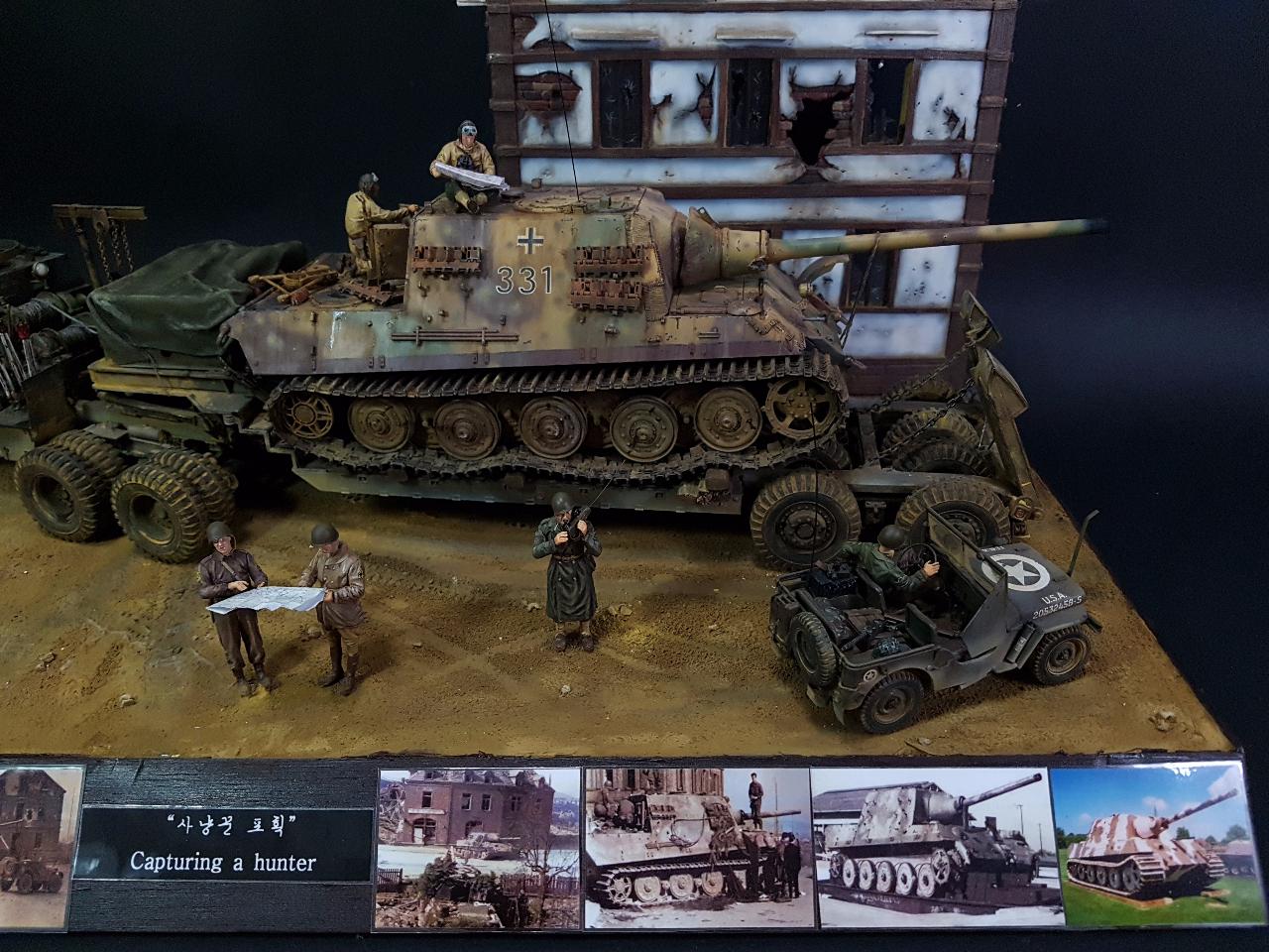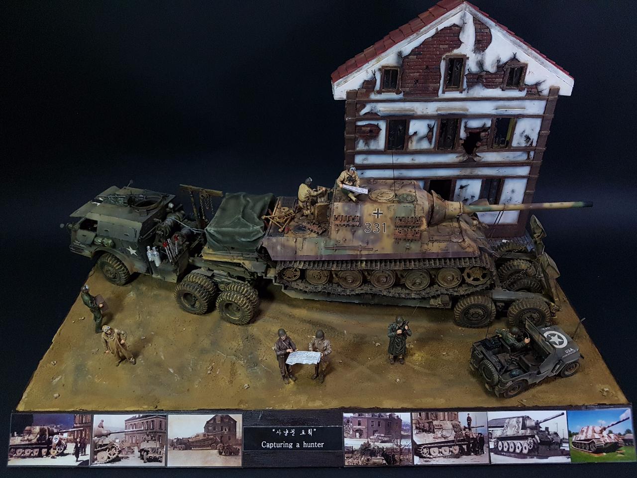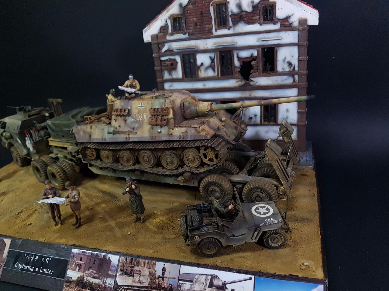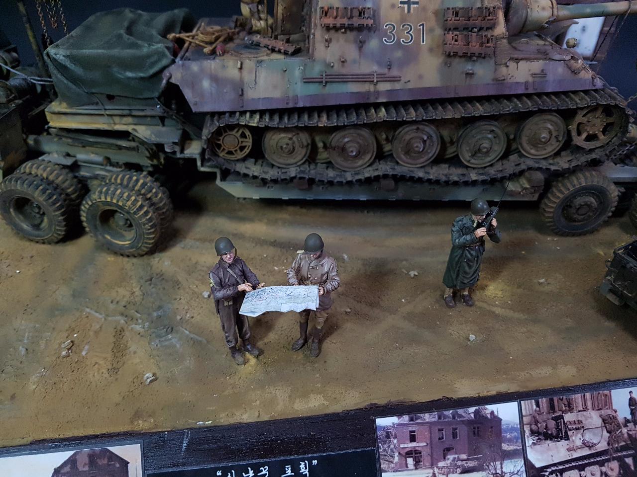 독일의 슈벳찡앤에서 미군에게 항복하여 노획되는 독일의 653전차대대의 야크트 티거 331호를 재현했습니다. 역사적인 사진을 근거로 해서 최대한 비슷하게 꾸며보았구요.. 사진만 표현하기엔 허전해서 여러 인형들을 투입시키면서 각색했습니다. ^^ 이후 야크트 티거 331호는 바다건너와서 미국의 에버딘 전차박물관에 전시되어 있습니다. 직접가시면 확인도 가능합니다. ㅎㅎ