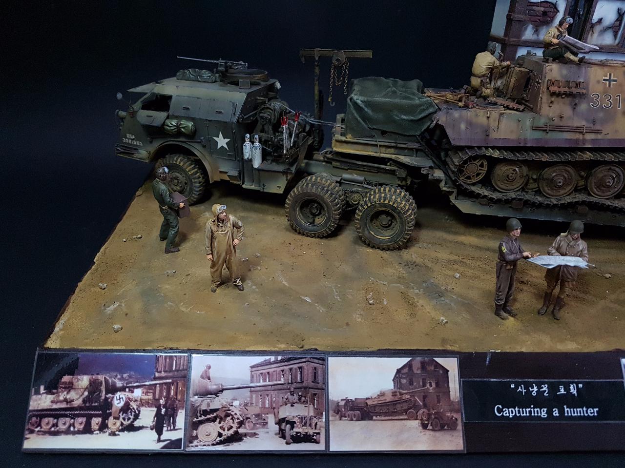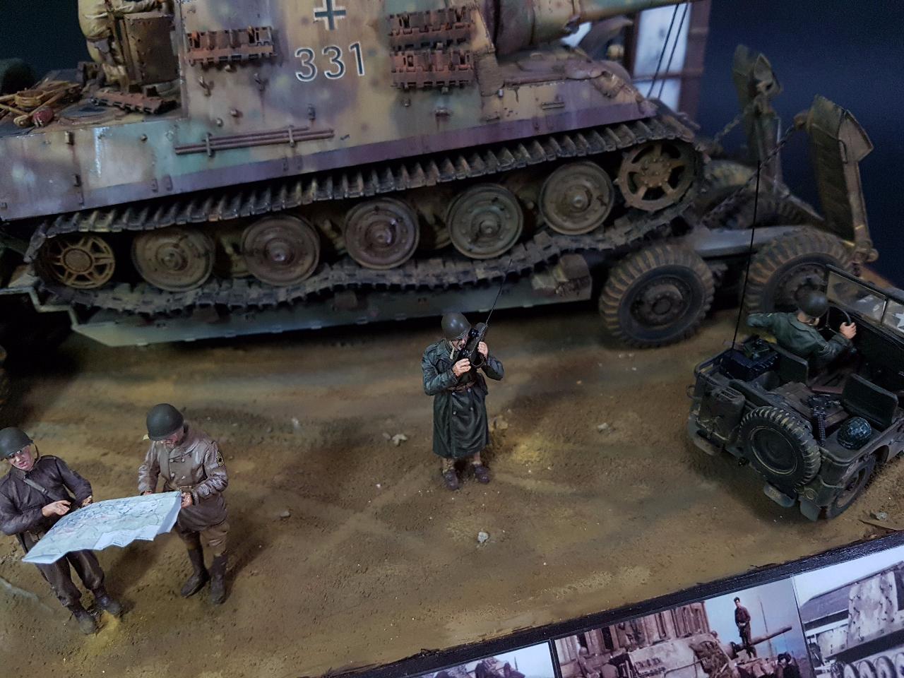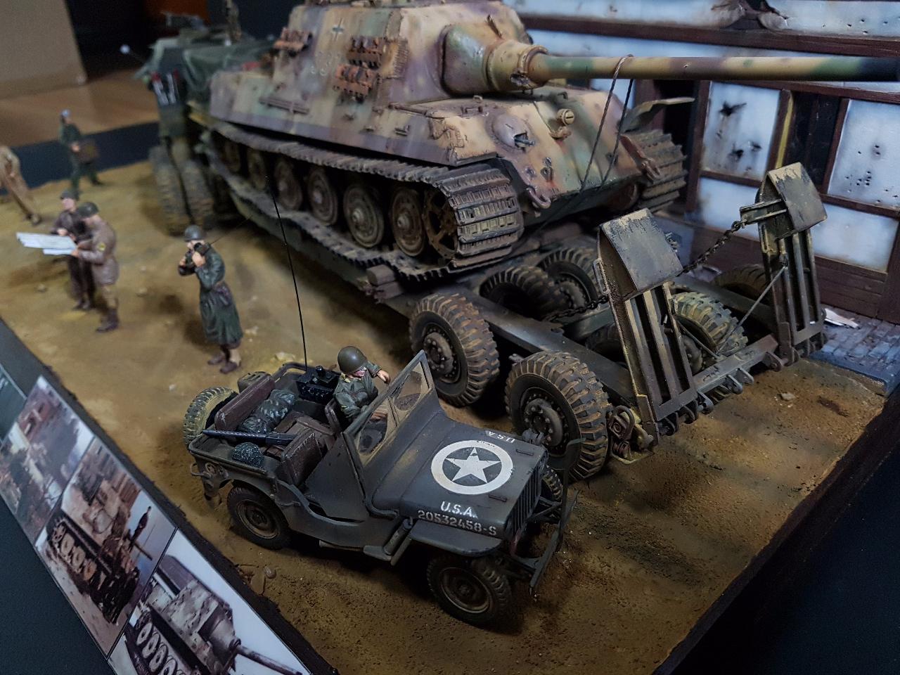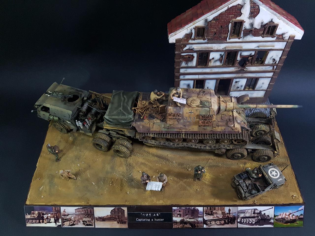 독일의 슈벳찡앤에서 미군에게 항복하여 노획되는 독일의 653전차대대의 야크트 티거 331호를 재현했습니다. 역사적인 사진을 근거로 해서 최대한 비슷하게 꾸며보았구요.. 사진만 표현하기엔 허전해서 여러 인형들을 투입시키면서 각색했습니다. ^^ 이후 야크트 티거 331호는 바다건너와서 미국의 에버딘 전차박물관에 전시되어 있습니다. 직접가시면 확인도 가능합니다. ㅎㅎ