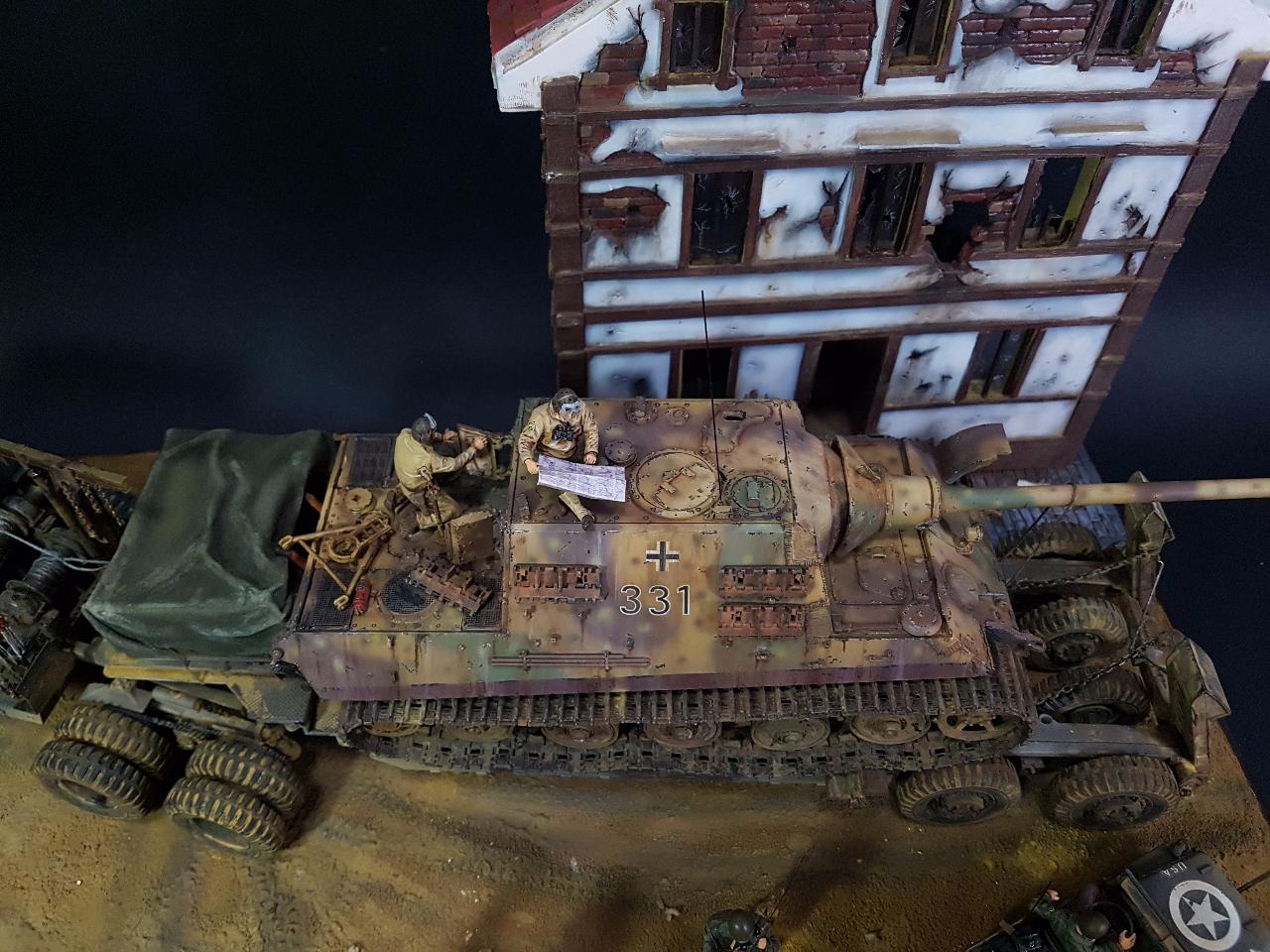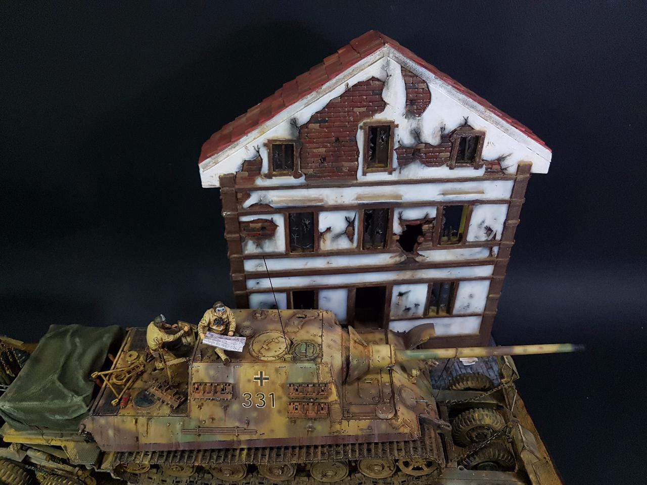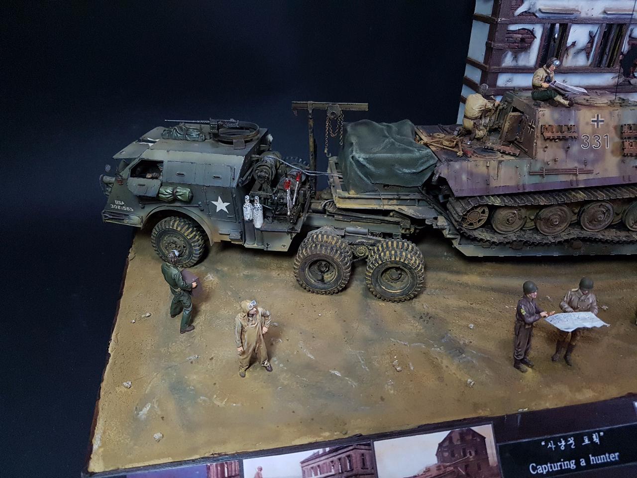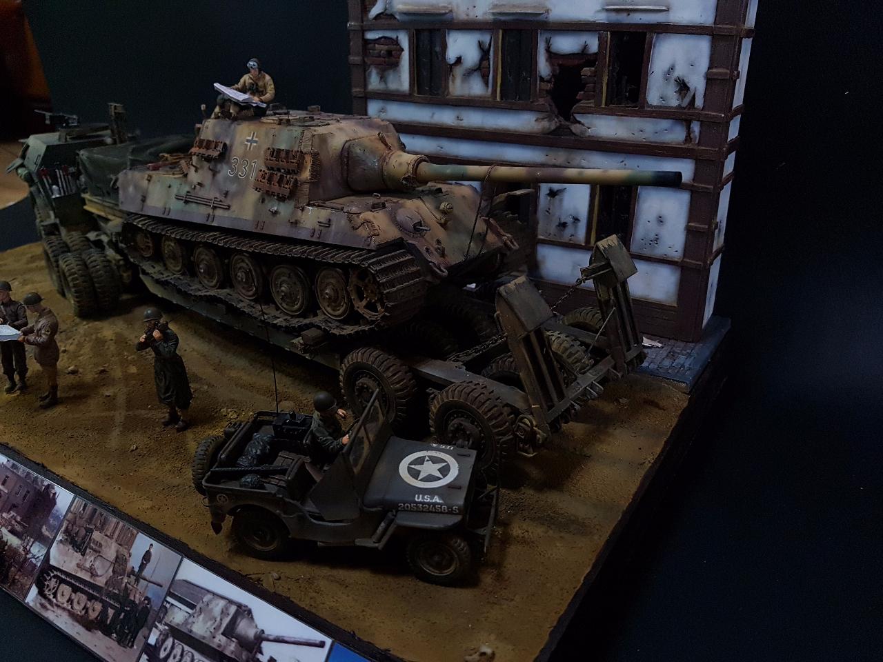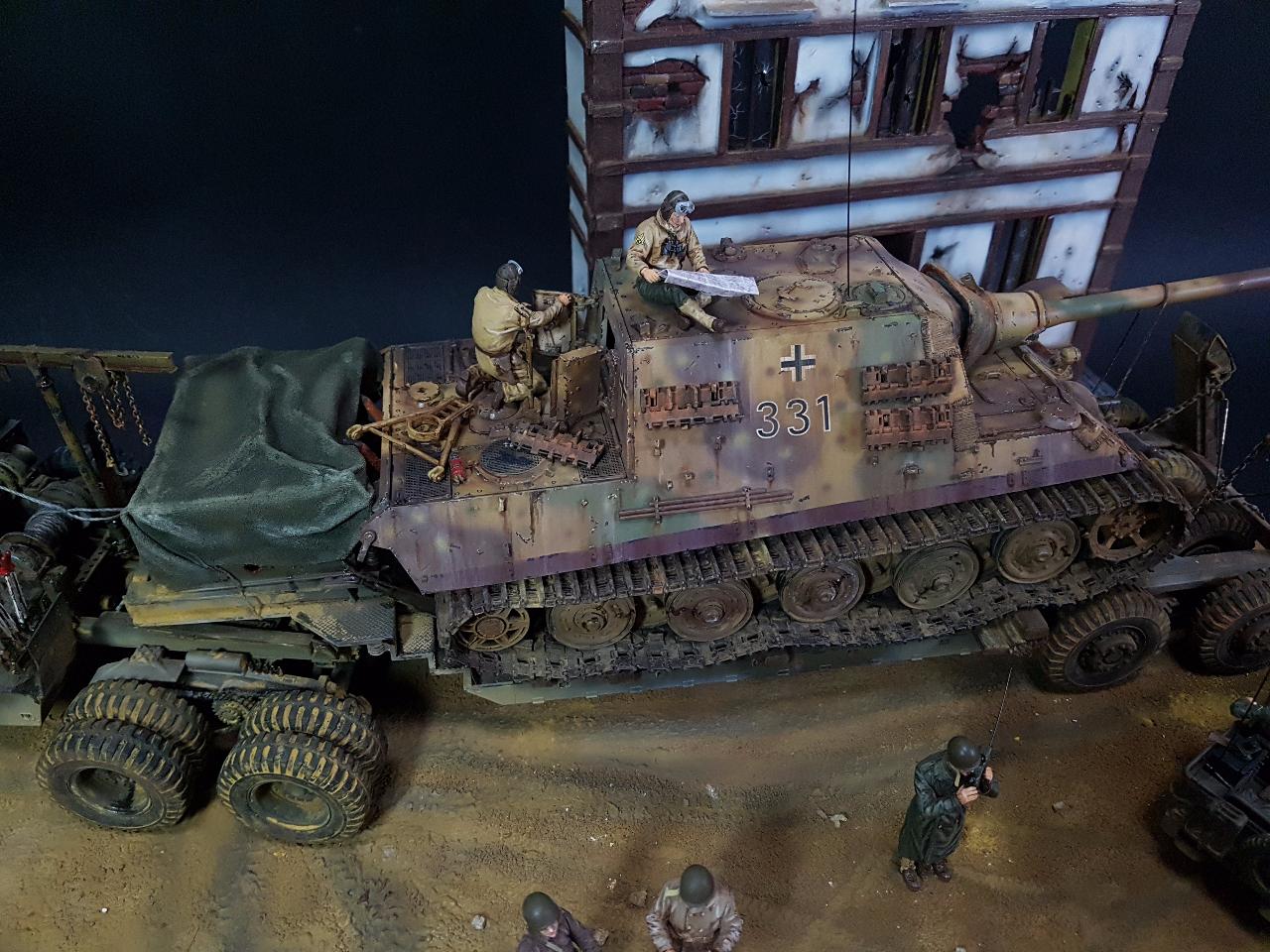 독일의 슈벳찡앤에서 미군에게 항복하여 노획되는 독일의 653전차대대의 야크트 티거 331호를 재현했습니다. 역사적인 사진을 근거로 해서 최대한 비슷하게 꾸며보았구요.. 사진만 표현하기엔 허전해서 여러 인형들을 투입시키면서 각색했습니다. ^^ 이후 야크트 티거 331호는 바다건너와서 미국의 에버딘 전차박물관에 전시되어 있습니다. 직접가시면 확인도 가능합니다. ㅎㅎ