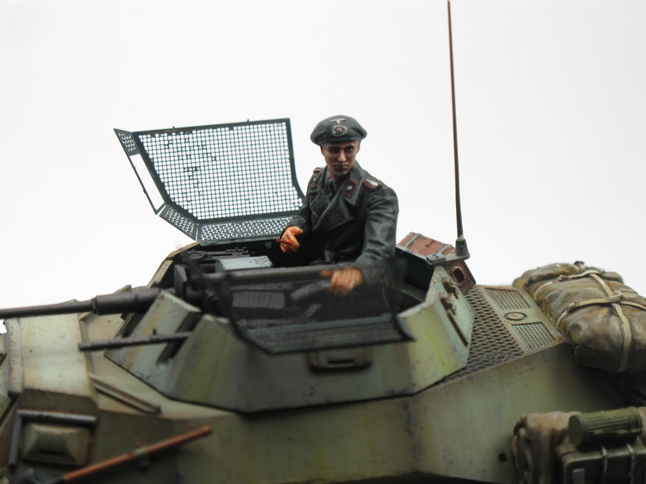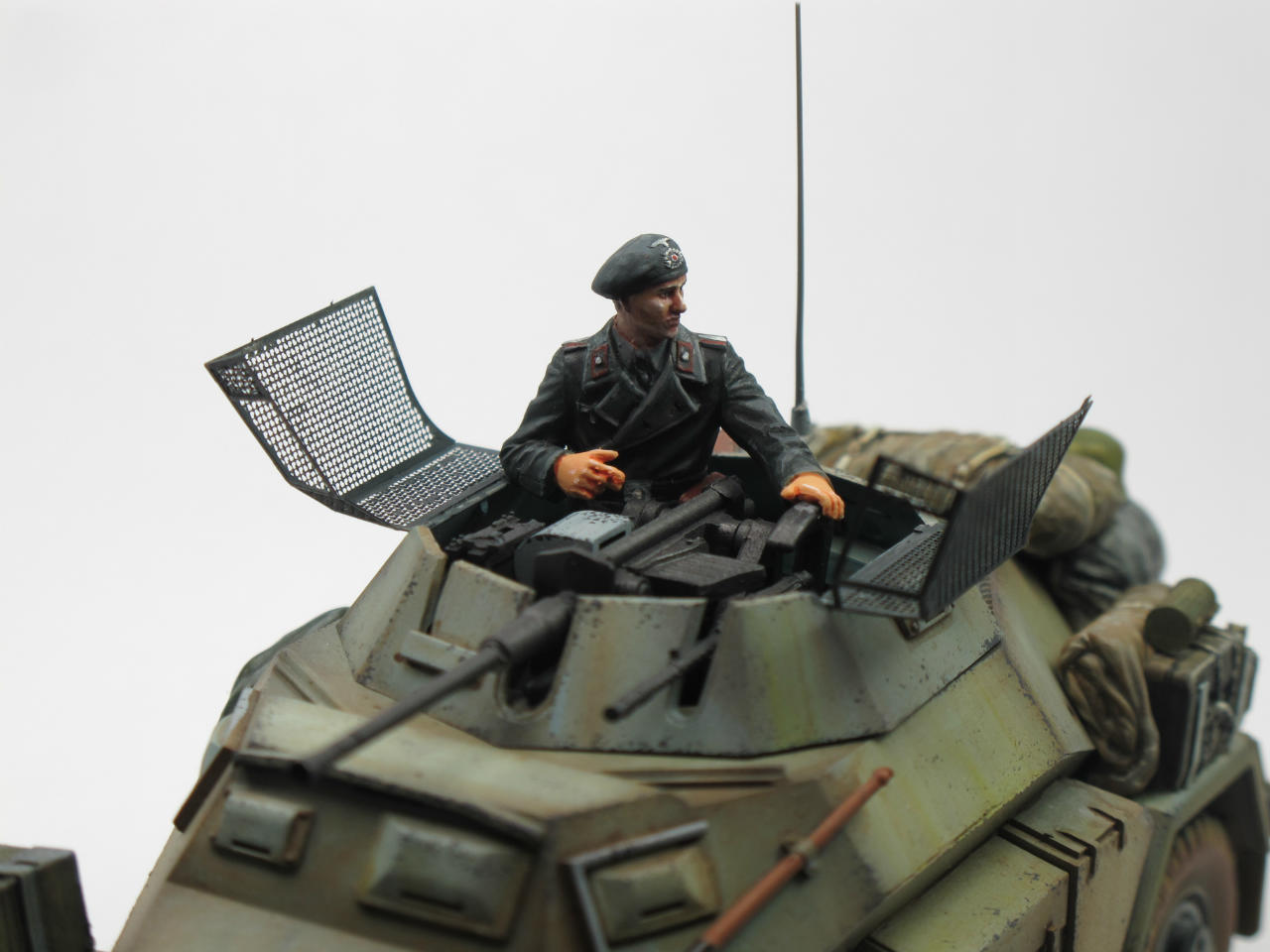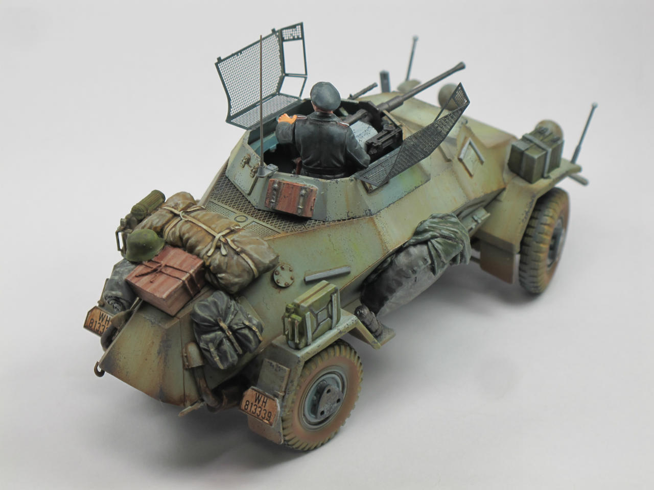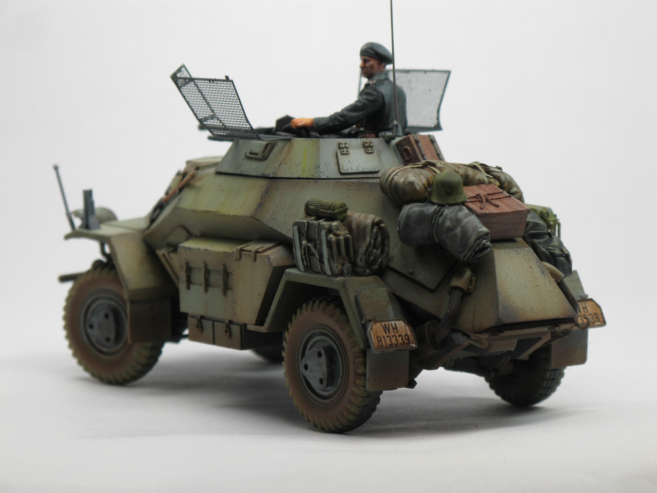 이번작품은 모두들 잘알고계시는 독일정찰장갑차 222입니다. 타미야제품이구요(에칭과 알루 바렐이들어있는). 포탑위에있는 망사는 에칭으로되어있는데 이게 훌륭한물건입니다~^^. 장비품은 레젼드입니다. 기본색 락카로 칠한후 에나멜.유화로 필더링과 워싱 이렇습니다