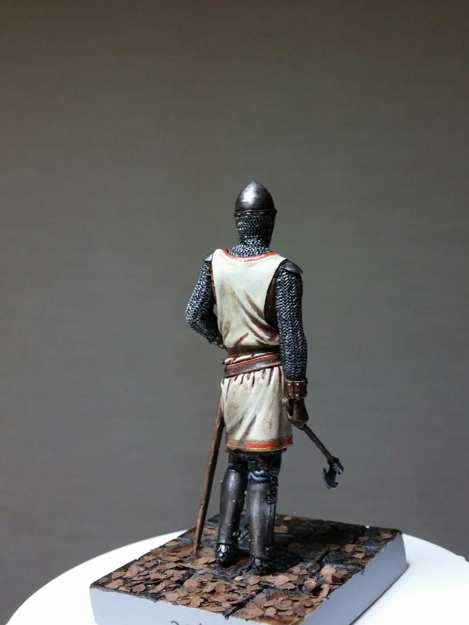 사슬 갑옷에서 철판 갑옷으로 넘어가는 과도기적 갑옷인 것 같습니다. 흉부에서 무기로 연결된 사슬은 한때 유행했던 것으로, 피탈끈 역할을 한다고 하는군요.