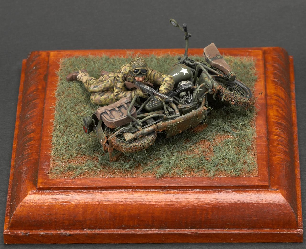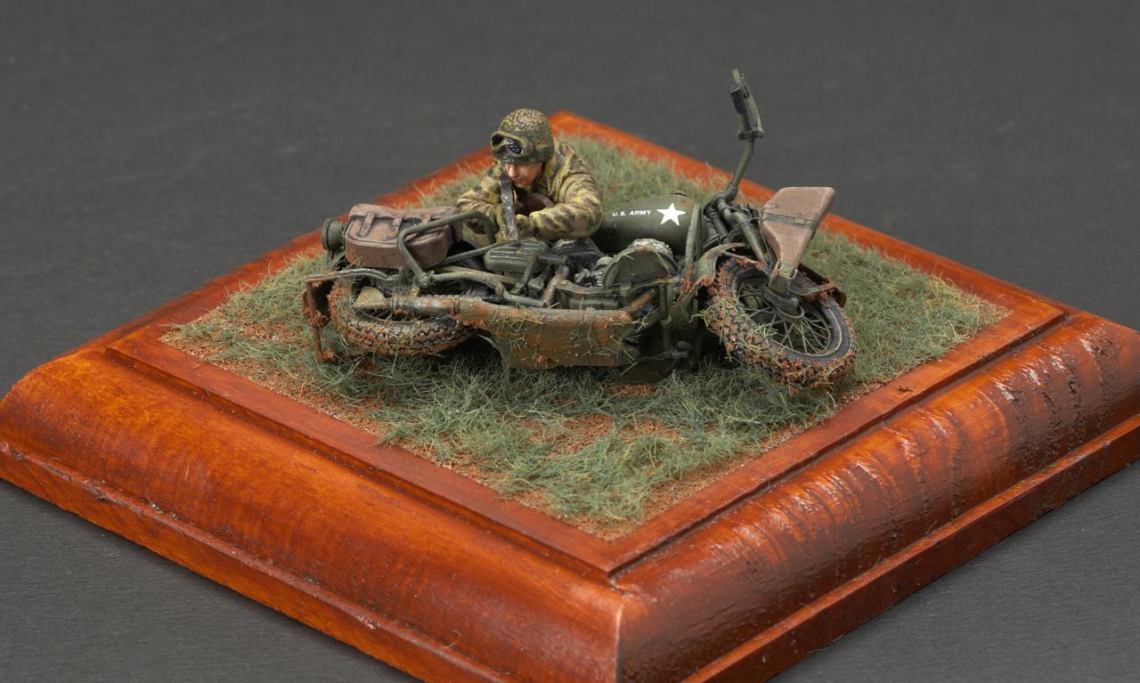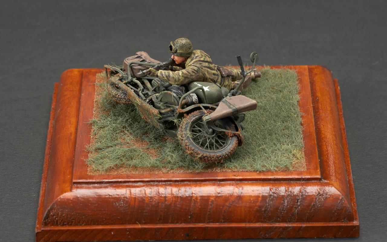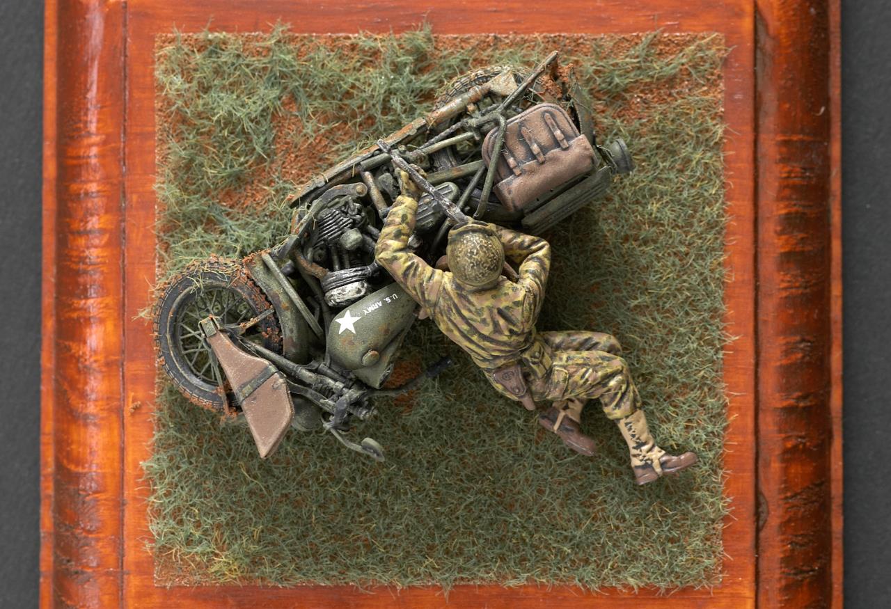 안녕하세요. 미니아트사의 미군 모터사이클 라이플맨입니다. 작례가 흔치 않은 킷인데 올리고 보니 바로 앞서 올리신분이 계시군요. 오토바이 조립이 에칭도 많고 까다롭더군요. 그래도 디테일은 좋은 것 같습니다. 오토바이 도색은 AK의 올리브 드랍 서페이서만 도색했고 그외에는 타미야 아크릴과 미그워시 도료 사용했습니다. 베이스는 DIY 인테리어 소품을 우드스테인 도색하여 사용했습니다. 지면은 타미야 디오라마 텍스처 페인트 사용했고 엄폐물이 없는 초원을 표현하기 위해 우드랜드 잔디가루를 그라스 어플리케이터로 뿌렸습니다.