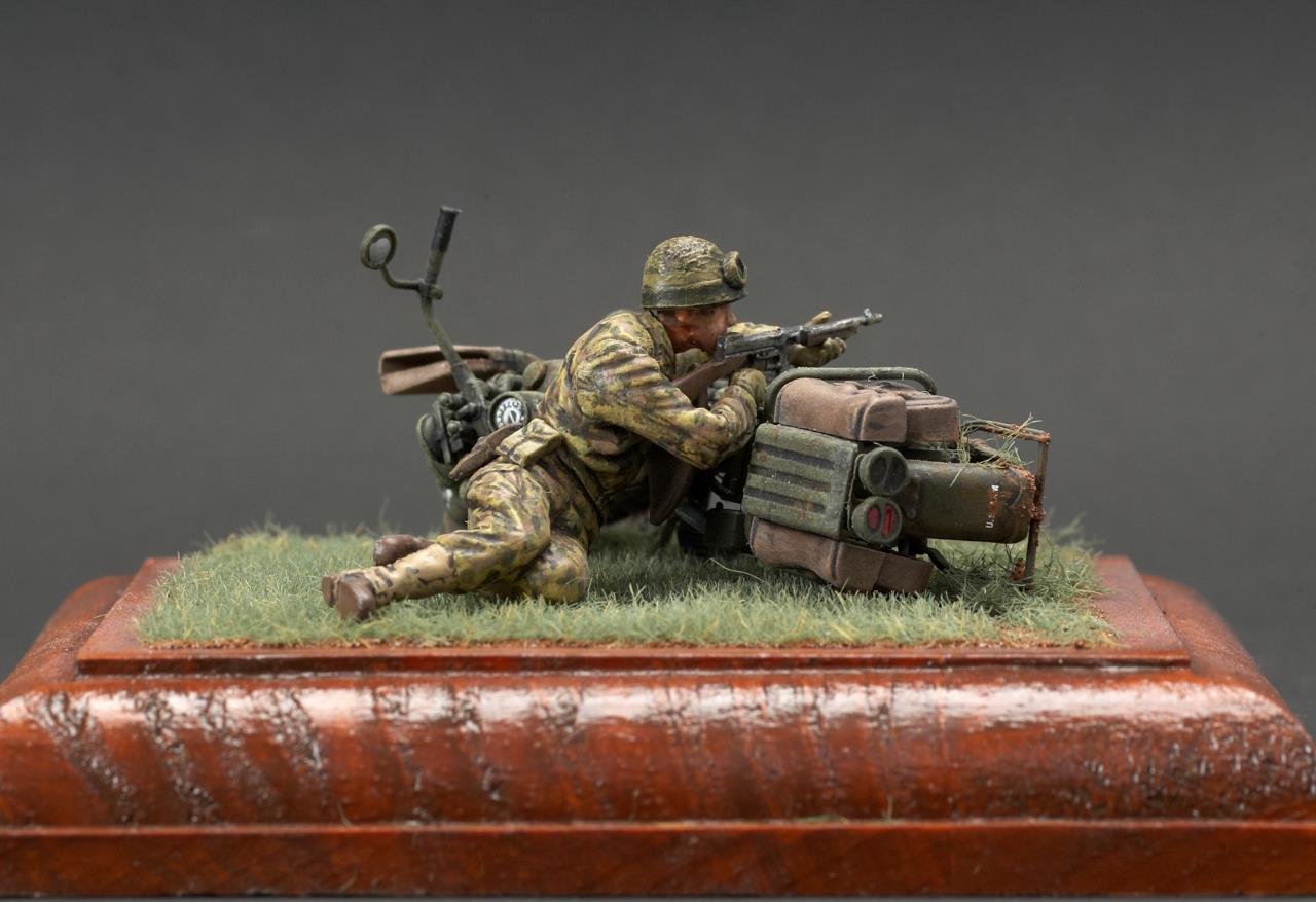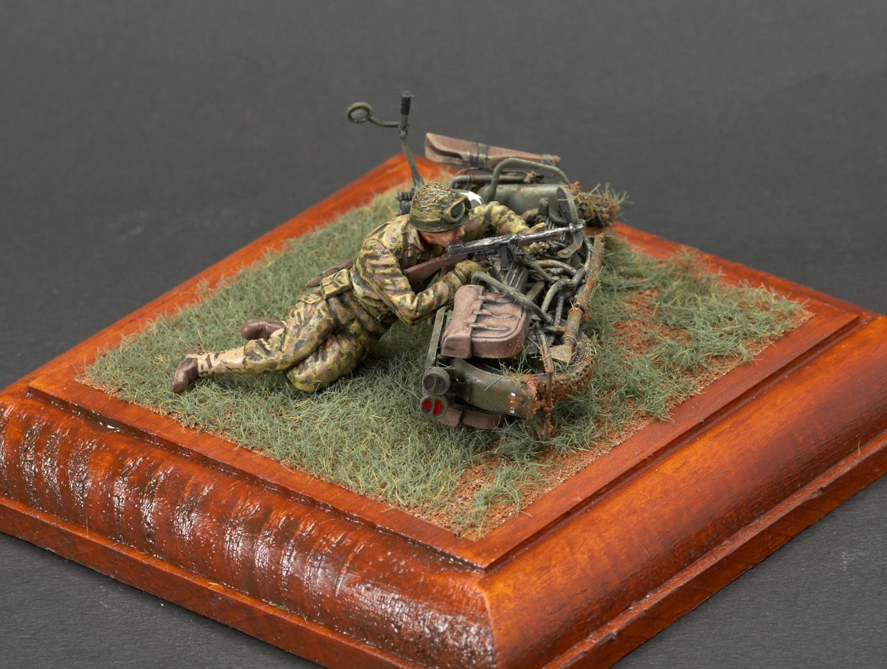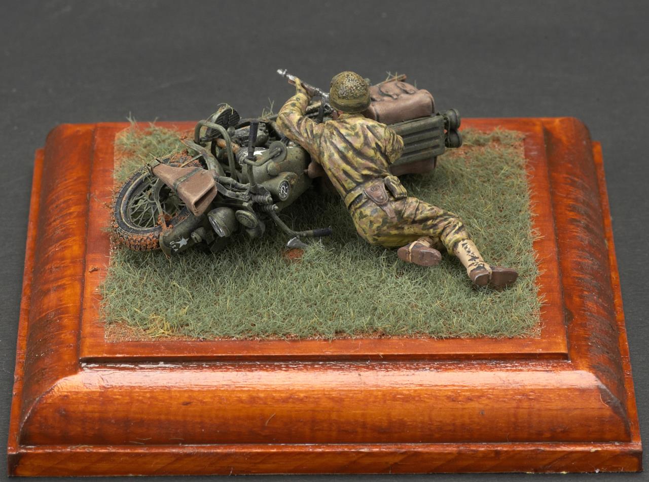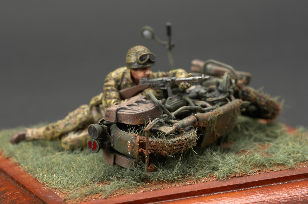 안녕하세요. 미니아트사의 미군 모터사이클 라이플맨입니다. 작례가 흔치 않은 킷인데 올리고 보니 바로 앞서 올리신분이 계시군요. 오토바이 조립이 에칭도 많고 까다롭더군요. 그래도 디테일은 좋은 것 같습니다. 오토바이 도색은 AK의 올리브 드랍 서페이서만 도색했고 그외에는 타미야 아크릴과 미그워시 도료 사용했습니다. 베이스는 DIY 인테리어 소품을 우드스테인 도색하여 사용했습니다. 지면은 타미야 디오라마 텍스처 페인트 사용했고 엄폐물이 없는 초원을 표현하기 위해 우드랜드 잔디가루를 그라스 어플리케이터로 뿌렸습니다.