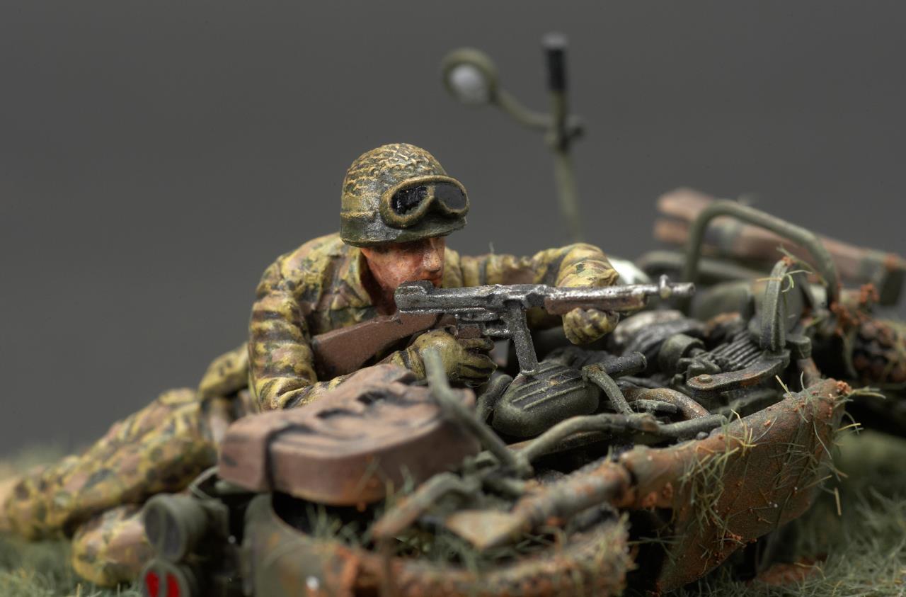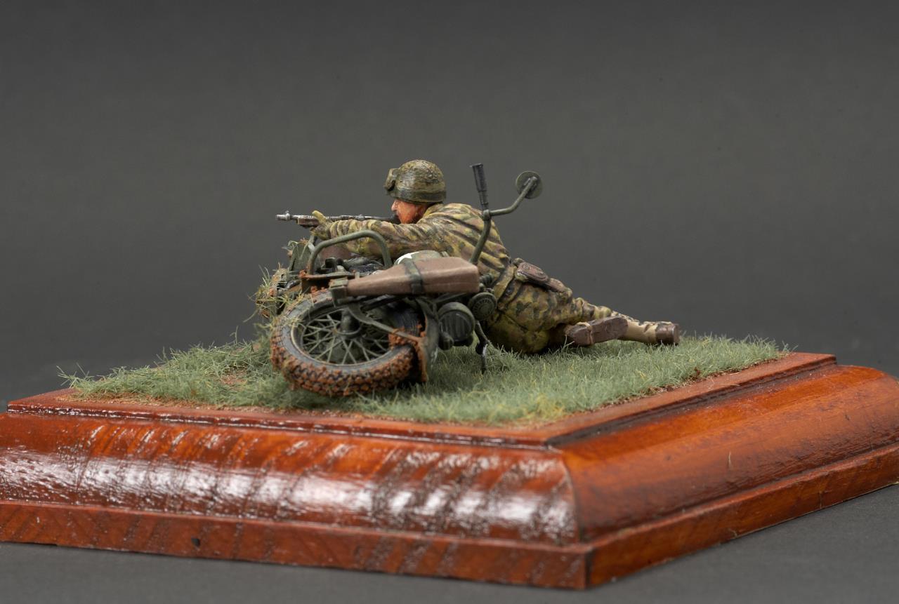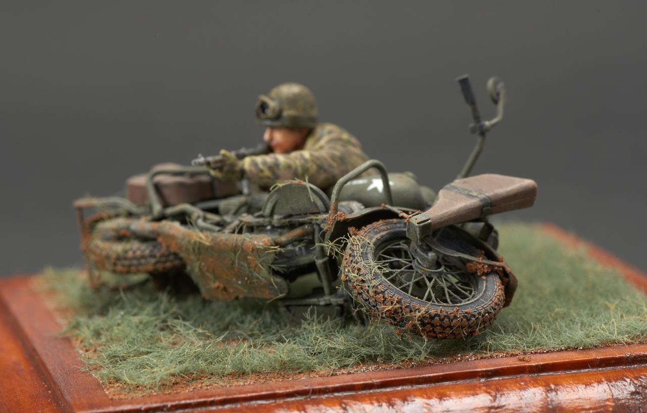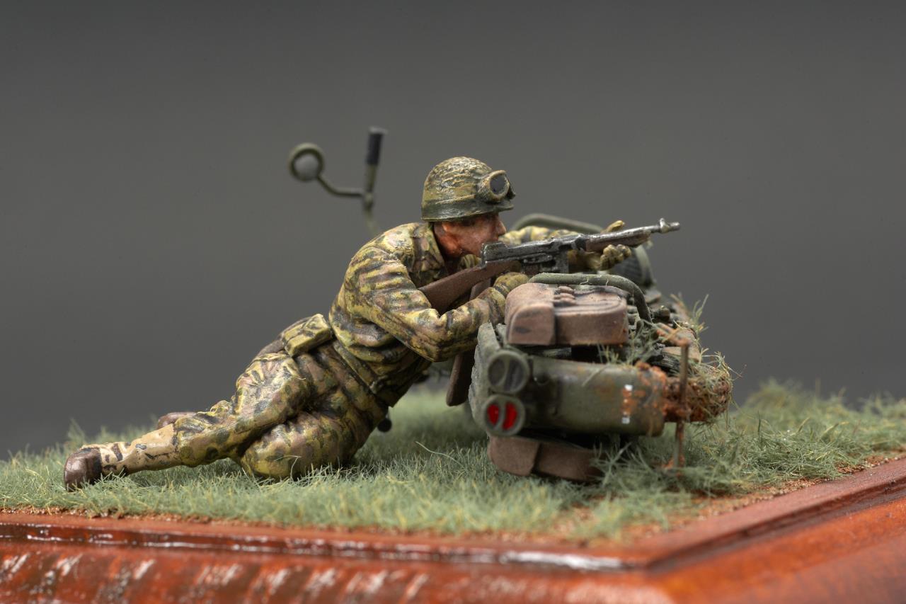안녕하세요. 미니아트사의 미군 모터사이클 라이플맨입니다. 작례가 흔치 않은 킷인데 올리고 보니 바로 앞서 올리신분이 계시군요. 오토바이 조립이 에칭도 많고 까다롭더군요. 그래도 디테일은 좋은 것 같습니다. 오토바이 도색은 AK의 올리브 드랍 서페이서만 도색했고 그외에는 타미야 아크릴과 미그워시 도료 사용했습니다. 베이스는 DIY 인테리어 소품을 우드스테인 도색하여 사용했습니다. 지면은 타미야 디오라마 텍스처 페인트 사용했고 엄폐물이 없는 초원을 표현하기 위해 우드랜드 잔디가루를 그라스 어플리케이터로 뿌렸습니다.