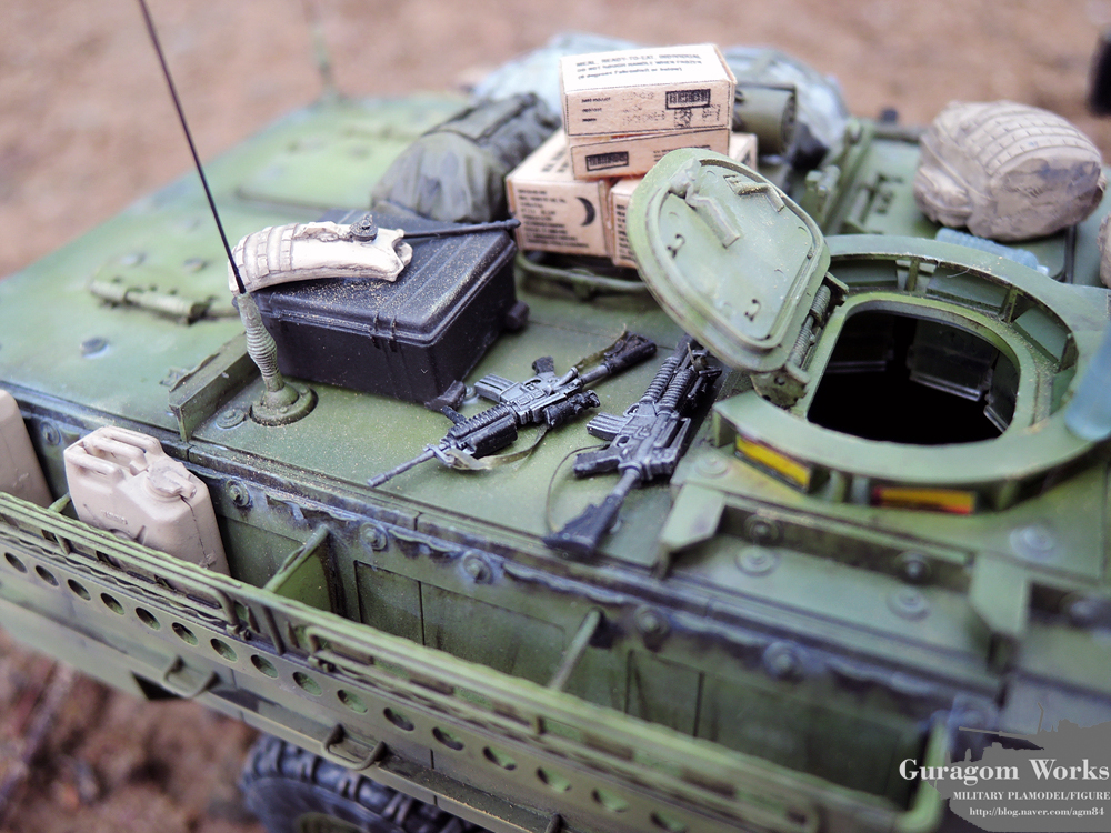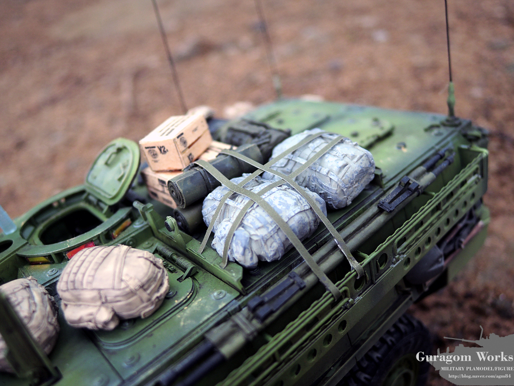 별매 레진타이어(스패어타이어),레전드 미군 현용장비셋 등을 사용하였습니다. 이외 스트랩등을 마스킹테잎으로 표현하여 주었으며 여기저기 작은 포인트로