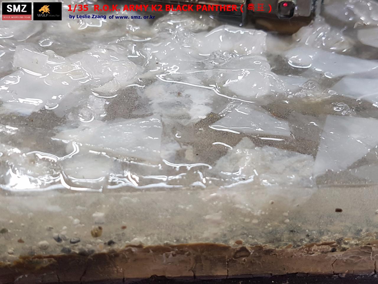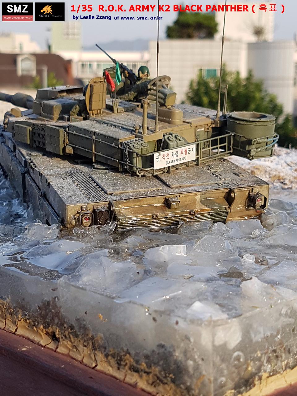 겨울 혹한기 훈련중인 흑표가 연막탄을 터뜨리며 얼어붙은 강을 도하하는 컨셉입니다.
