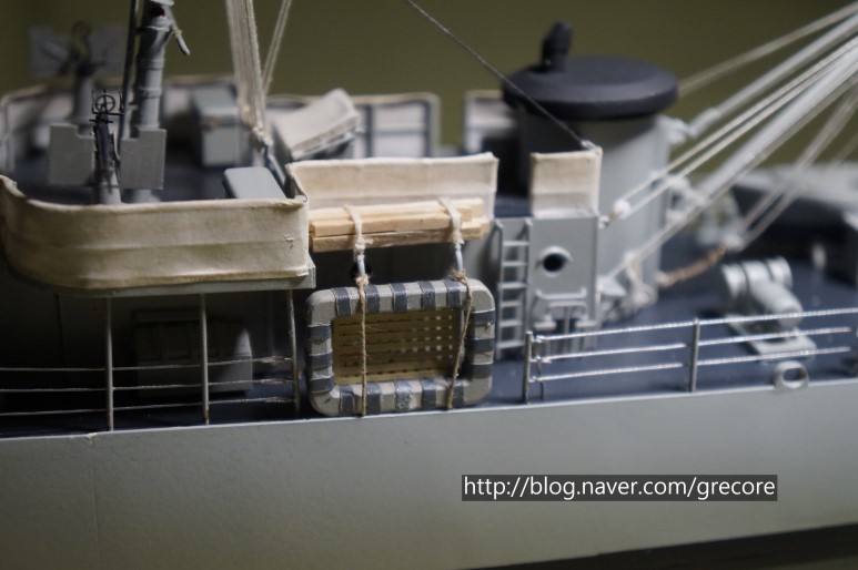 좌현 구명뗏목 - 포맥스로 만든 틀에 종이 등을 감아서 표현, 뗏목 위에 보수용 목재는 아이스크림 막대를 잘라서 만들었습니다