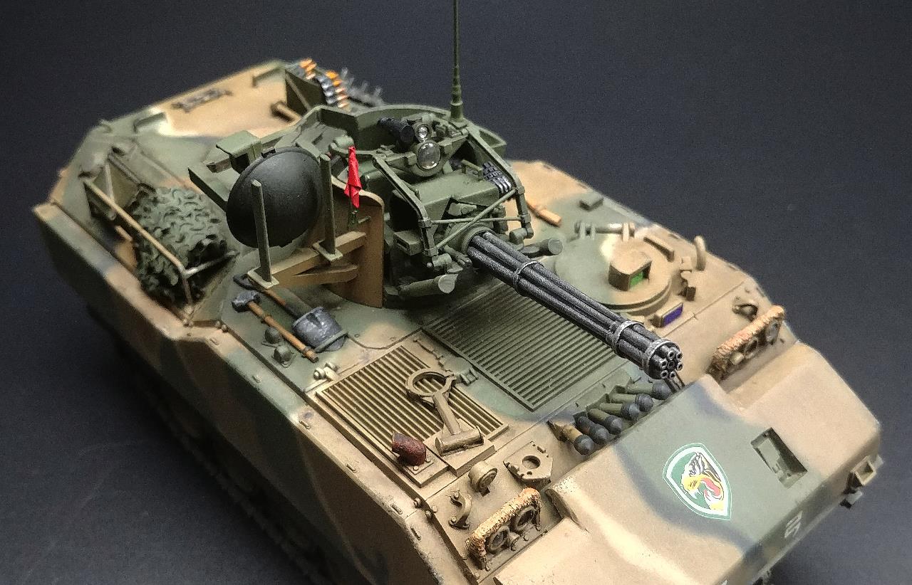 총탑은 한국군 특유의 X자 가이드 지지봉과 깃대봉 그리고 야간 투시경을 추가 해줬습니다. 렌즈류는 모두 비즈로 교체 해주었는데 이게 사실 어두운 렌즈인데 비즈가 워낙 영롱해서 스모크를 발라 주었는데도 티가 안나네요 그리고또 차이점이 포신 고정부가 M163과 완전히 다른 견인 발칸의 것이 달려 있습니다. 그래서 멀쩡한걸 버리고 비슷하게 제작해서 달아 주었습니다.