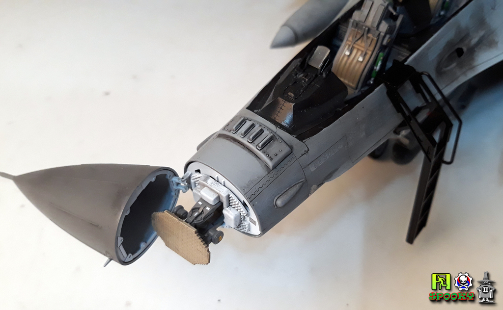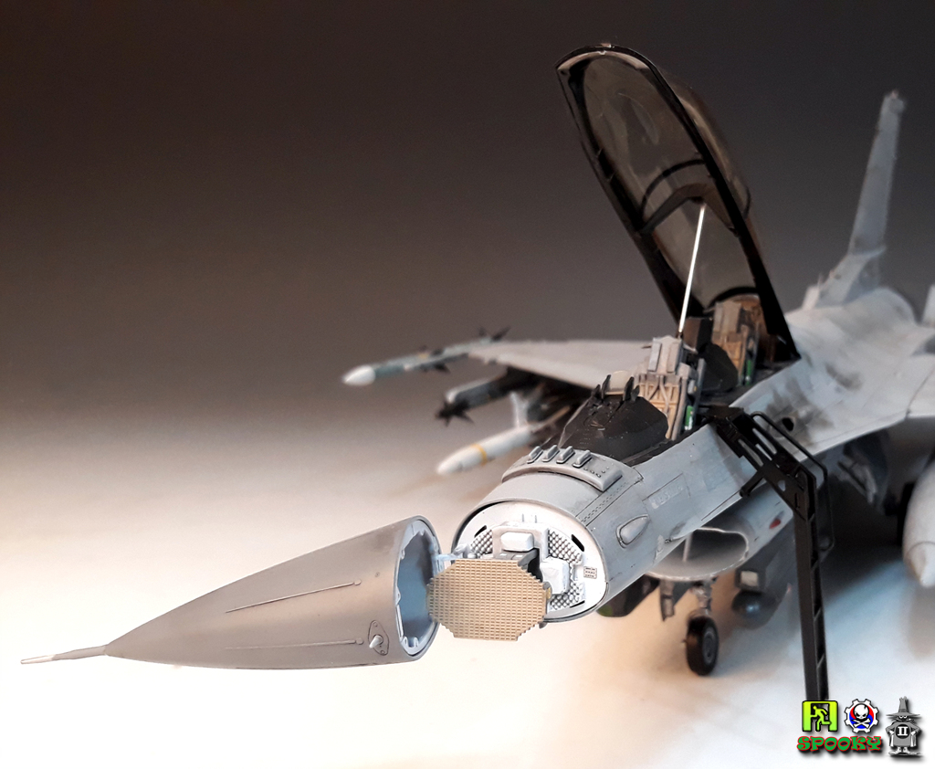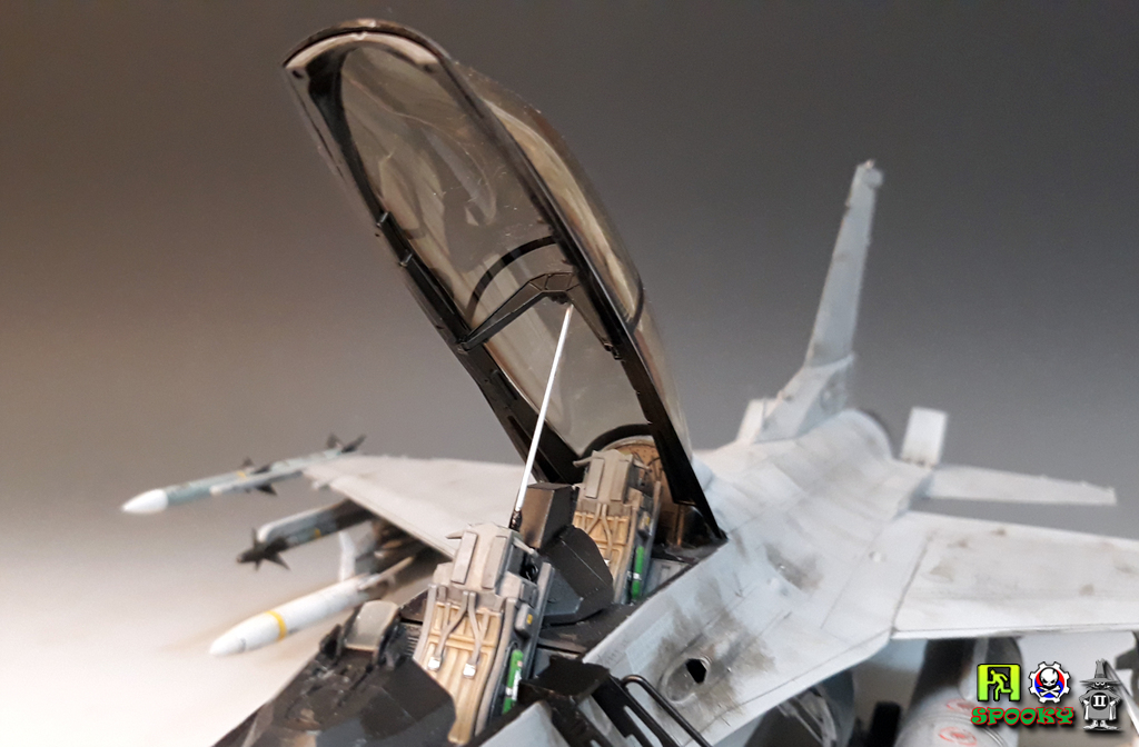 캐노피를 오픈형태로 선택하여 작업할때는 후방석 조종사가 탑승하기 위해 오픈 각도를 고려해 황동봉 등으로 부품을 연장해줘야 합니다.