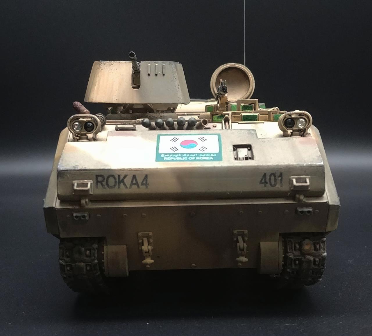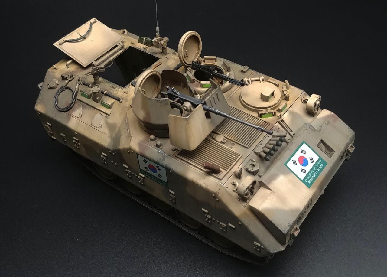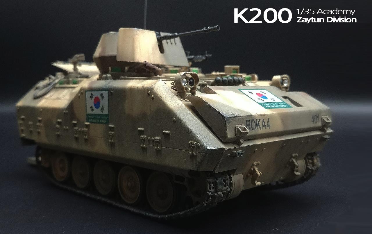 군시절에 두꺼비로 불리던 녀석 실제로도 떨어지는 성능에 탑승자들의 애환이 담겨있고 모형으로도 저렴하고 예쁘지만 만들어 놓으면 험비만 해서 주목도 받기도 힘든 그런 키트 이지만 이당시에는 정보도 그리 많지 않고 했던 시기여서 그저 한국군 장비가 나왔다는데 의미가 크던 시절이라 발매된 K200은 거의 축복이었습니다만 세월에 장사 없더군요 현재 시점으로 보니 오류도 많고 하얀색 플라스틱 재질도 적응 안되고 하지만 이렇게 완성하니 그때 그기분이 기억나네요.