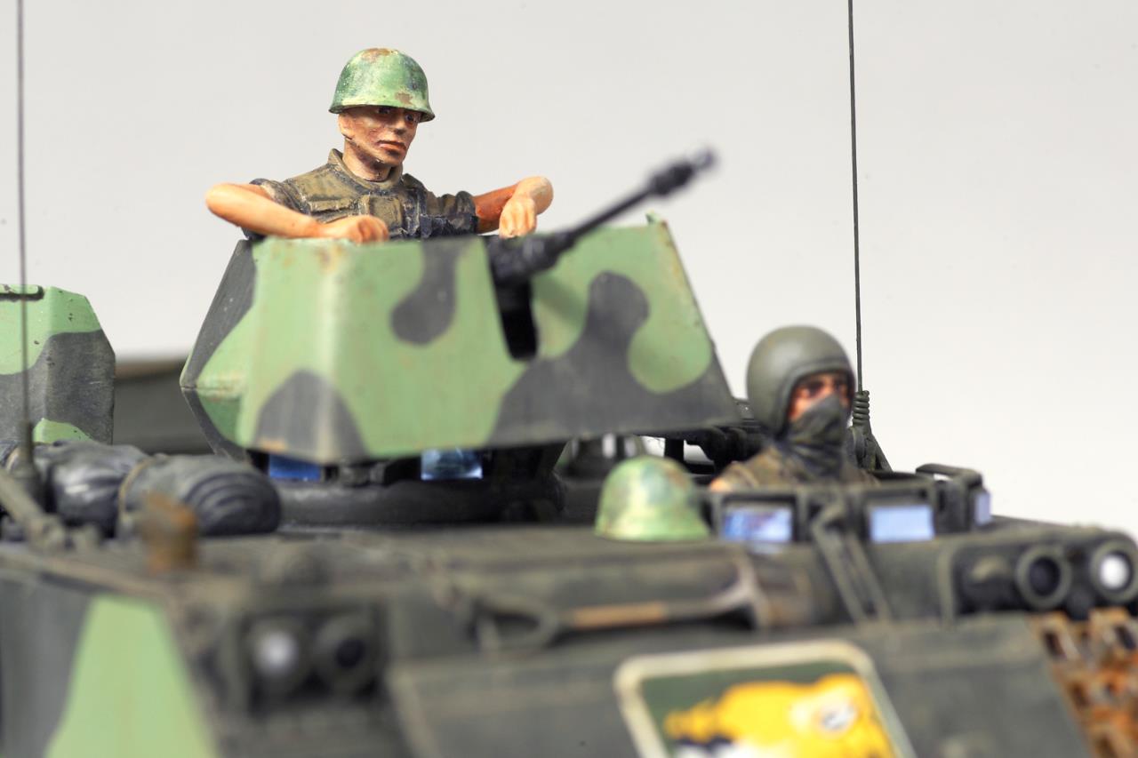 안녕하세요. 아카데미 M113A1 입니다. 맹호부대 도장으로 만드려고 하다가 아카데미 작례의 맹호부대 도장이 왠지 맘에 안들어 자료사진을 찾아 봤더니 못보던 위장 무늬가 있더군요. 후기의 차량인지 미군의 방탄총탑의 모델을 사용하고 있었습니다. 별개조 없이 미군형으로 만들어 사진과 최대한 비슷하게 만들려고 했는데 고증과 다른 부분은 있을거라 미리 말씀 드립니다. 타미야 아크릴 올리브 드랍을 기본바탕으로 하고 조색을 해서 위장무늬를 칠했습니다. 웨더링은 미그 워시 도료 적용후 미그이펙트로 에어브러쉬와 붓도색으로 해주었습니다. 피규어가 마땅한 한국군이 없어서 킷의 미군을 그대로 태워줬는데 한국군처럼 보이지가 않네요. ㅜㅜ