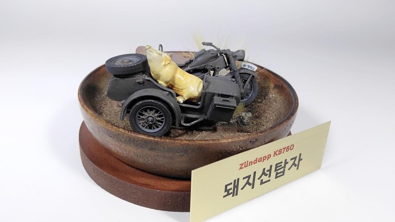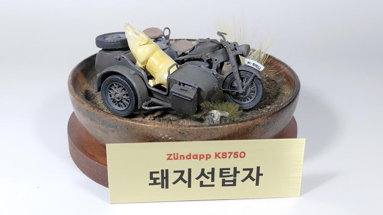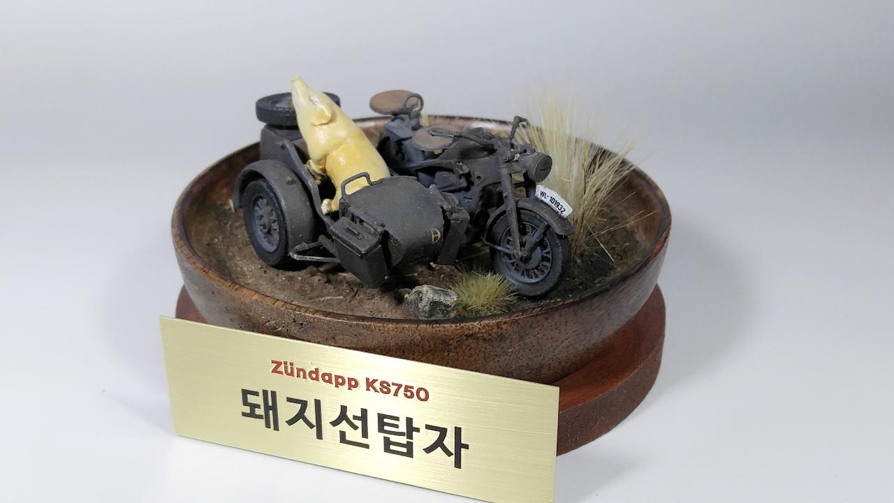 이 작품은 기본적으로는 이탈레리 제품이며, 인형이 너무나 조약하여 아예 제거하고 준다프 KS750만으로 구성하려고 했습니다. 그런데 너무 썰렁하기에 결국은 찬조출연으로 즈베즈다 제품의 BMW 사이드카에 돼지 하나를 추가하기로 결정했습니다. 제가 가끔 엉뚱한 생각을 해보고, 실제 적용하는 경우가 있는데... 이번 경우가 바로 그 예입니다.