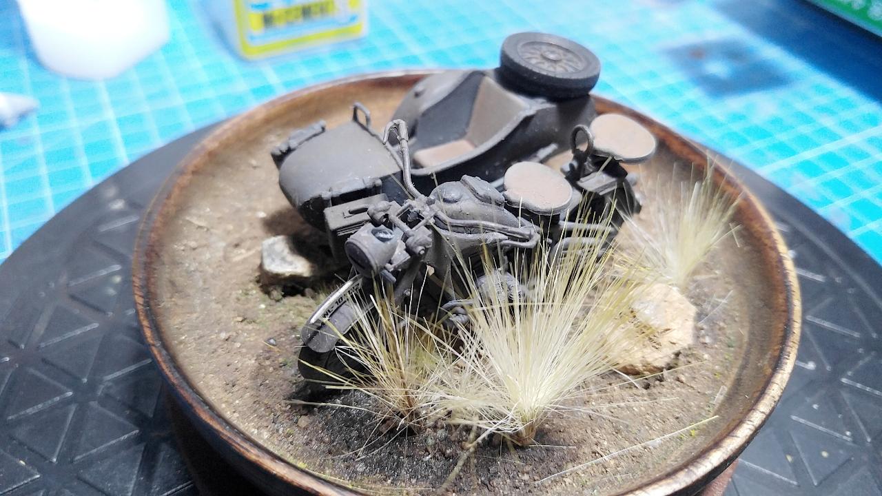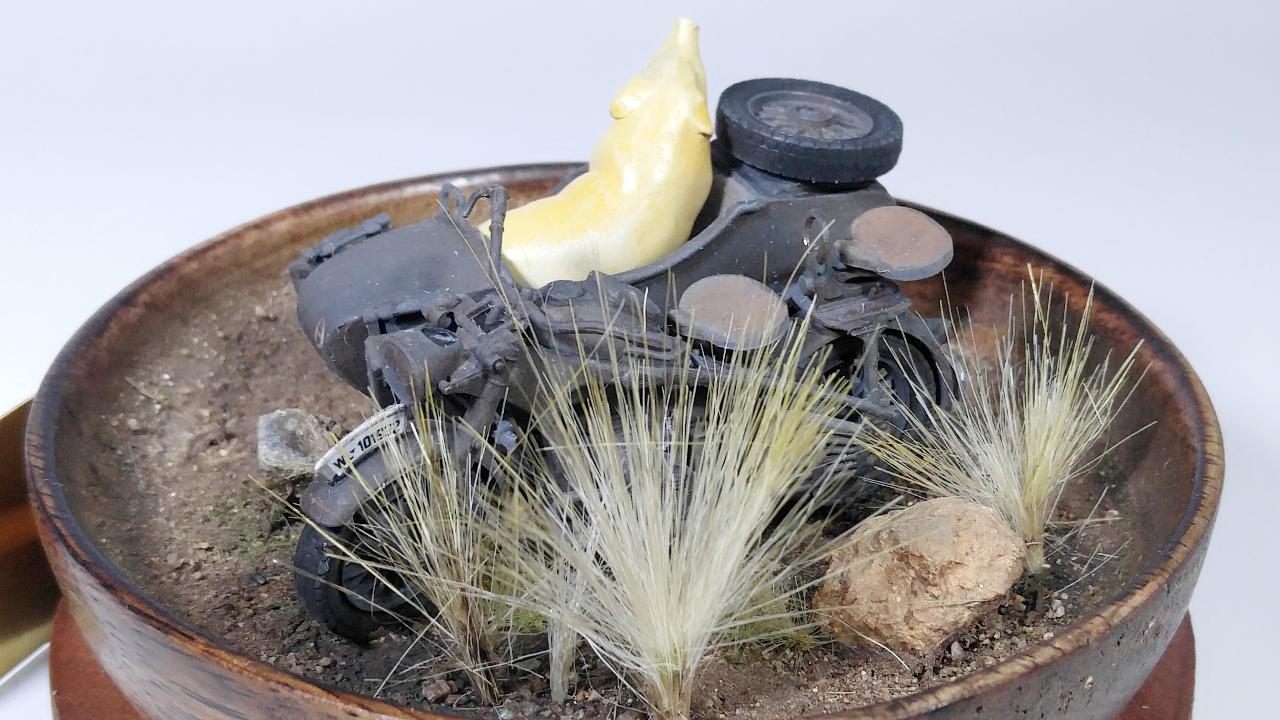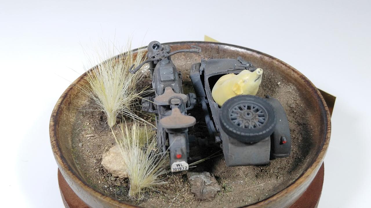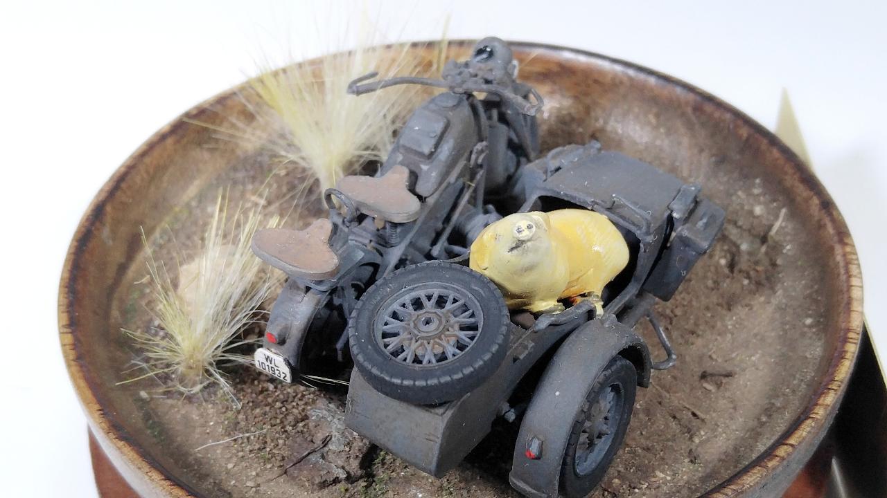 이 작품은 기본적으로는 이탈레리 제품이며, 인형이 너무나 조약하여 아예 제거하고 준다프 KS750만으로 구성하려고 했습니다. 그런데 너무 썰렁하기에 결국은 찬조출연으로 즈베즈다 제품의 BMW 사이드카에 돼지 하나를 추가하기로 결정했습니다. 제가 가끔 엉뚱한 생각을 해보고, 실제 적용하는 경우가 있는데... 이번 경우가 바로 그 예입니다.