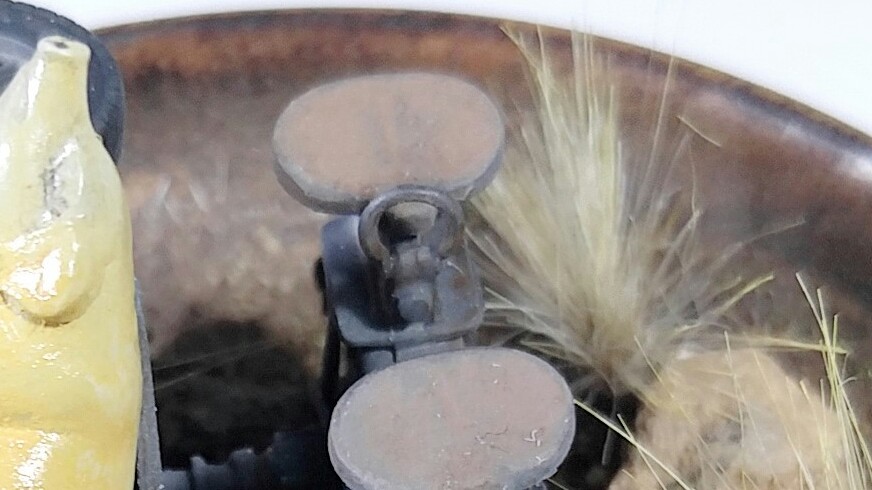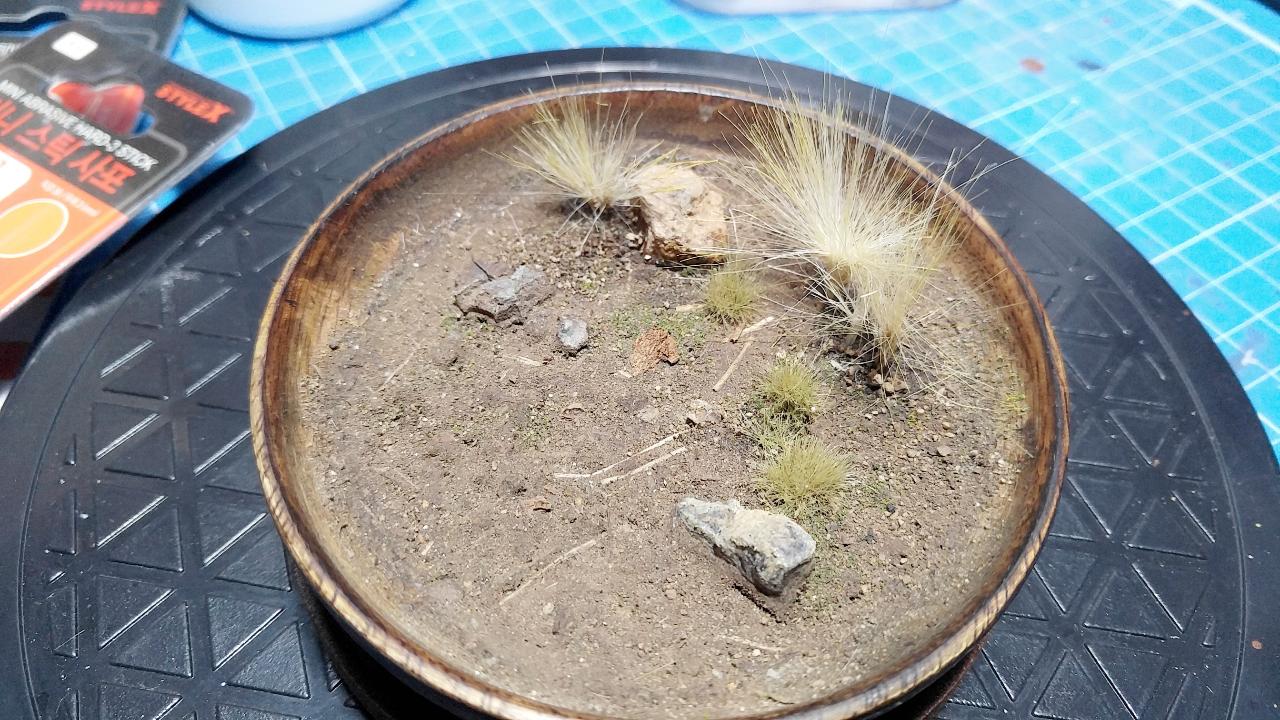 바닥에 목공풀과 물을 희석하고, 실제 돌들과 모래를 넣어주어 말립니다. 약간의 열을 서서히 가해주면 목공풀이 빨리 마릅니다. 이후 풀을 심어줄 곳에 핀바이스로 구멍을 뚫어주고, 페인트붓을 잘라서 심어주고, 이발소에서 세발하듯이 다듬어줍니다. 그 위에 작은 풀들을 부착해주고, 유럽의 토양 관련 용품들을 발라주고, 돌들도 웨더링을 좀 해줍니다.