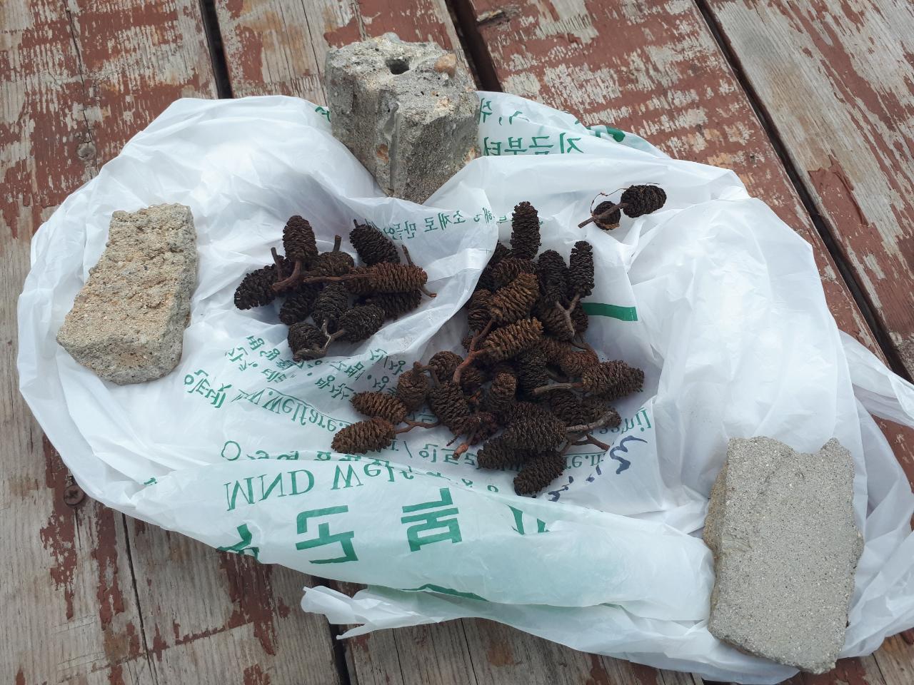 낙옆은 무슨 솔방울이였던가 하여튼 매추리알 만한게 있는데 그것을 건조, 파쇄하여 사용하였습니다. 자연물은 자연물을 사용해야 자연스럽습니다.