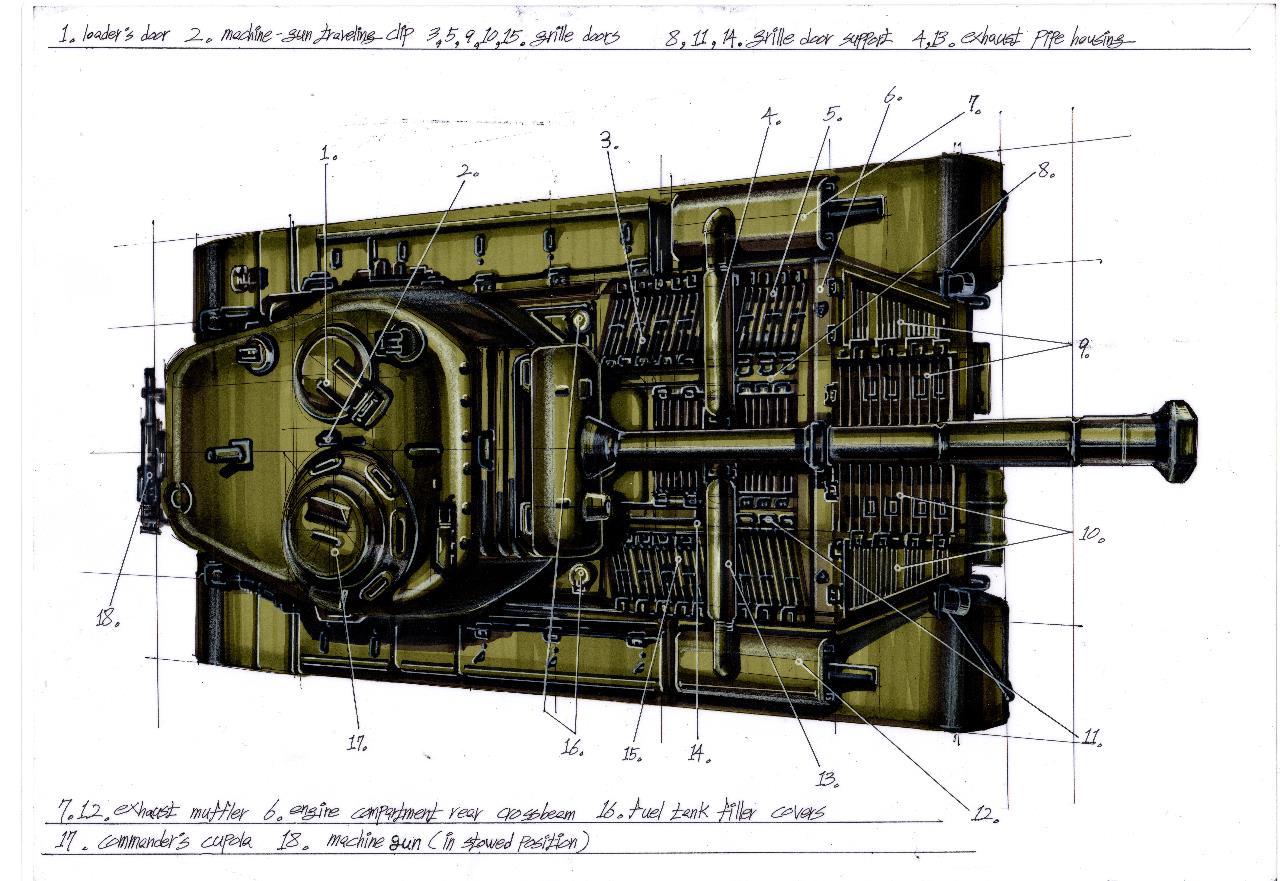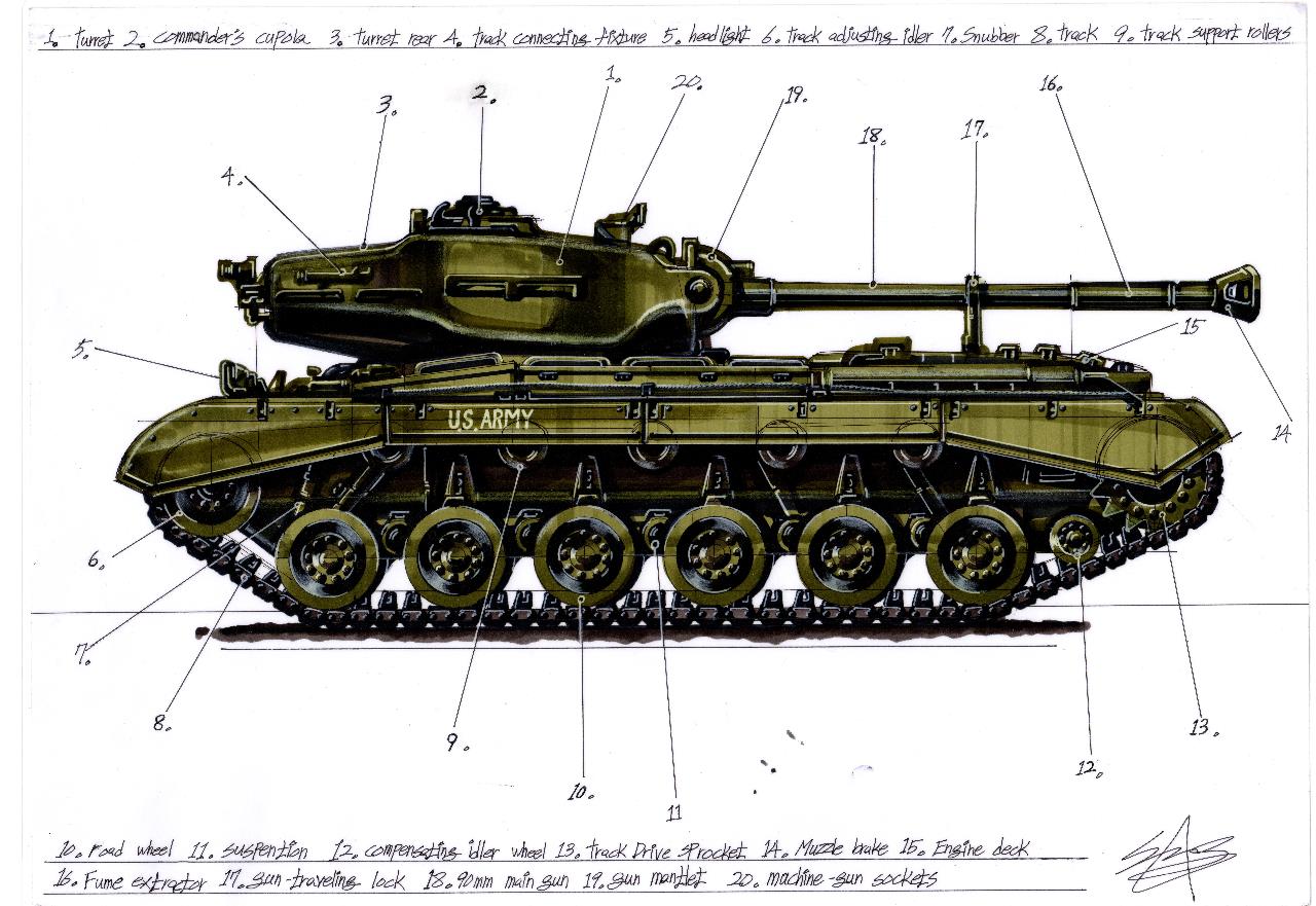 m46전차의 사이드 뷰 설명 스케치 입니다. 마카로 깔끔하게 정리해 줍니다.