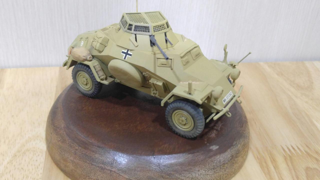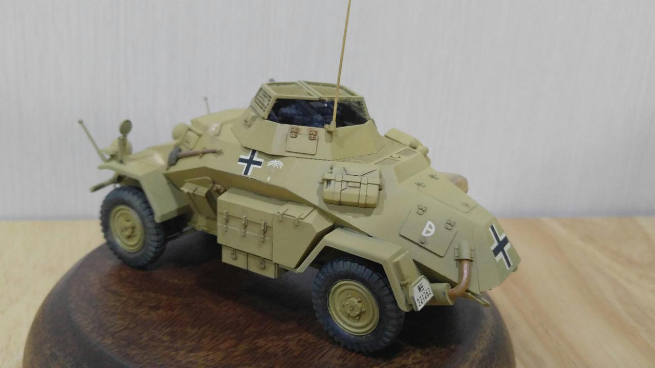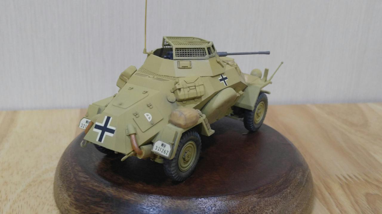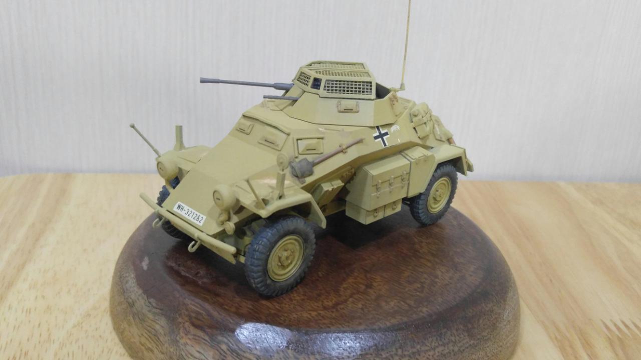 제품은 타미야 35 스케일 Sd.Kfz.222이며, 메탈 포신과 포탑 윗쪽의 메쉬가 포함되지 않은 예전 버전입니다. 도색은 DAK 버전으로 작업했으며, '하겐크로이츠'는 욱일기와 마찬가지로 아픔과 악의 상징이라 믿으며 과감하게 덧칠해서 없애주었습니다.
