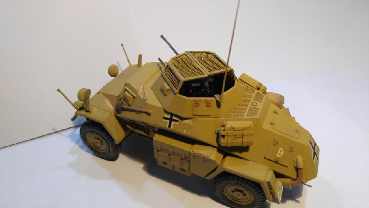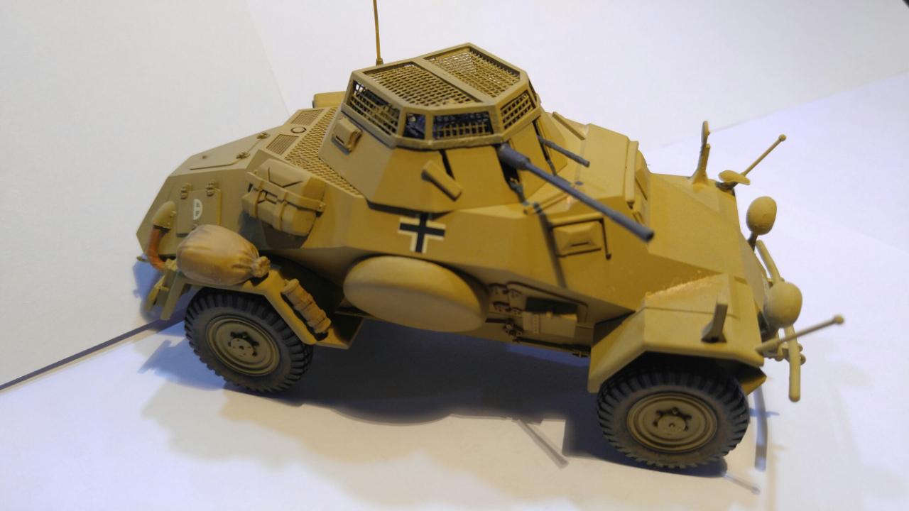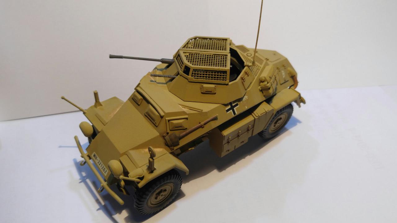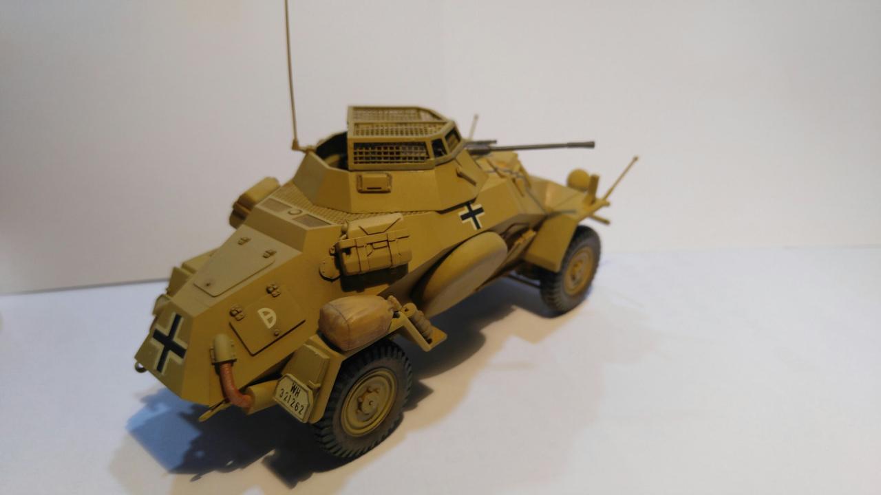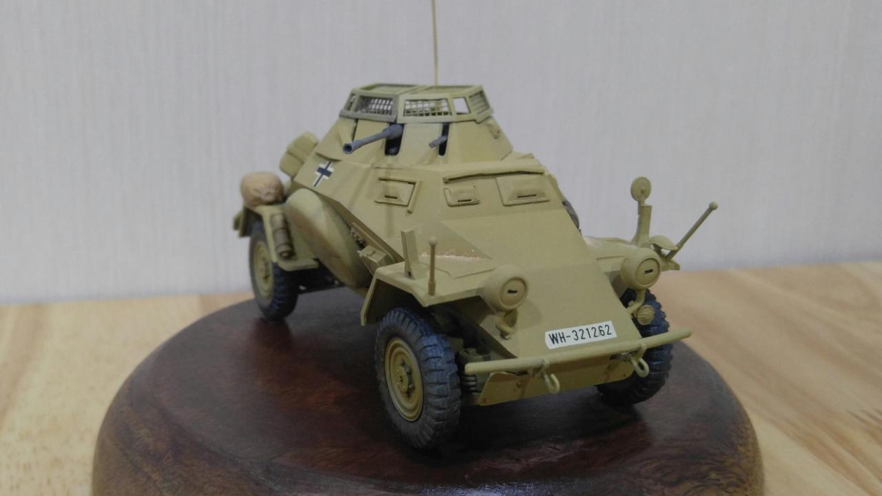 제품은 타미야 35 스케일 Sd.Kfz.222이며, 메탈 포신과 포탑 윗쪽의 메쉬가 포함되지 않은 예전 버전입니다. 도색은 DAK 버전으로 작업했으며, '하겐크로이츠'는 욱일기와 마찬가지로 아픔과 악의 상징이라 믿으며 과감하게 덧칠해서 없애주었습니다.