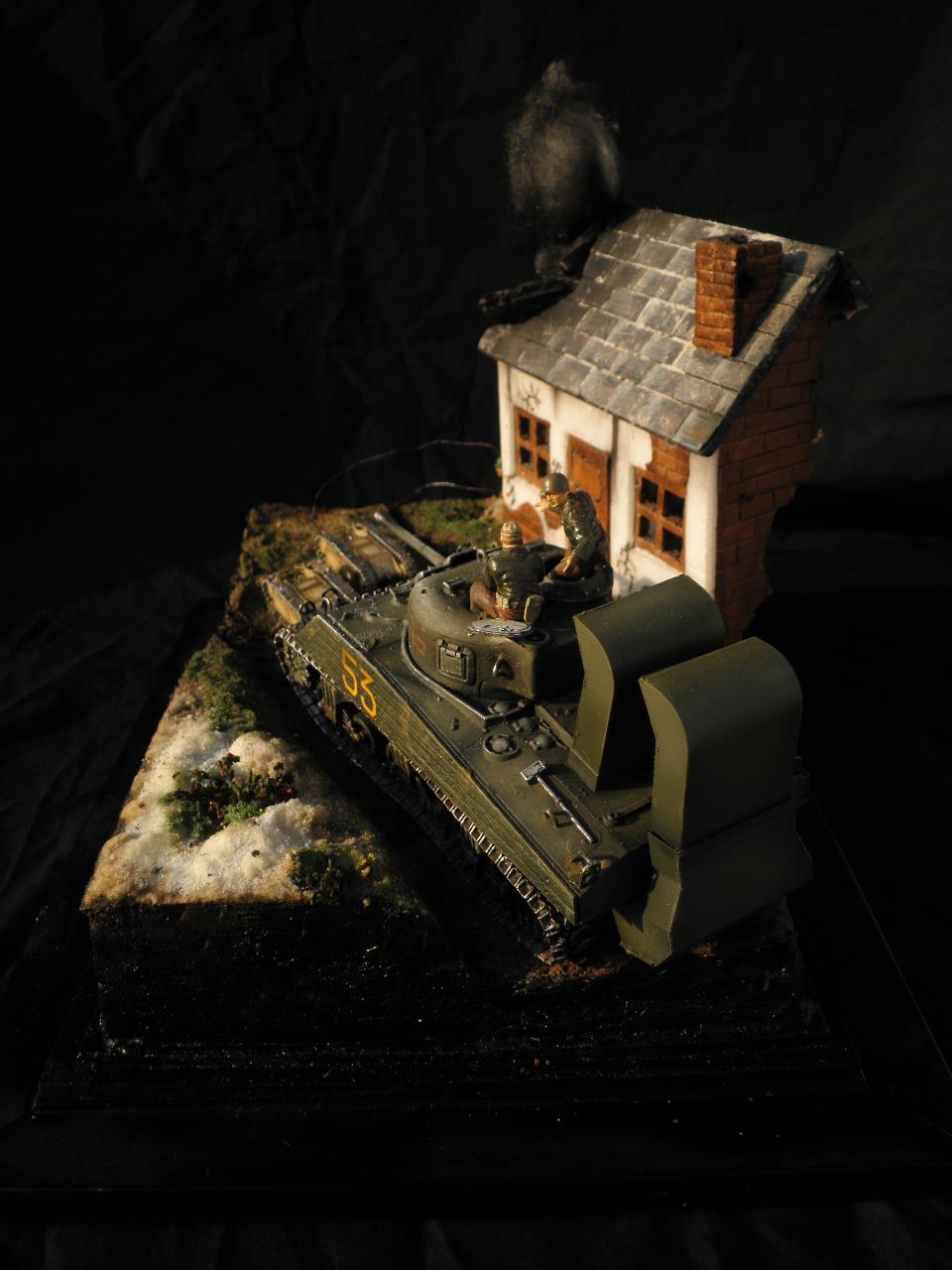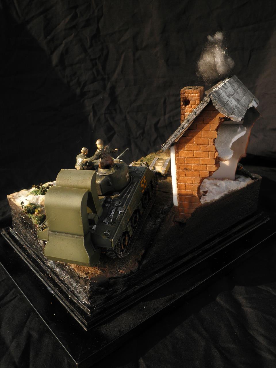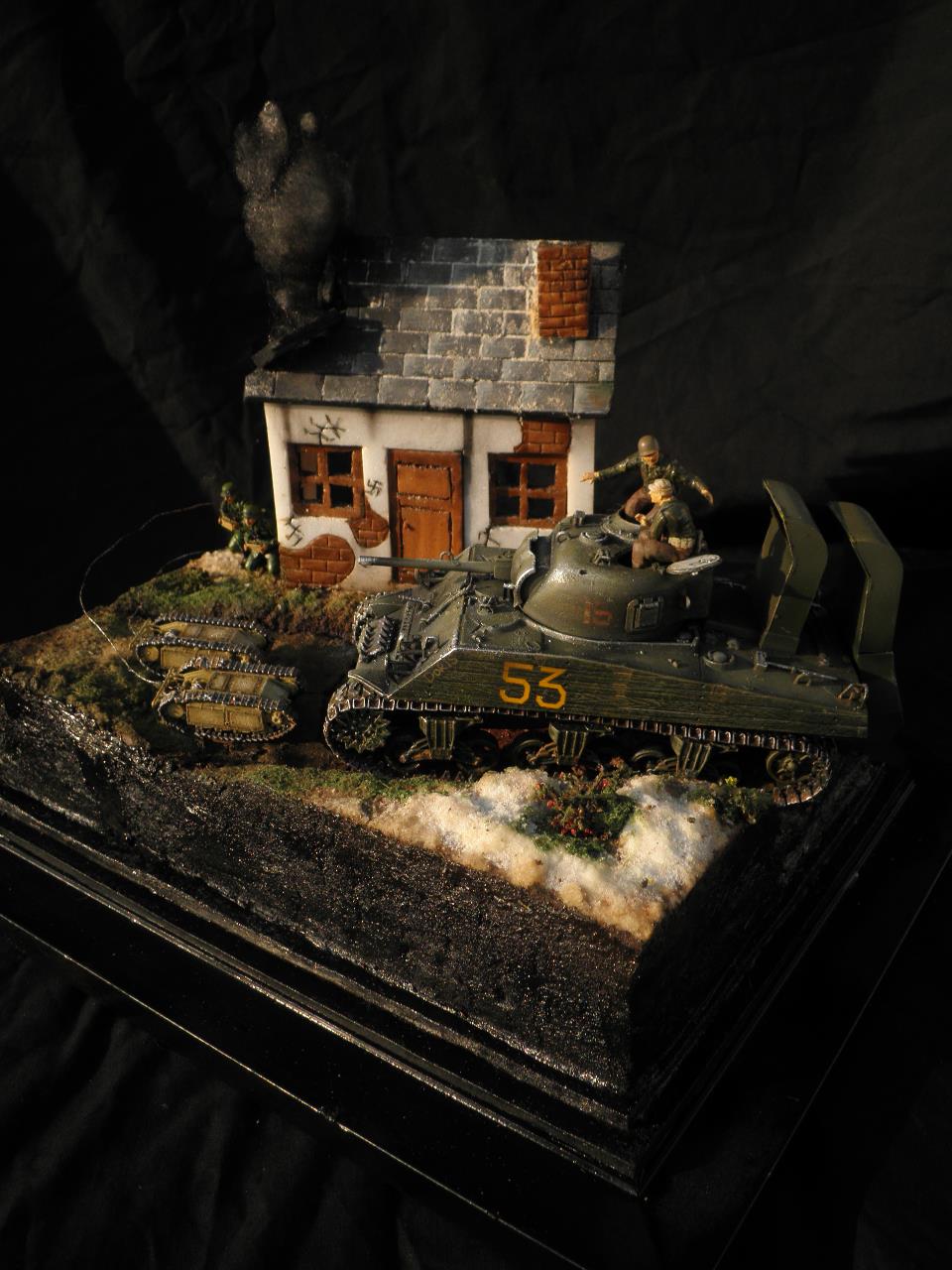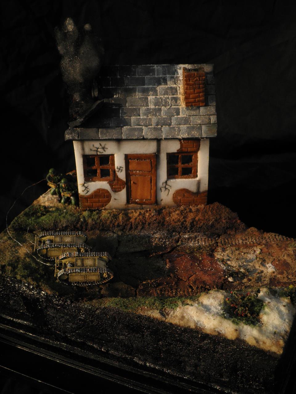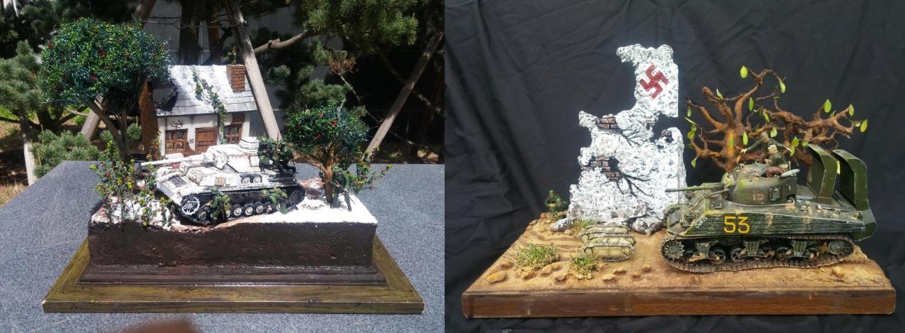 도색은 별거없이 올블랙도색뒤 점점더 밝아지게 에어브러쉬하였습니다.모듈레이션이라기보단 제생각대로 전차의 밝고 어두움을 나타냈습니다.건물은 우드락 자작입니다.새로이 작업한게아닌 이리저리 만들었던것을 짬뽕시켜 퓨전하였습니다.팁 모듈레이션은 카키색 에어브러슁한뒤 흰색을 더섞어 에어브러슁을 해주고 더많은 흰색을 섞어 에어브러쉬해준다 이작업을 계속하면 입체감이나나 자칫 하얗게 될수있다