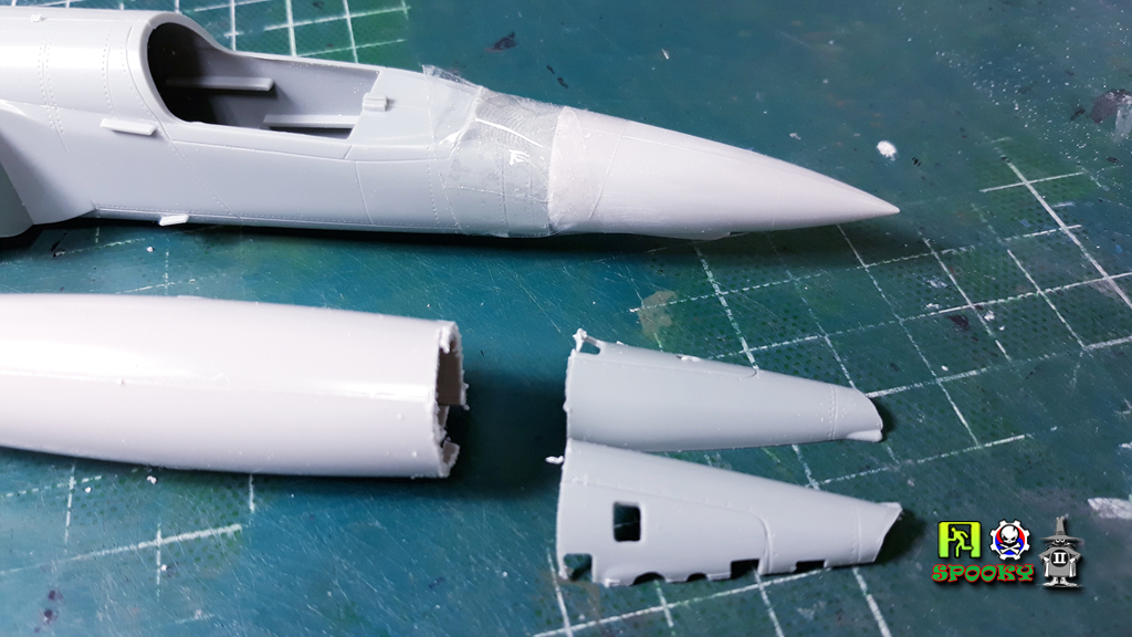 기수에서 정찰카메라가 있는 부분을 떼어내고 하세가와 1/48 연료통을 잘라 이식해줍니다.