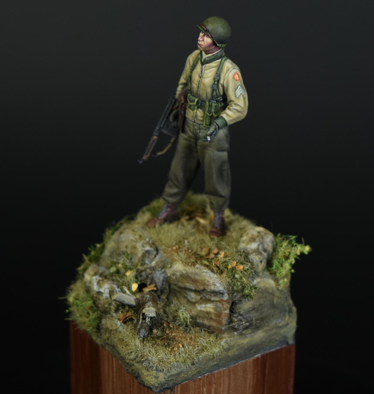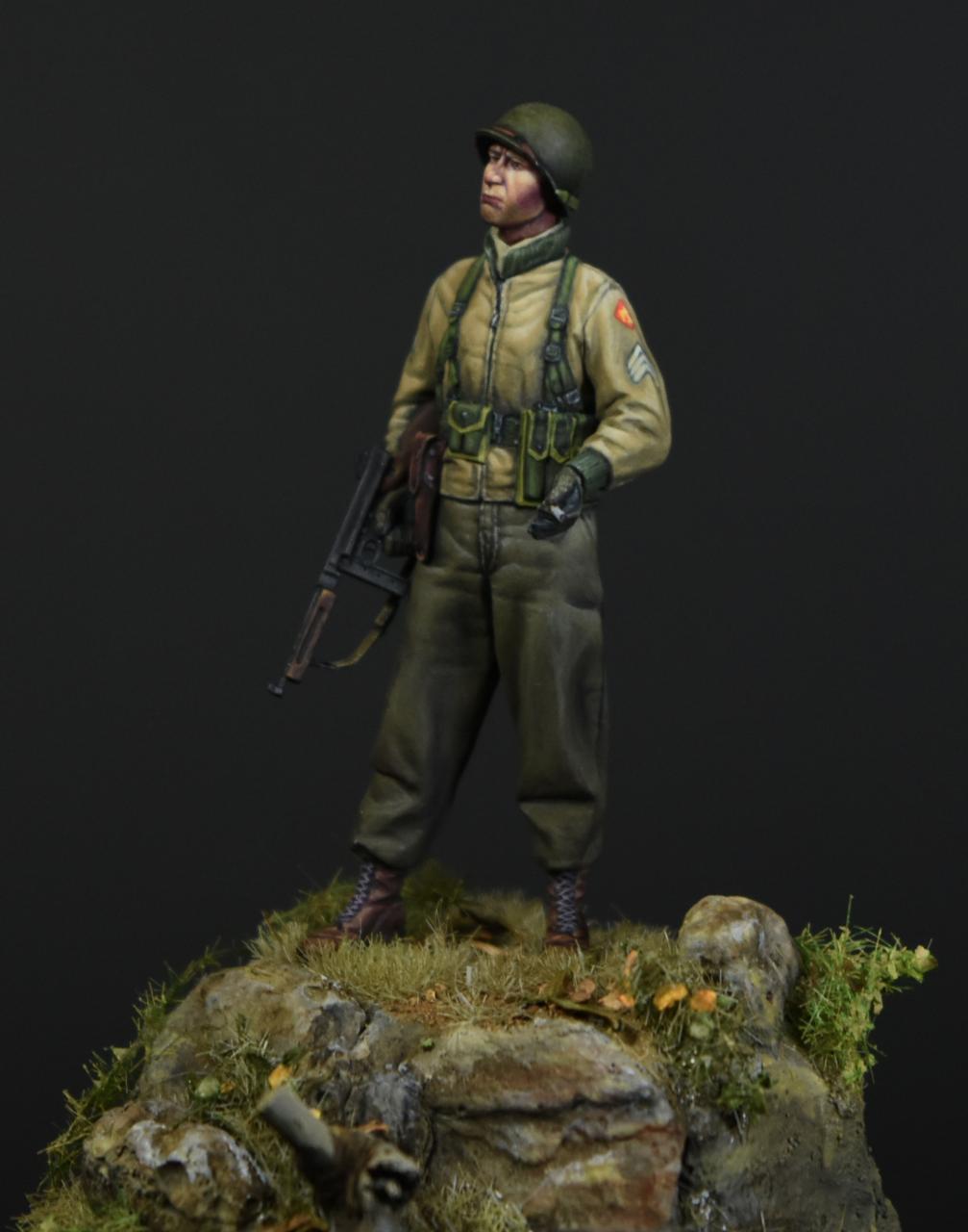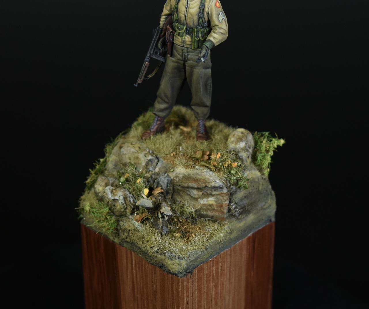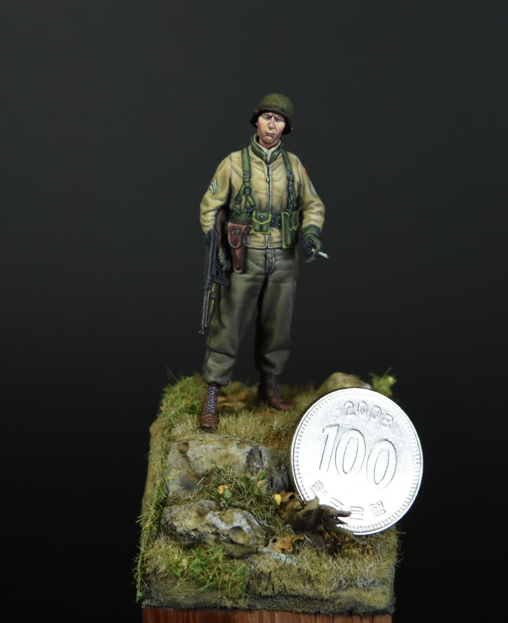 알파인 1/35 미군 부사관인형으로 작은 비넷을 만들어 보았습니다, 사단마크는 데칼을 이용하였고 나머지는 바예호아크릴과 스케일75아크릴을 사용하여 도색하였고 ,패션모델 에칭으로 톰슨기관총 멜방을 만들어 주었습니다. 배경은 1944년 11월경의 프랑스이고 역전의 사단중의 하나인 45보병사단 부사관으로 표현해 보았습니다.(한국전쟁에도 종군한 사단이고 이차대전중에는 시칠리아,이탈리아,프랑스,독일등에서 종군하였습니다)