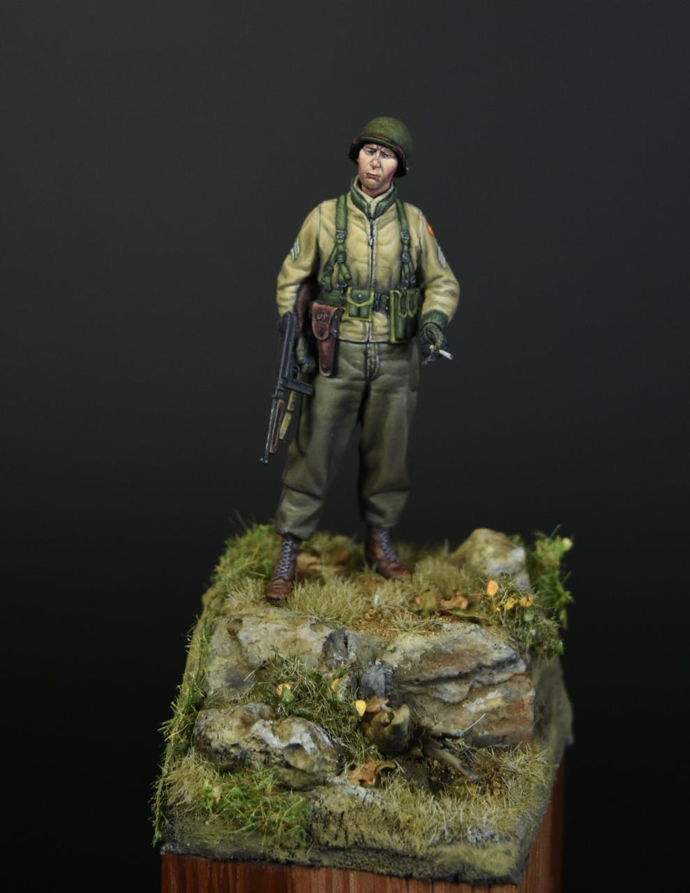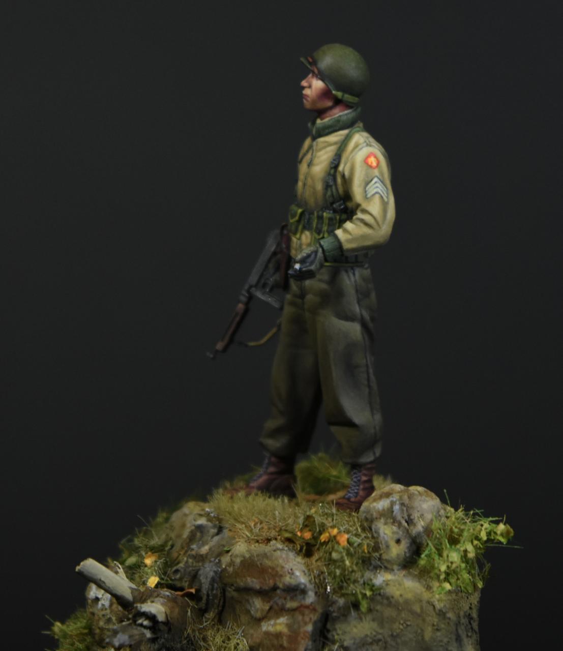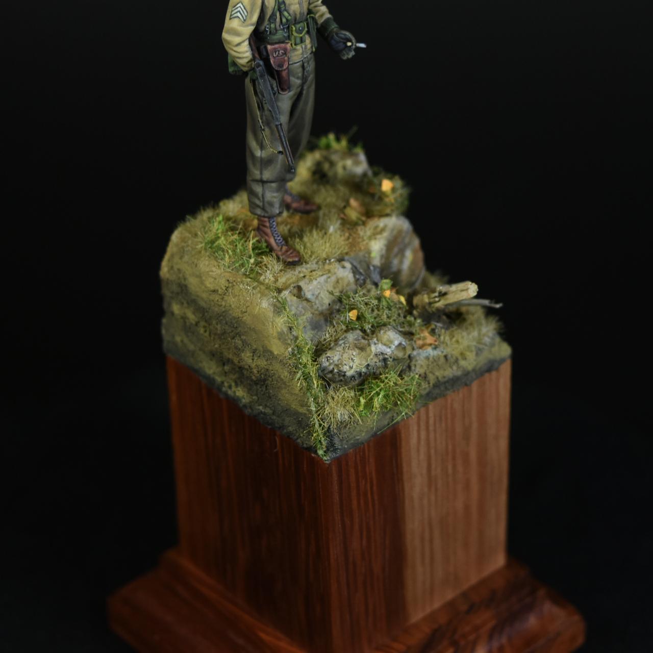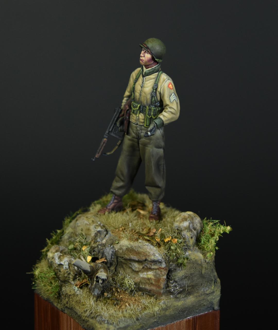 알파인 1/35 미군 부사관인형으로 작은 비넷을 만들어 보았습니다, 사단마크는 데칼을 이용하였고 나머지는 바예호아크릴과 스케일75아크릴을 사용하여 도색하였고 ,패션모델 에칭으로 톰슨기관총 멜방을 만들어 주었습니다. 배경은 1944년 11월경의 프랑스이고 역전의 사단중의 하나인 45보병사단 부사관으로 표현해 보았습니다.(한국전쟁에도 종군한 사단이고 이차대전중에는 시칠리아,이탈리아,프랑스,독일등에서 종군하였습니다)