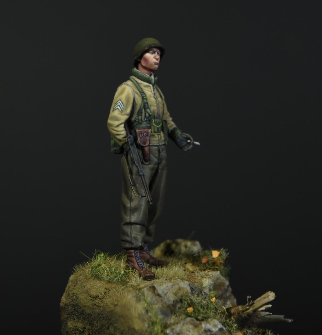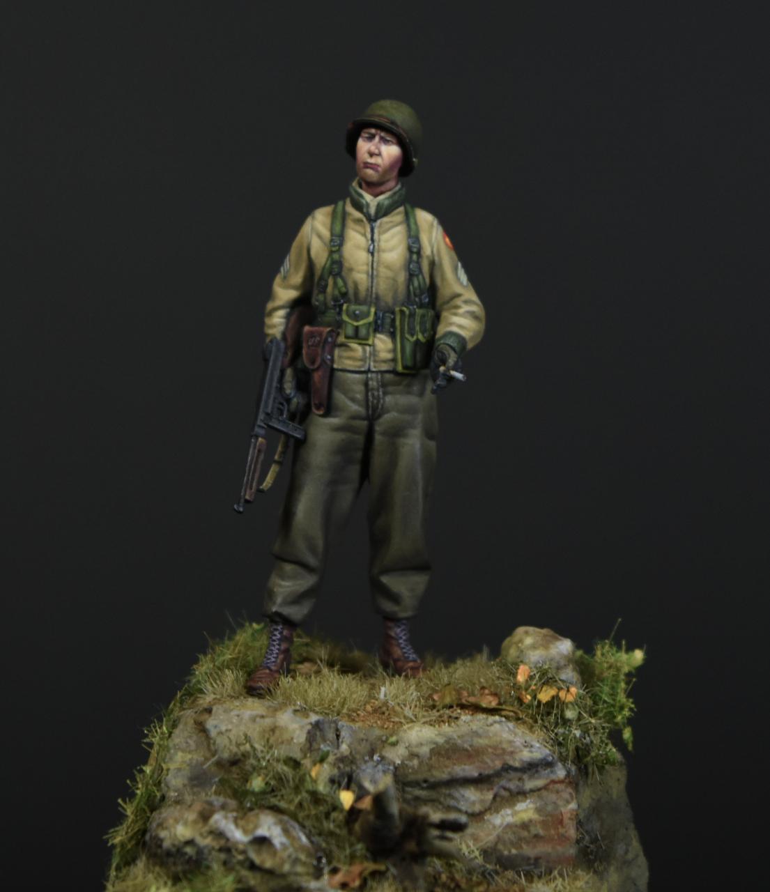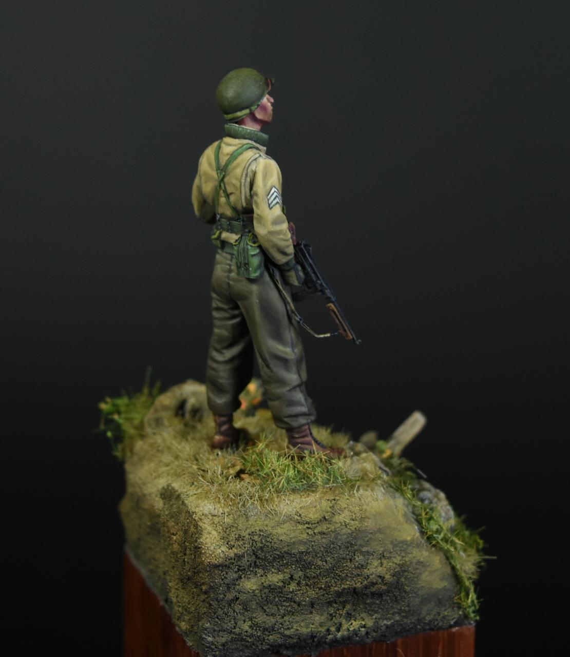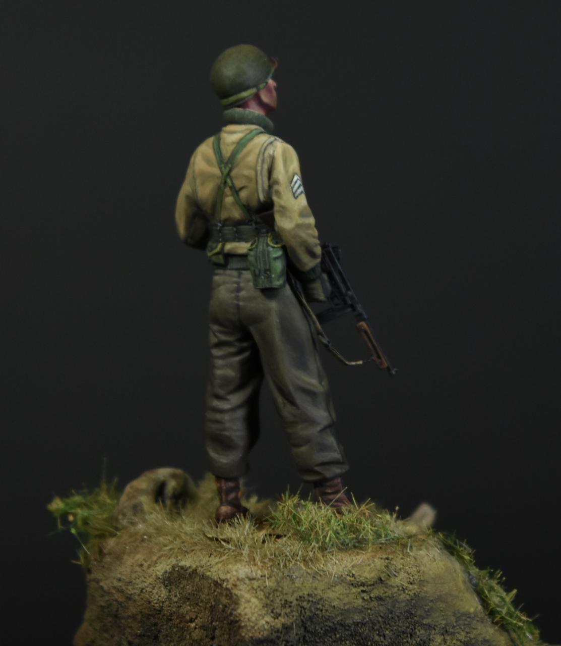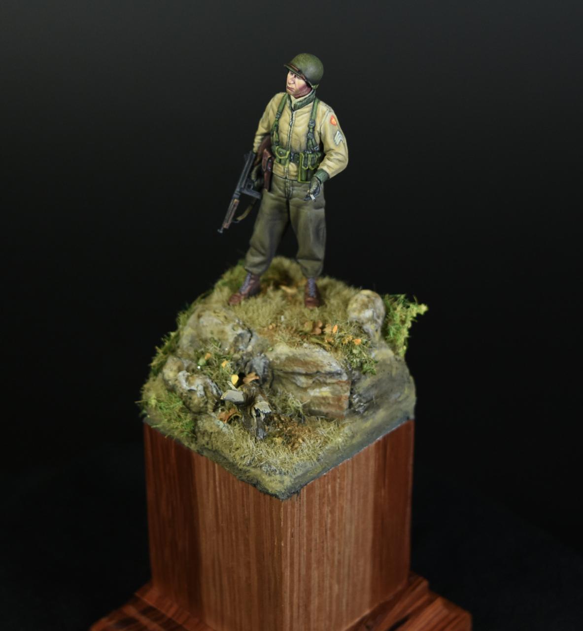 알파인 1/35 미군 부사관인형으로 작은 비넷을 만들어 보았습니다, 사단마크는 데칼을 이용하였고 나머지는 바예호아크릴과 스케일75아크릴을 사용하여 도색하였고 ,패션모델 에칭으로 톰슨기관총 멜방을 만들어 주었습니다. 배경은 1944년 11월경의 프랑스이고 역전의 사단중의 하나인 45보병사단 부사관으로 표현해 보았습니다.(한국전쟁에도 종군한 사단이고 이차대전중에는 시칠리아,이탈리아,프랑스,독일등에서 종군하였습니다)