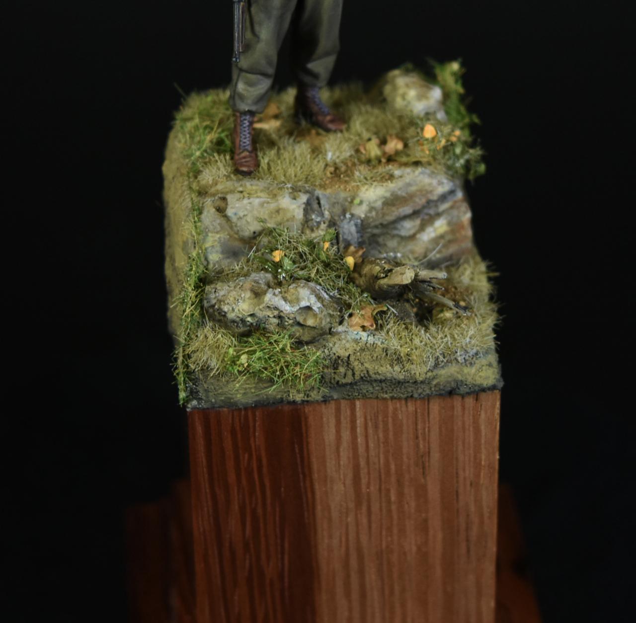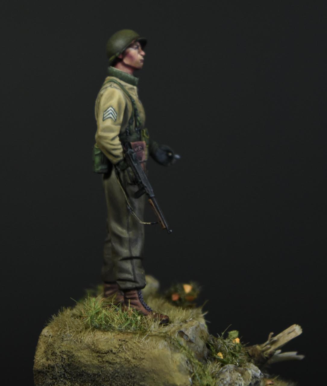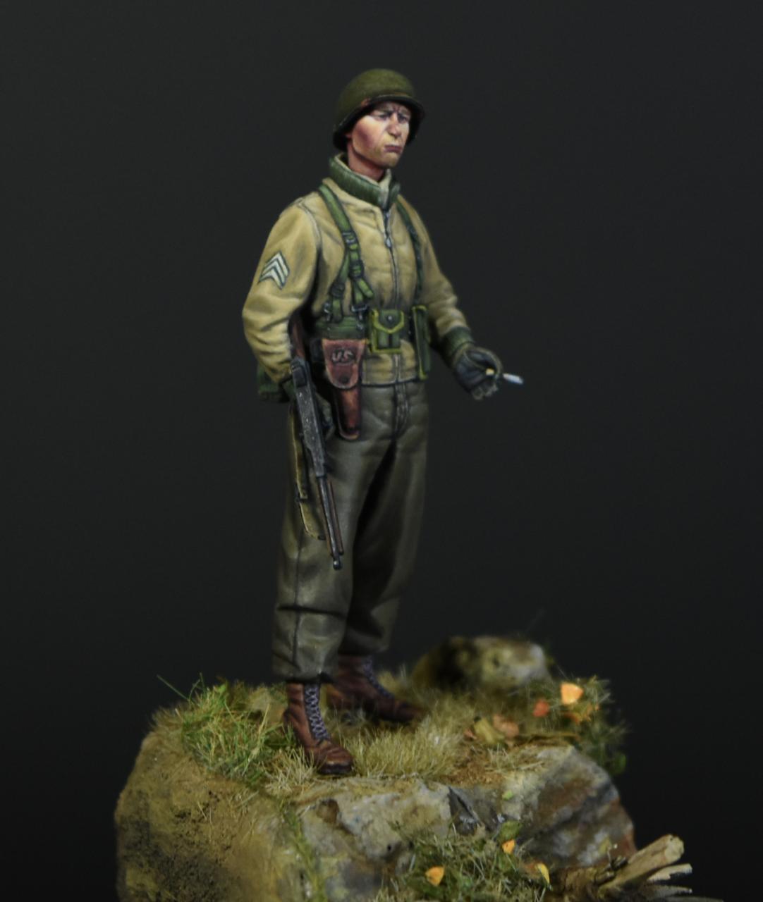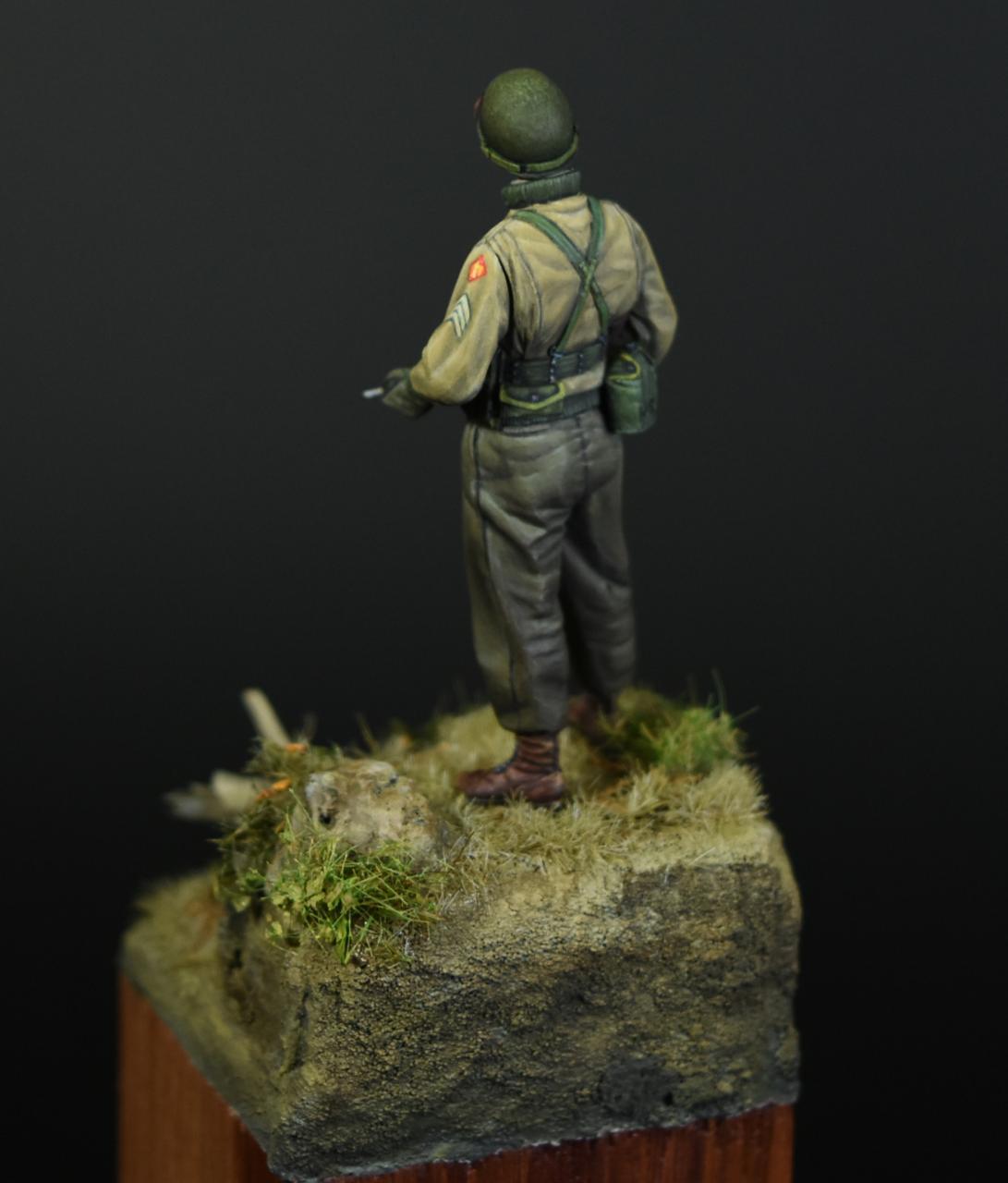 알파인 1/35 미군 부사관인형으로 작은 비넷을 만들어 보았습니다, 사단마크는 데칼을 이용하였고 나머지는 바예호아크릴과 스케일75아크릴을 사용하여 도색하였고 ,패션모델 에칭으로 톰슨기관총 멜방을 만들어 주었습니다. 배경은 1944년 11월경의 프랑스이고 역전의 사단중의 하나인 45보병사단 부사관으로 표현해 보았습니다.(한국전쟁에도 종군한 사단이고 이차대전중에는 시칠리아,이탈리아,프랑스,독일등에서 종군하였습니다)
