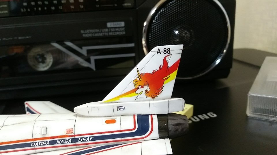 이 기체는 애니메이션에는 등장하지 않고 코믹스판에 신 카자마가 에어리어88에 다시 복귀할때 탑승한 기체입니다. 기체의 활약은 그리 많지 않은 편이지만 참으로 고맙게도 유니콘 데칼을 F-20에서 얻을 수 있어 이렇게 만들어 보았습니다. 하세가와의 일반판 X-29에 유니콘 데칼만 사용한 것이라 완벽하지 않습니다. 거기다가 실수로 수직꼬리 날개 파란색은 빠뜨려서 ....