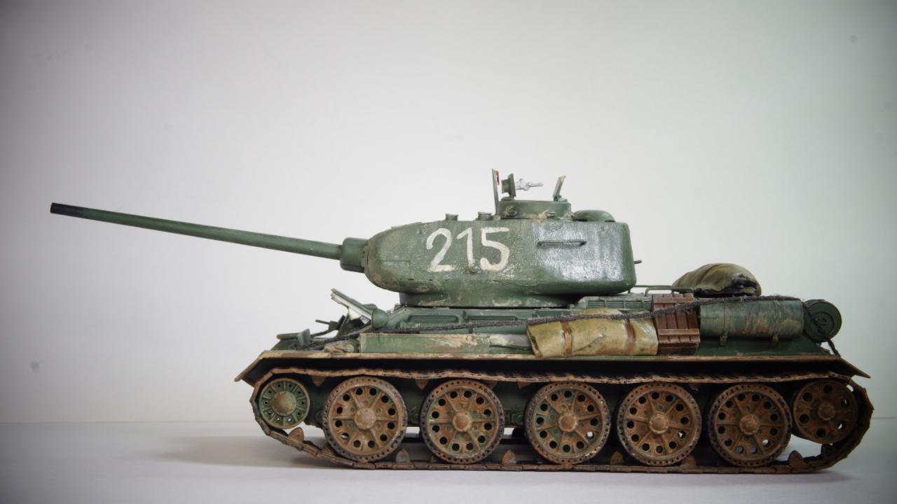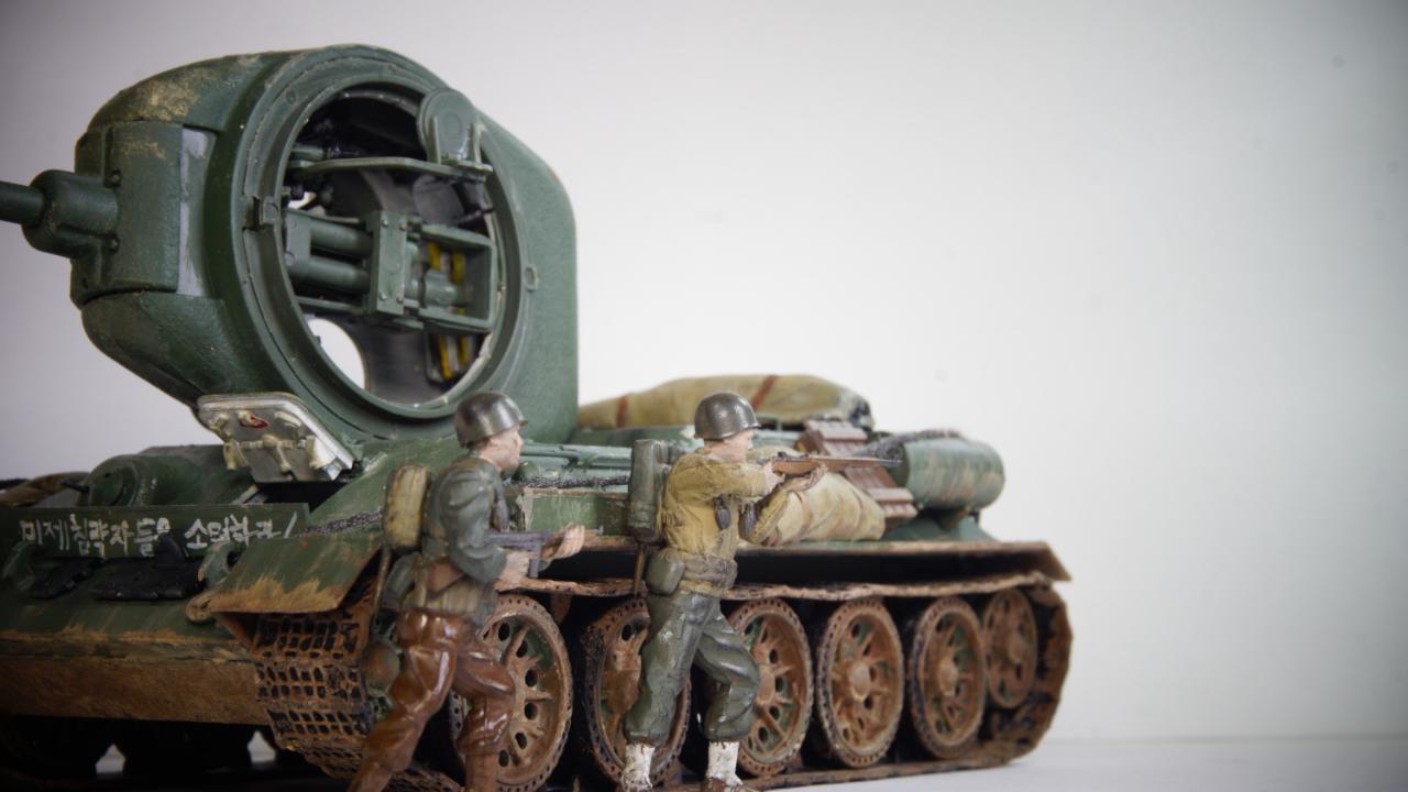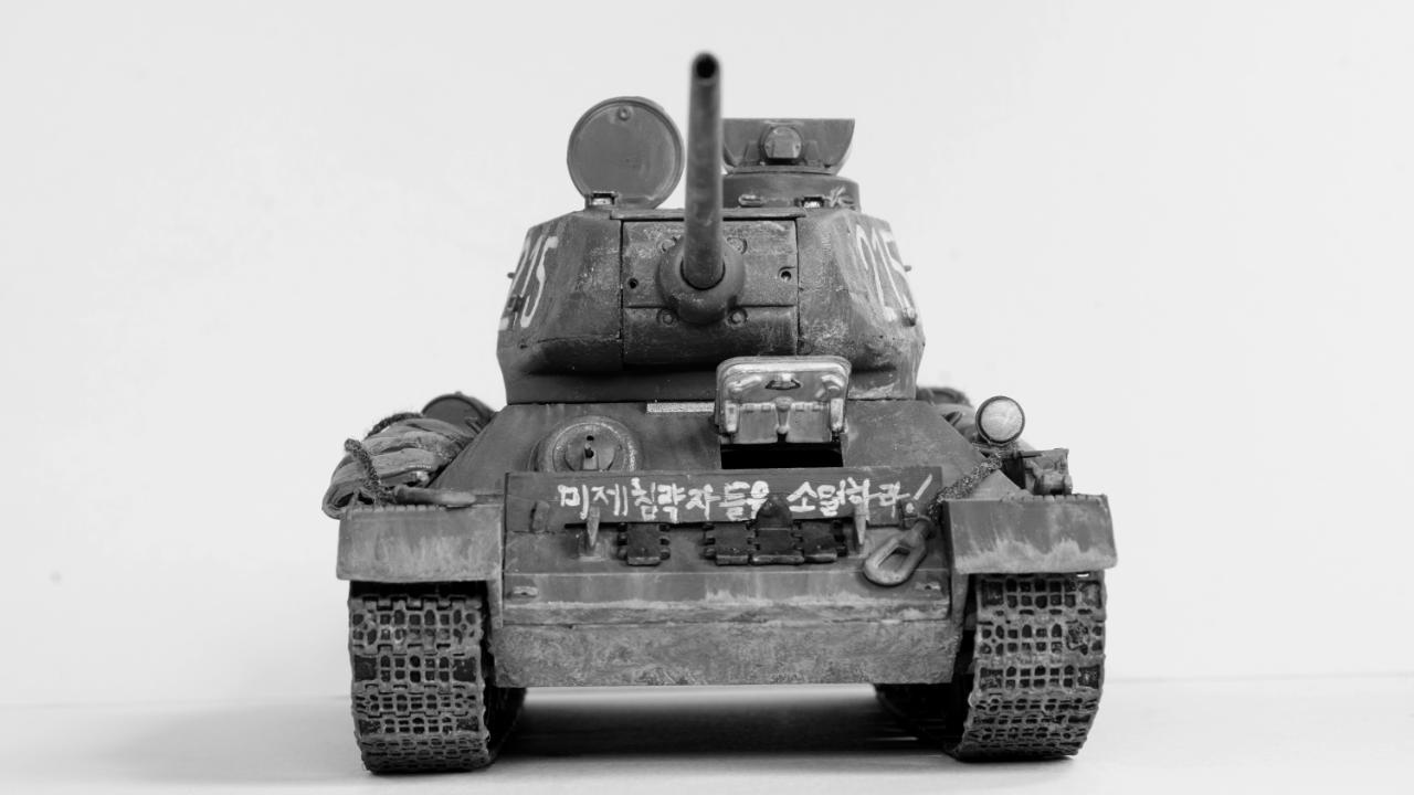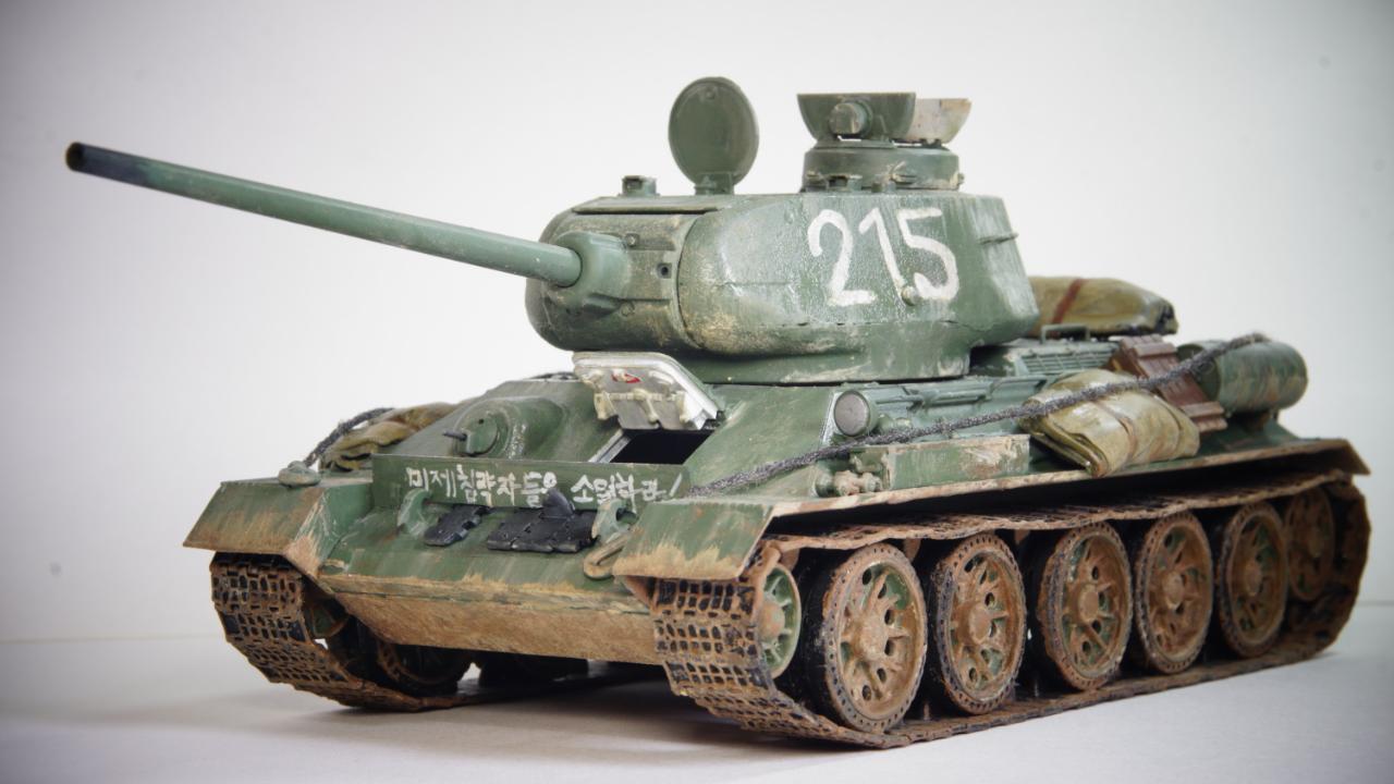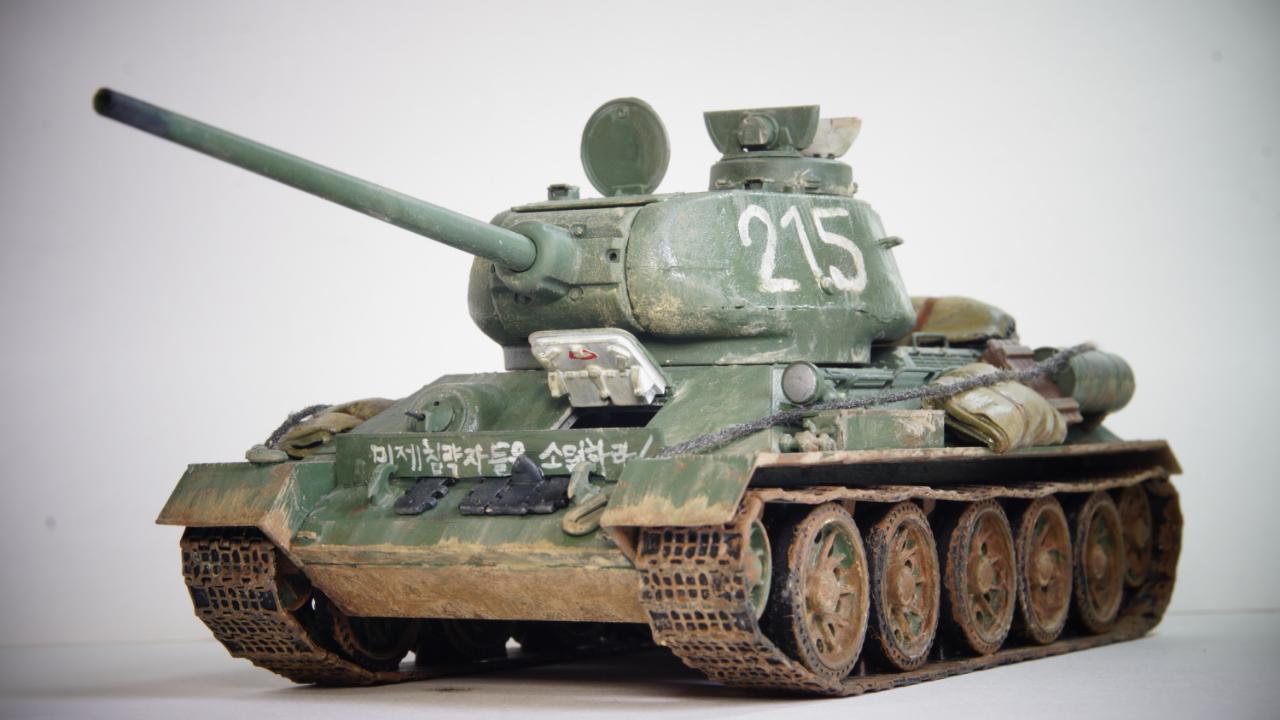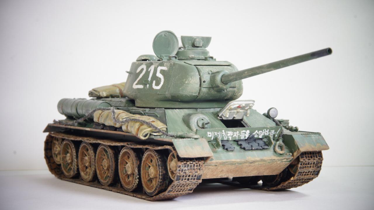 "서울 도심에 들어온 215호 112 공장형 T-34/85가 사진에 찍혔다. 그런데 이상하다. 특유의 반달 해치가 아니고 포탑도 다르다. 초기형이다. 그런데 차체는 흙받이가 부착되어져 있고 앞에 장착된 진흙이 조종수 해치로 들어오는걸 막기위한것으로 보이는 파도막이에 '미제침략자들을 소멸하라!'라는 헛소리가 적혀있다... 전차병은 소련군 전차병. 장전수 빼곤 없는것 같다. 그렇다, 사실 이건 북한에서 홍보용으로 사용하기 위한 애꿎은 2019년에도 남아있는 실제 T-34/85 어르신을 이용한 엉망의 레플리카였다. 당연히 국내외 밀리터리 전문가와 매니아들, 그리고 그 사실을 알고 있는 북한의 몇몇 사람들은 웃음이 멈추질 않았다."