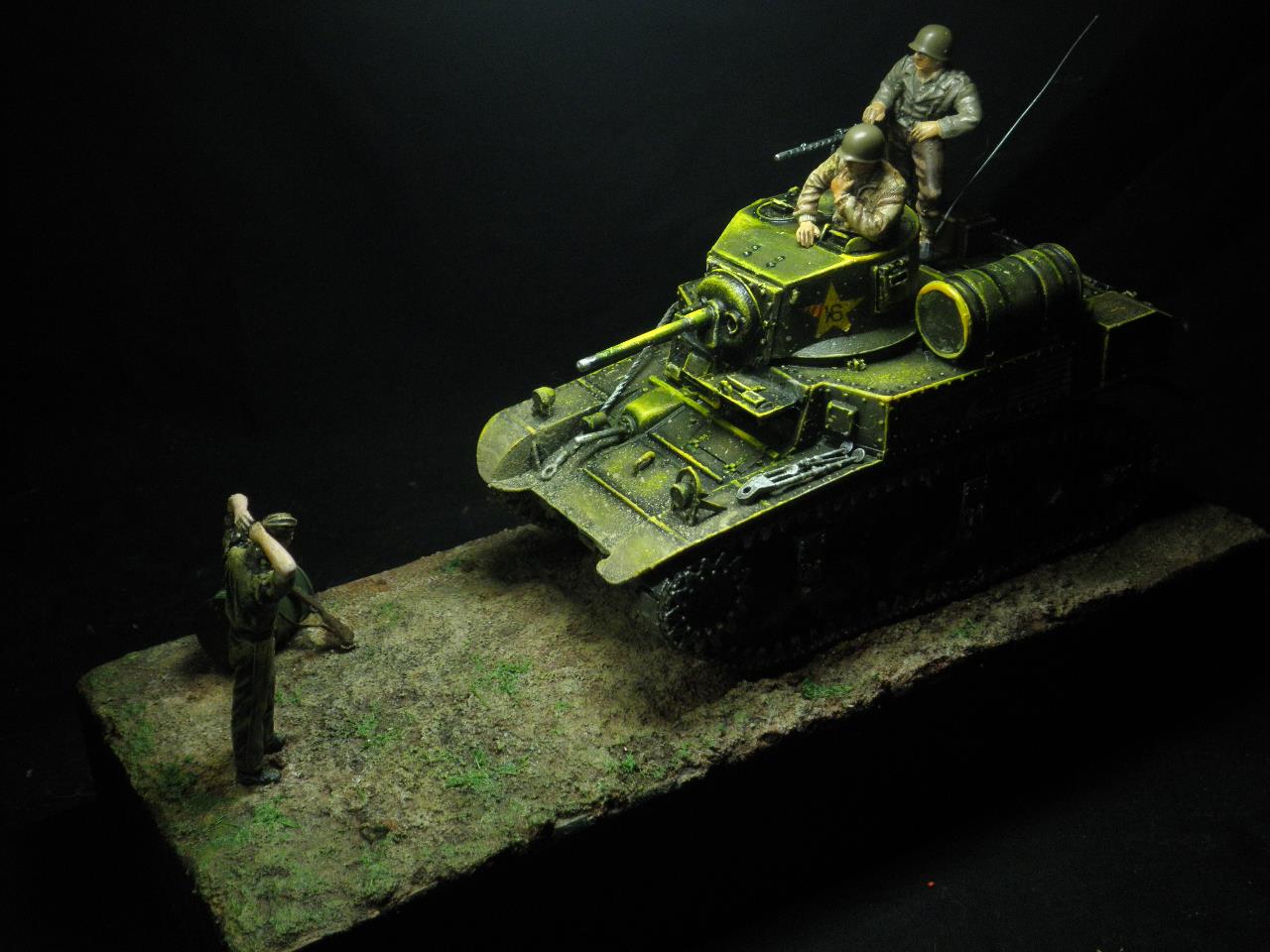 베이스는 나무 토막에 식소다와 목공본드 에나멜물감을섞어 칠한뒤 철물점락카투명으로 코팅뒤에 검은색먹선을 넣은뒤 밝은계열로 드라이 브러쉬 하였습니다.전차의 하이라이트를 강하게 주기위해 노란색 원색을 모서리에 칠하였습니다.