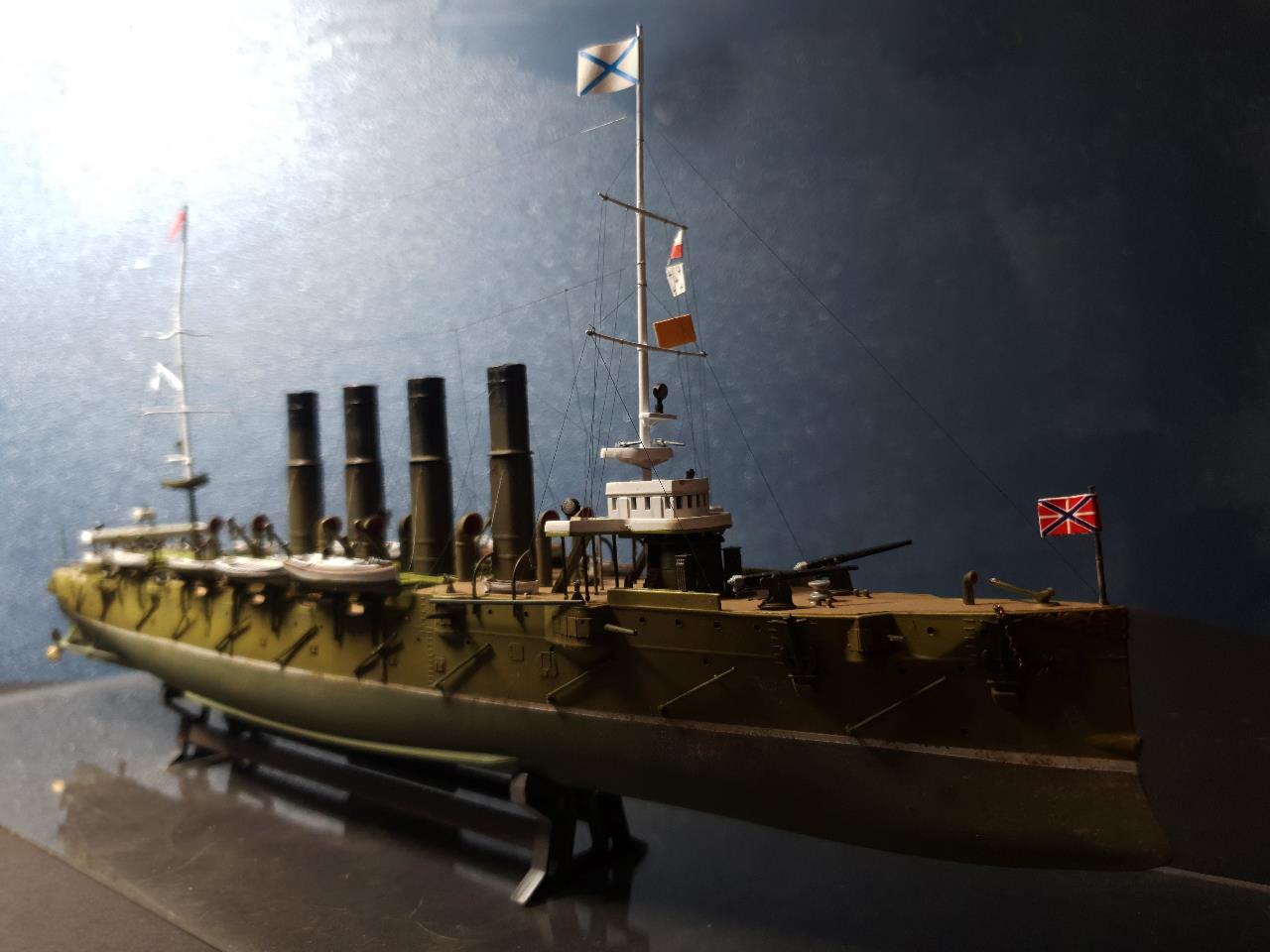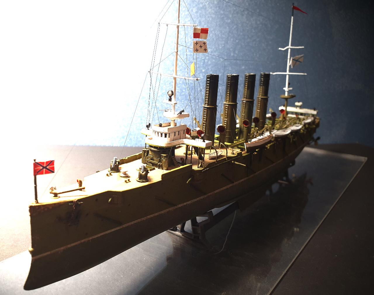 러시아 군함을 비롯하여 이 당시 함선들에서는 종종 흘수선 아래가 녹색계통으로 도색이 된 것들이 보이곤 합니다. 바략은 구글 작례에서 종종 이 부분이 붉게 도색 된 것들이 보이곤 하지만 제 개인적으로는 녹색이 더 잘 어울리는 듯합니다.