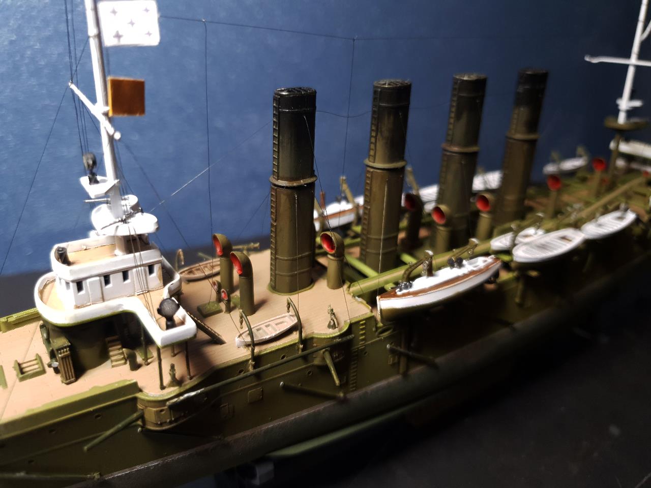안쪽이 빨갛게 칠해진 환기구들이 전함의 초록색과 대비를 이루어 구식 순양함으로써의 단조로움을 줄여주는 듯 합니다.