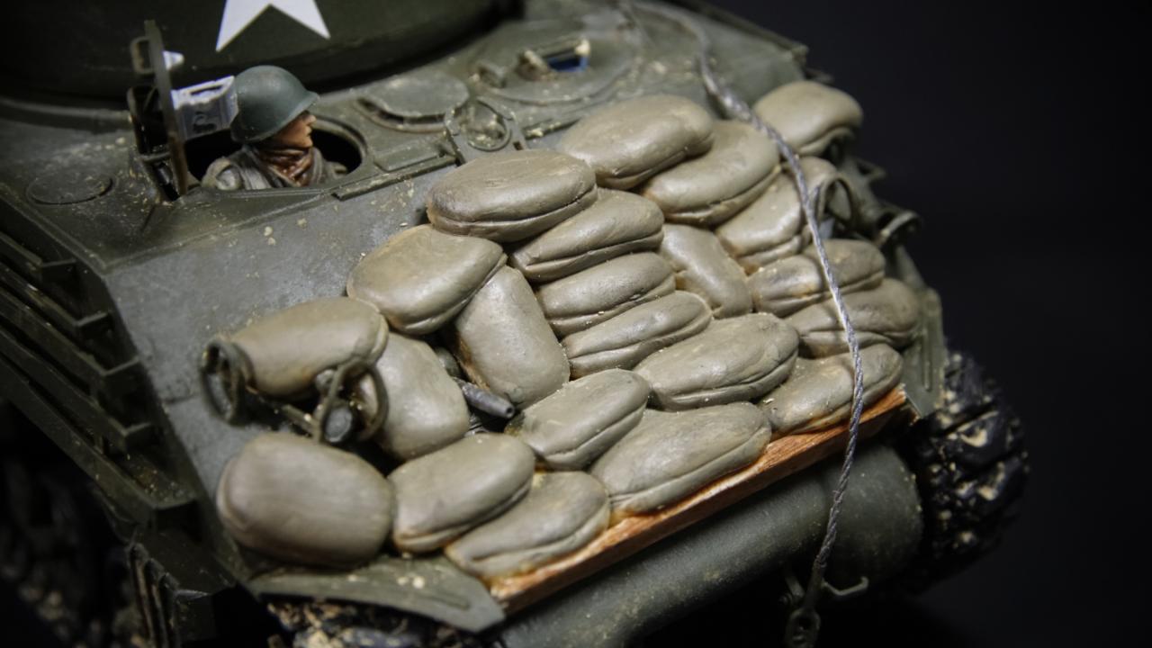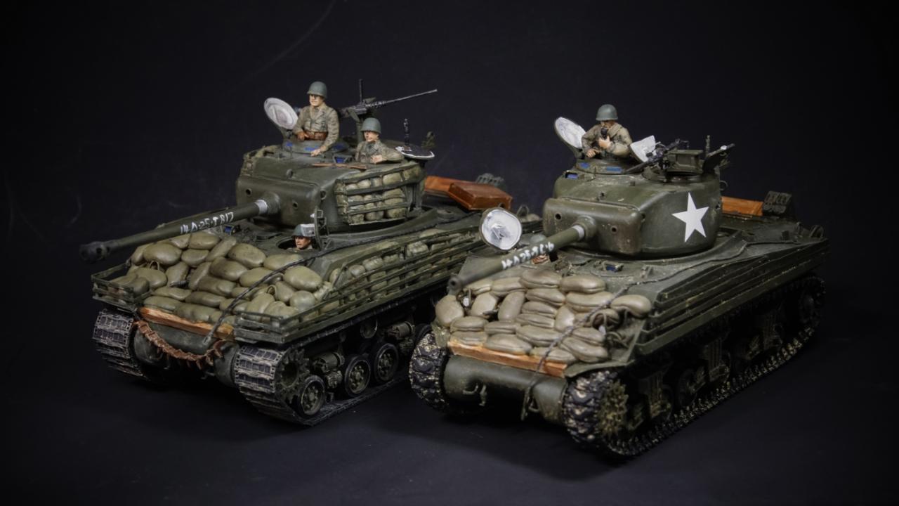 나란히 두고 한컷. 제 14 기갑사단은 모래포대 장비를 기본으로 채택한것 같습니다. 아까 보여드린 실제 사진에서 오른쪽 밑을 보시면 M4A3 76mm를 뒤따라온 다른 전차 (왠지 75mm 같음)들도 전방에 모래포대를 쌓아놓은 듯한 모습을 볼 수 있습니다.