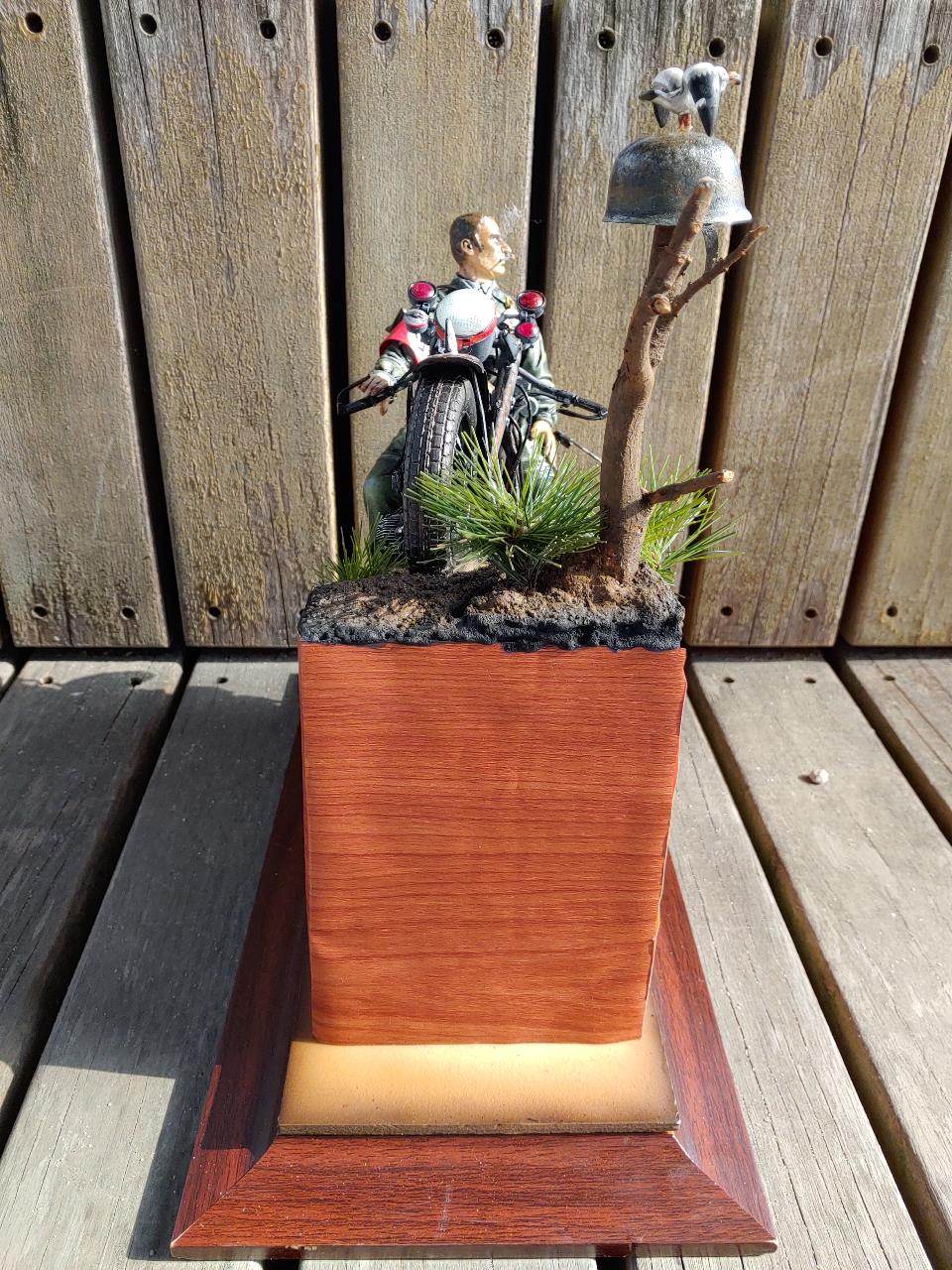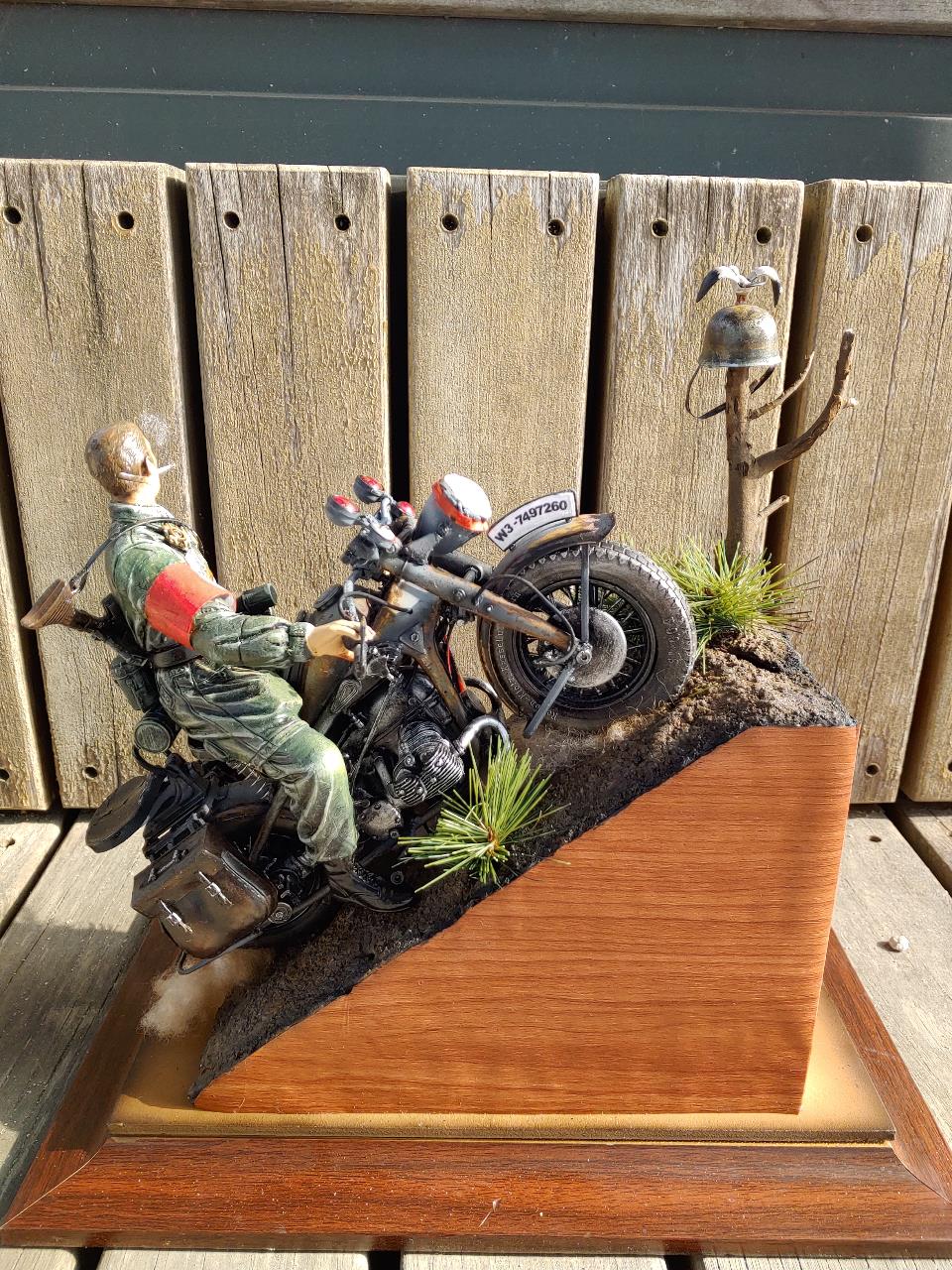 제목은 안쪽에 색깔을 입힌뒤 시트지를 카터칼로 잘라내여 덮어주었습니다.오토바이의 녹표현은 블랙 레드브라운+약간의 레드 그리고 파스텔을 이용하면 되고 나뭇가지는 실제 나뭇가지 풀은 인조솔방울 나무