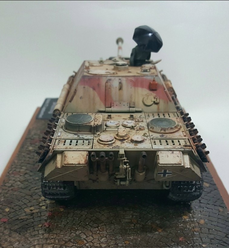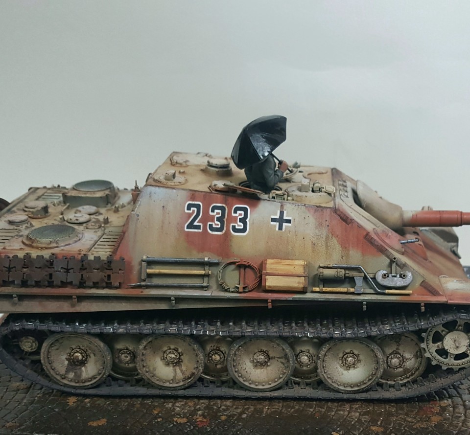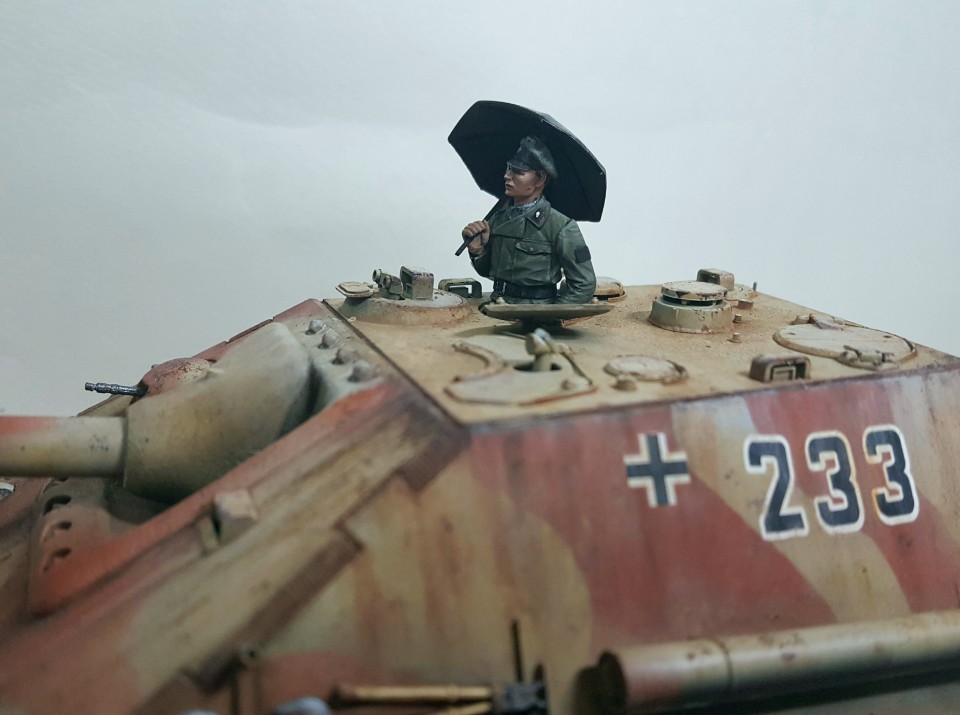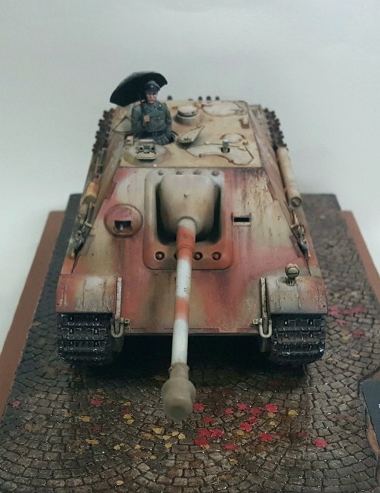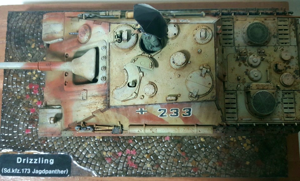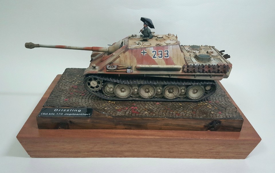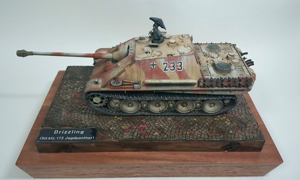 비오는 느낌과 그 분위기를 내는데 집중해서, 완성품 전차에 포신 방수포와 우산 쓴 전차병을 추가했습니다. 지면은 여러 재료를 사용하여 도색을 수차례 했습니다. 전차는 비에 젖은 질감을 표현하려다 원작품을 너무 훼손하는거 같아 그대로 두었습니다.