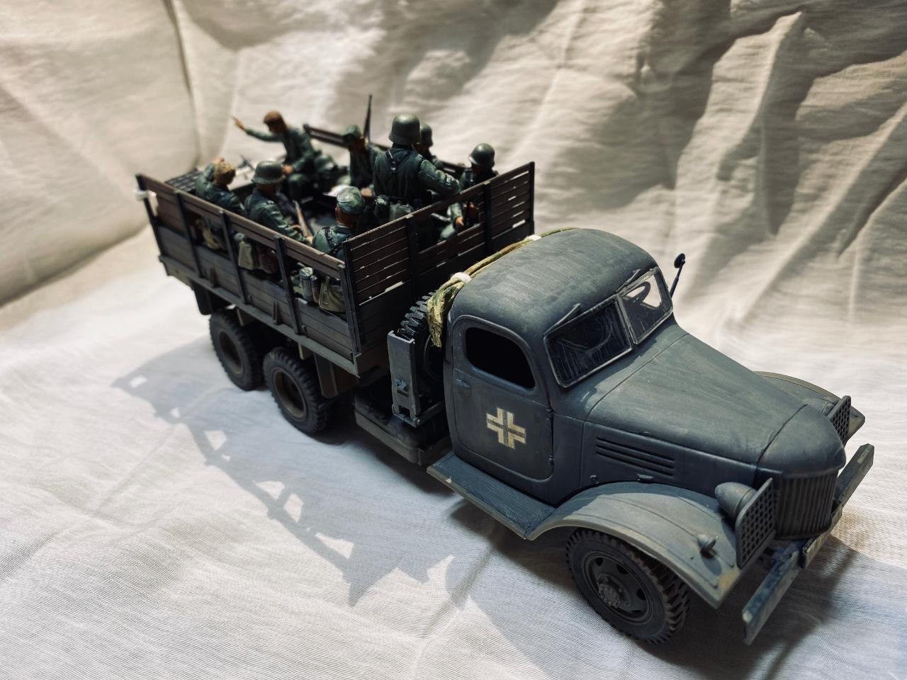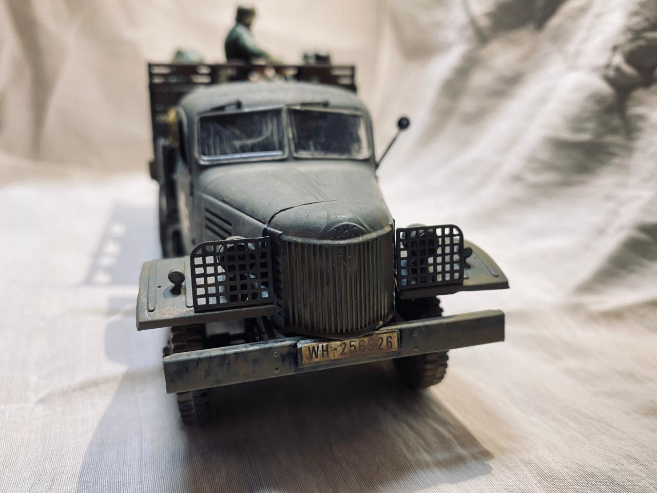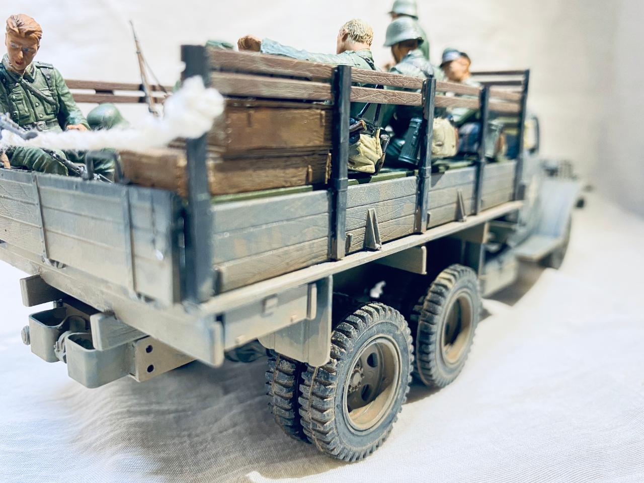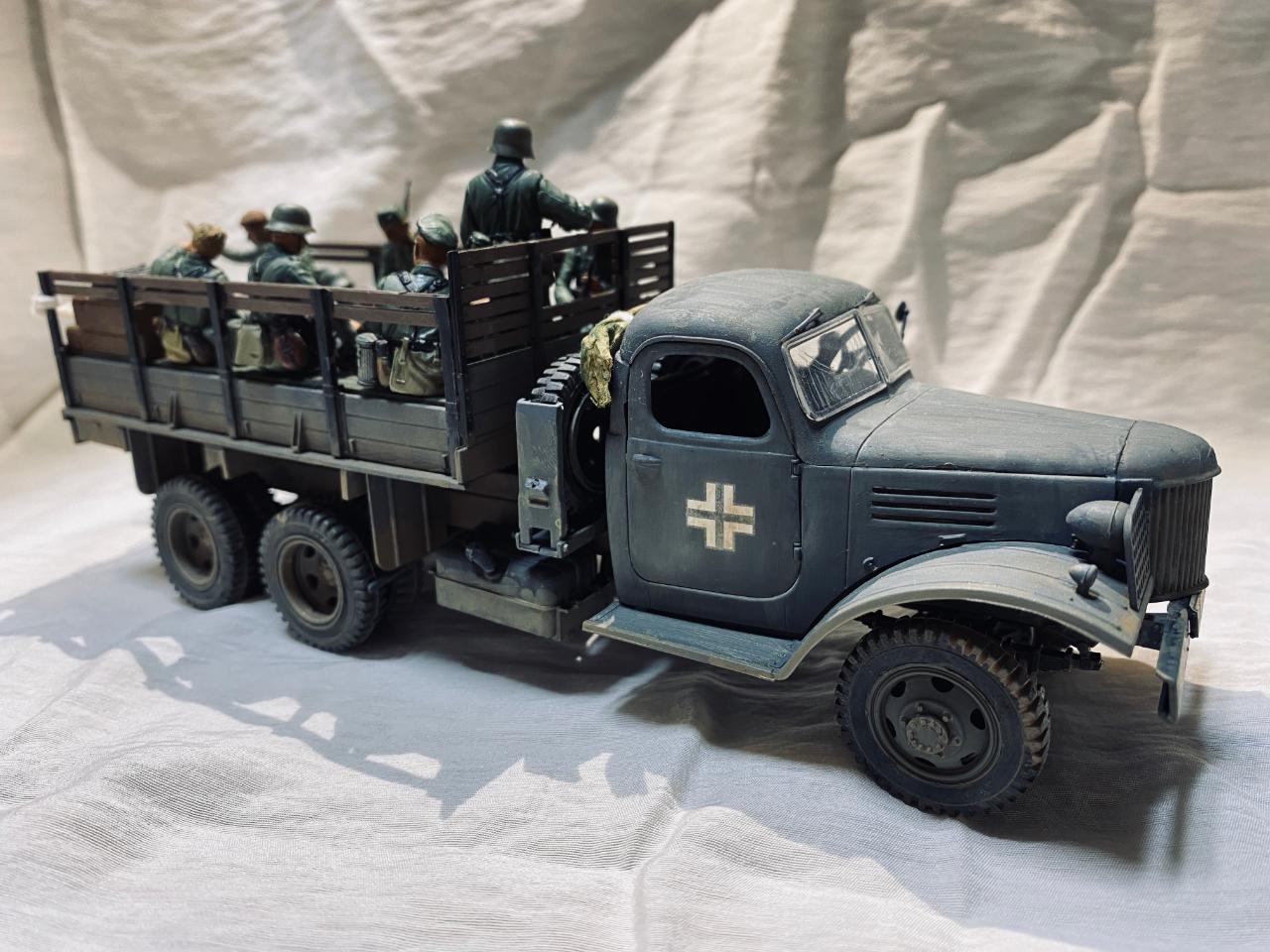 소련제 트럭을 독일 노획버전으로 해서 차체는 타미야아크릴 저먼그레이와 흰색소량 섞어서도색해주었고요 웨더링과 인형도색은 타미야 에나멜로 적합한 색으로 작업해주었습니다. 트럭에 뭔가 꽉찬 느낌을 받고 싶어서 인형까지 얹다보니 작업기간이 많이 길어졌네요. 부족한 실력이지만 즐감하시길 바랍니다.
