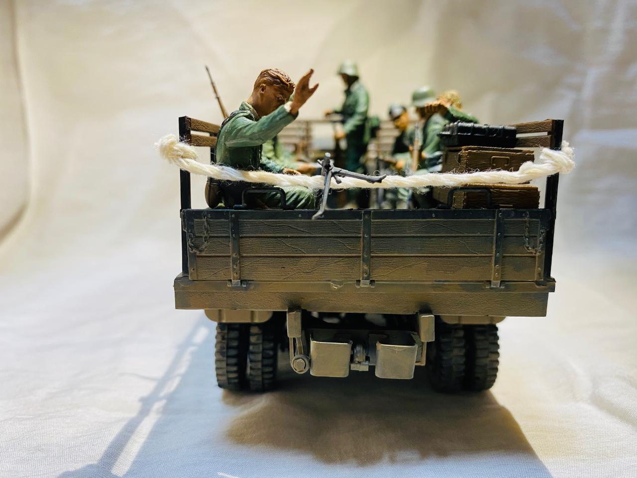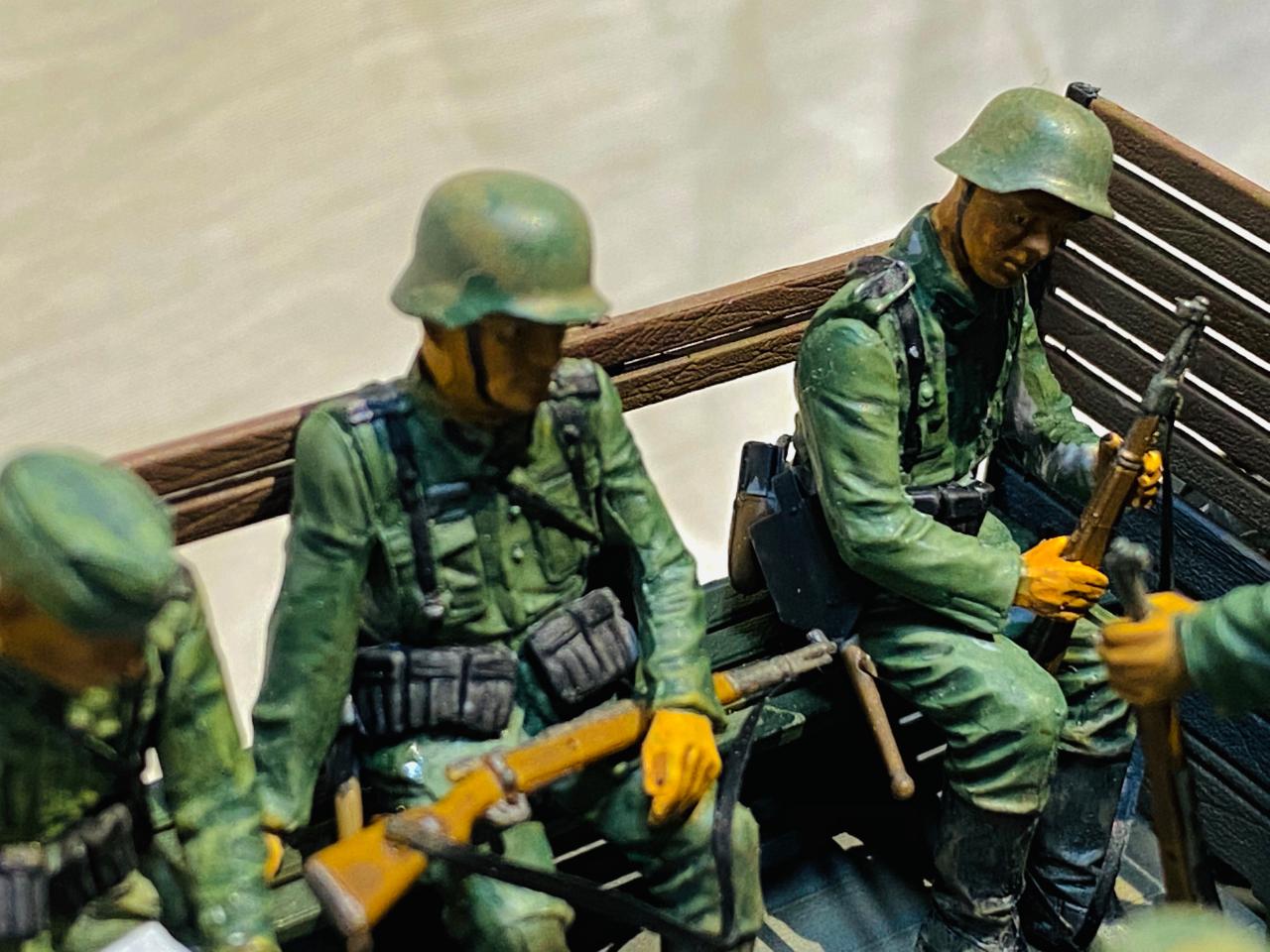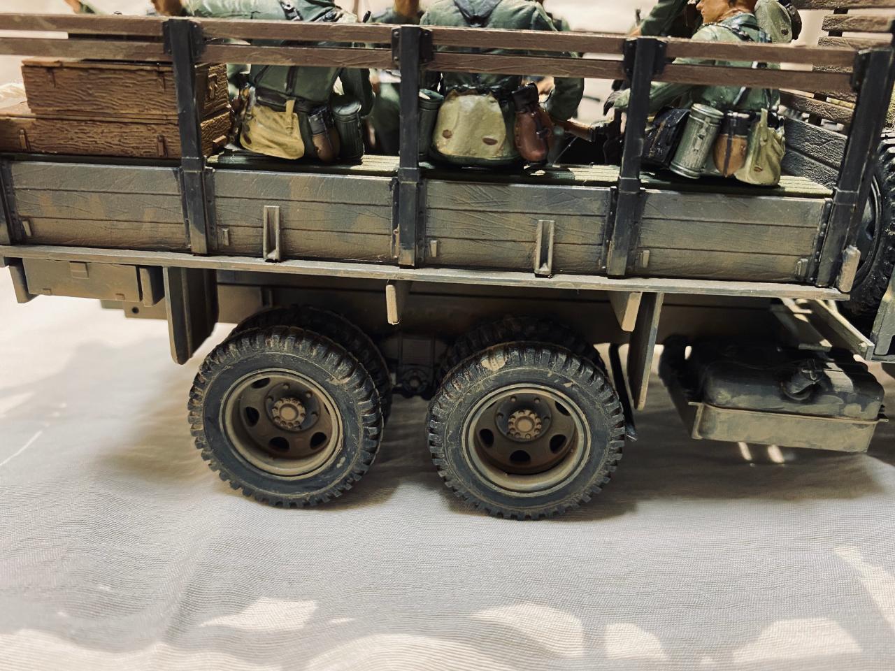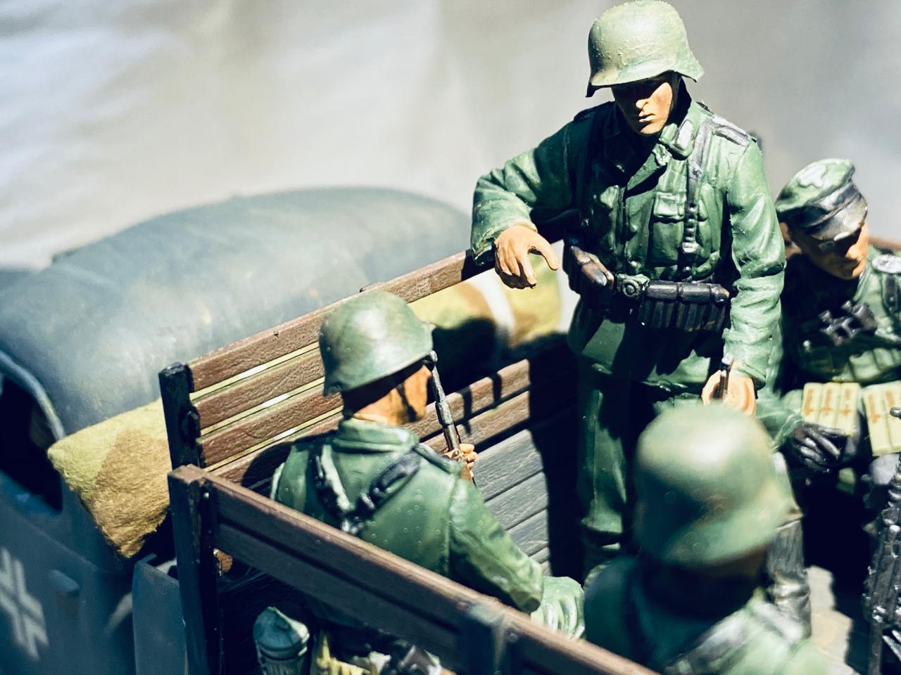 소련제 트럭을 독일 노획버전으로 해서 차체는 타미야아크릴 저먼그레이와 흰색소량 섞어서도색해주었고요 웨더링과 인형도색은 타미야 에나멜로 적합한 색으로 작업해주었습니다. 트럭에 뭔가 꽉찬 느낌을 받고 싶어서 인형까지 얹다보니 작업기간이 많이 길어졌네요. 부족한 실력이지만 즐감하시길 바랍니다.