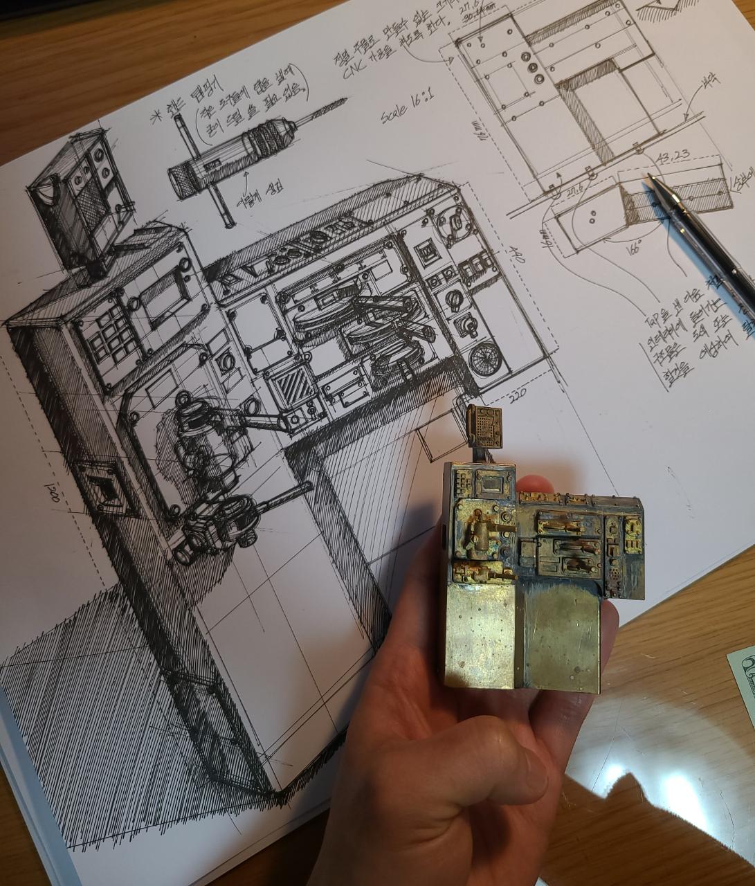 자동차의 대시보드에 해당되는 기관차의 제어대도 측량하면서 형상스케치를 참고용으로 그려낸 후 만들어주고