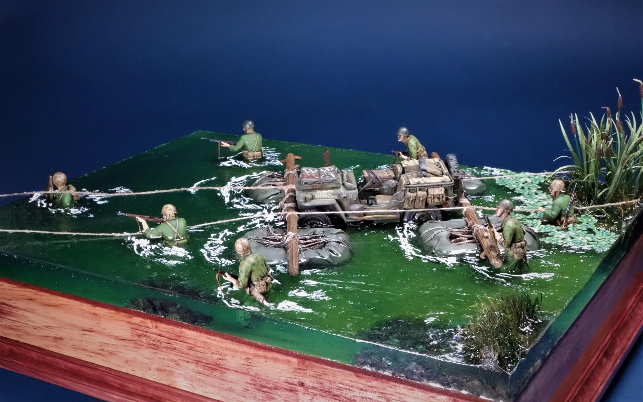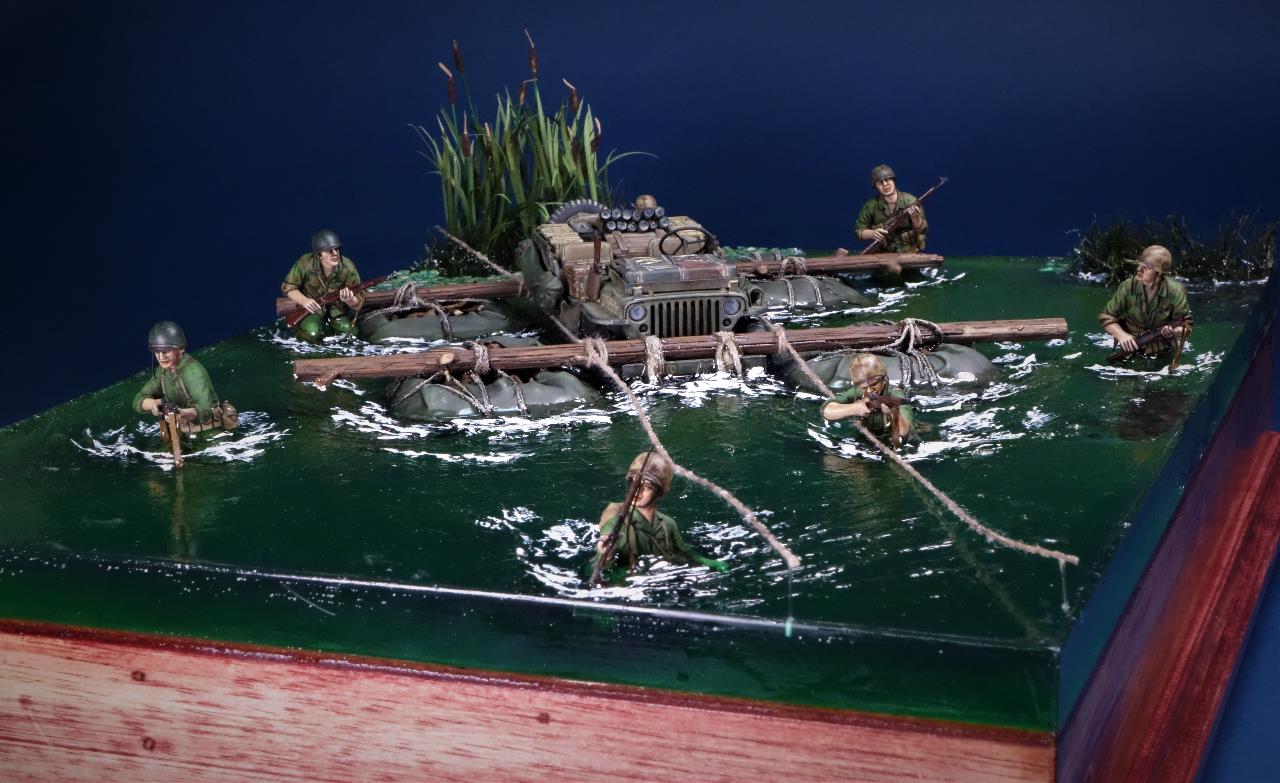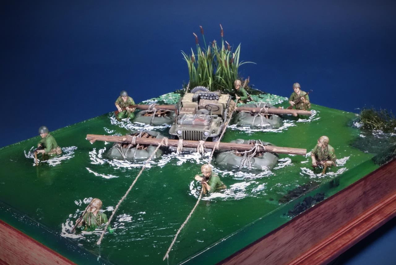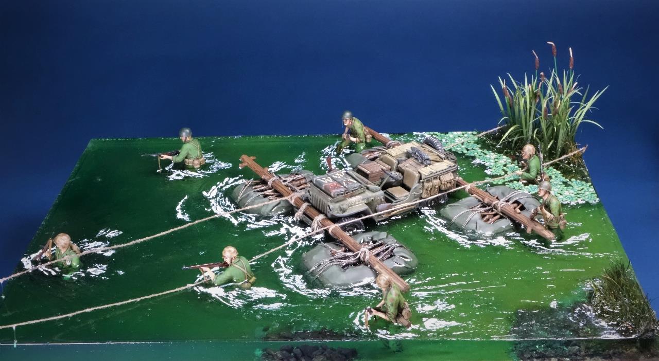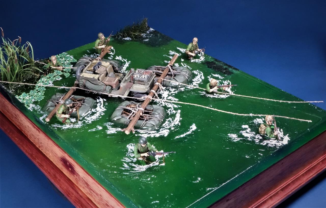 최전방에 보급품을 공급하고자 주변 나무들과 방수포로 만든 급조 도하장비를 이용하여 은밀히 하천을 건넌다는 설정이네요.
