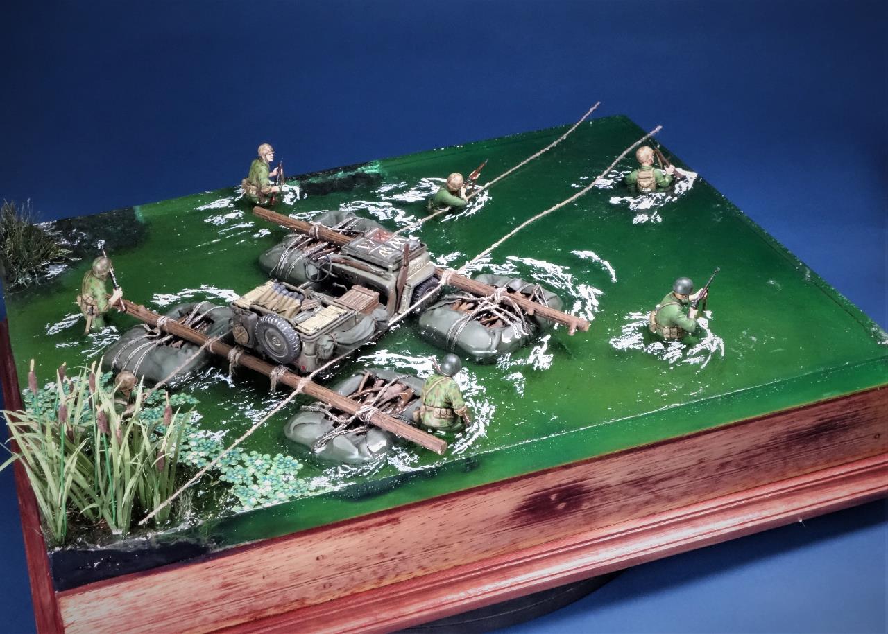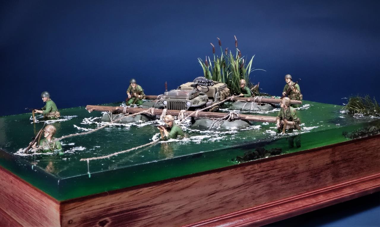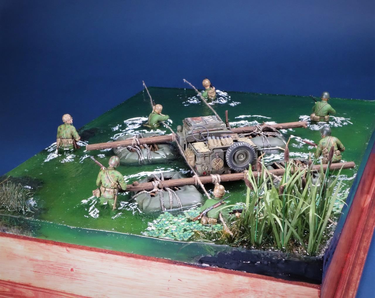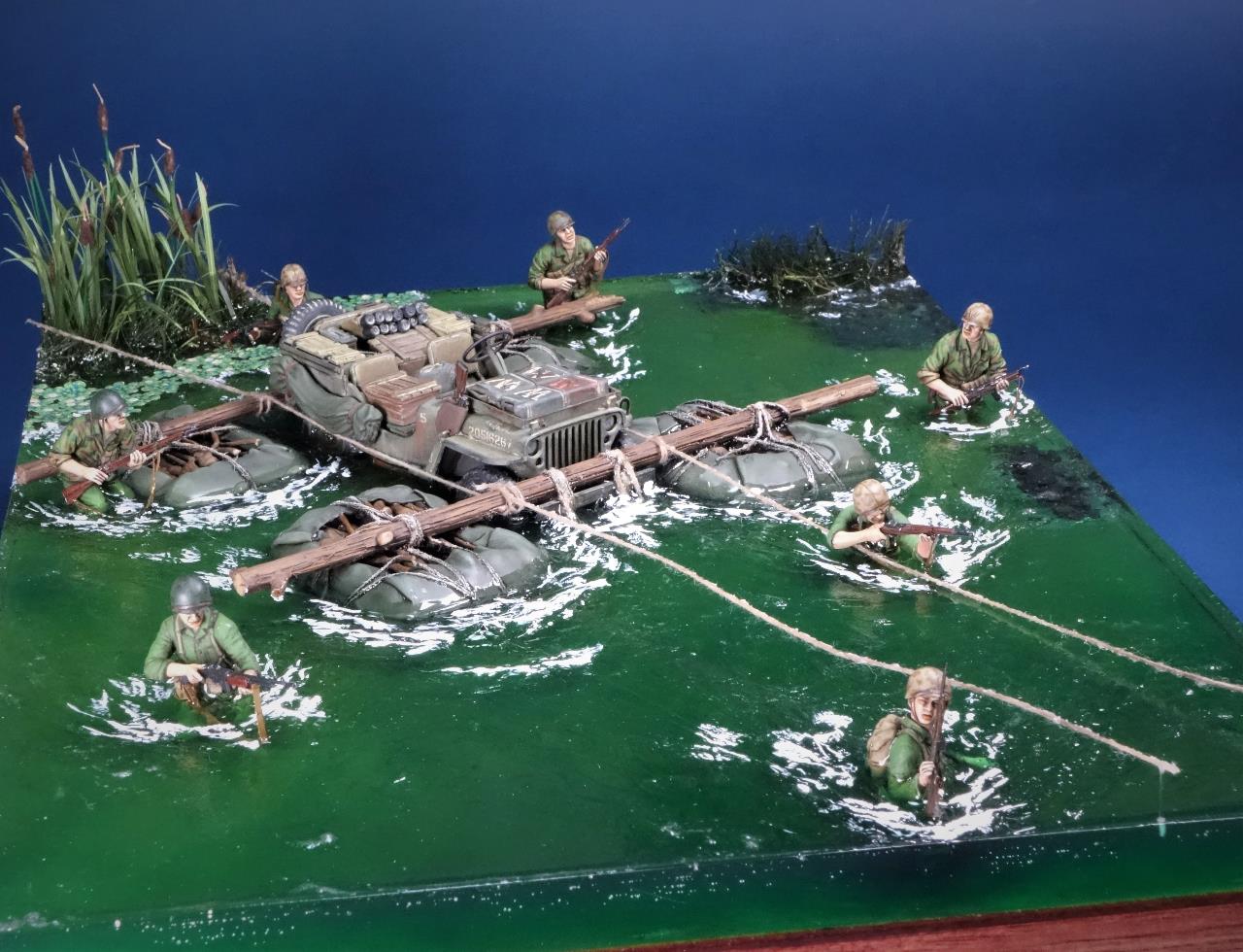최전방에 보급품을 공급하고자 주변 나무들과 방수포로 만든 급조 도하장비를 이용하여 은밀히 하천을 건넌다는 설정이네요.