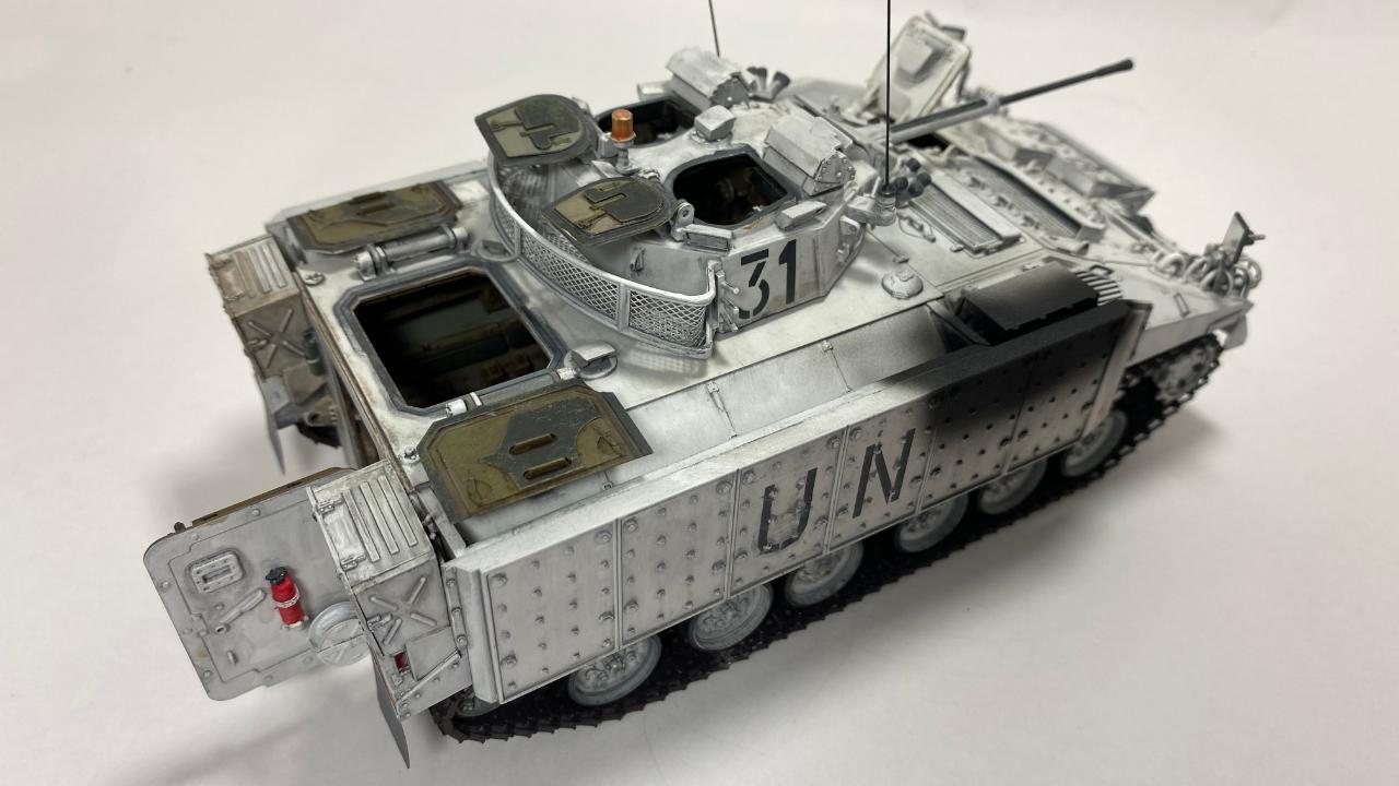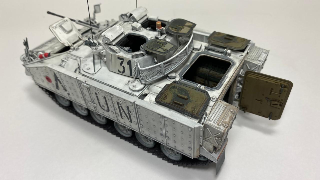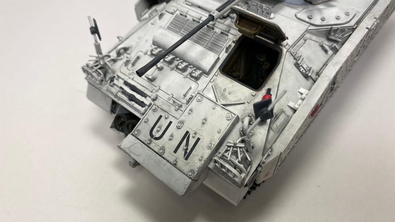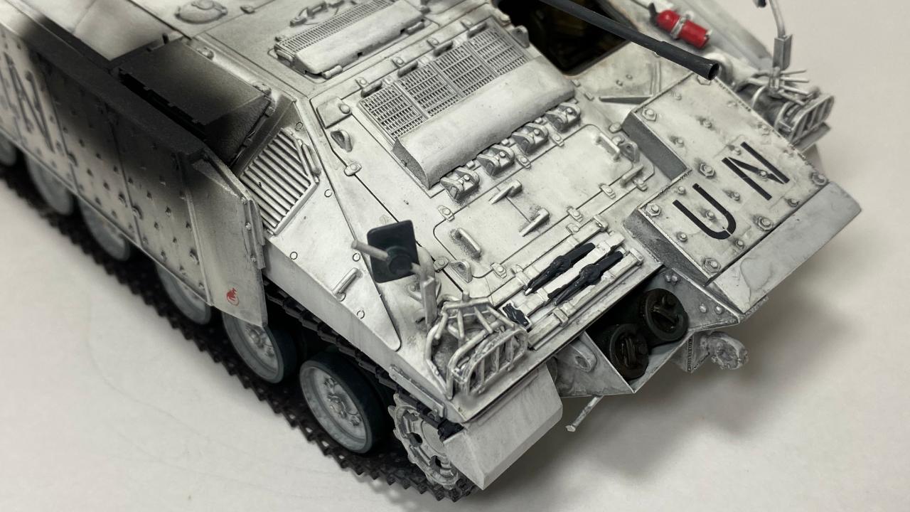 만들고 있는 1995년즈음의 보스니아 내전을 배경으로 한 디오라마에 사용하려고 만든 것이라 지면의 색상을 반영한 하체의 진흙표현이나 배경에 맞는 웨더링이 덜 되어있는 상황입니다. UN군 소속의 흰색바탕 도장은 처음해보는 것이라 긴장을 많이 했더니 아직 좀 어색합니다. 디오라마에 얹기 전에 추가적인 웨더링을 더 해서 자연스럽게 만들어보고 싶습니다.