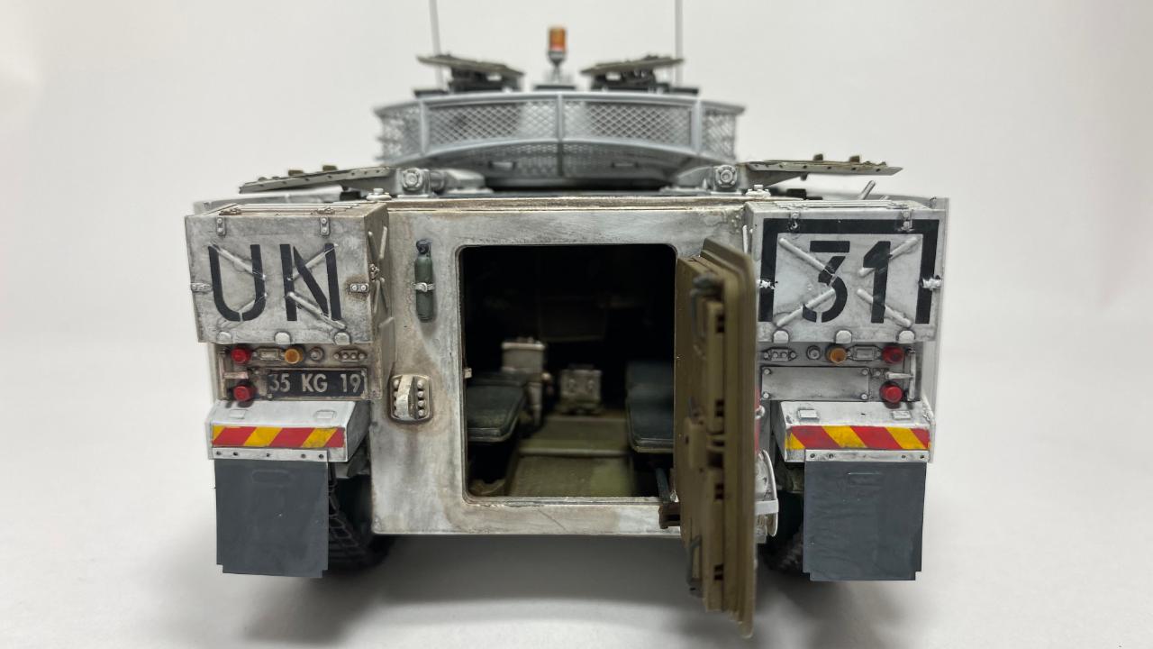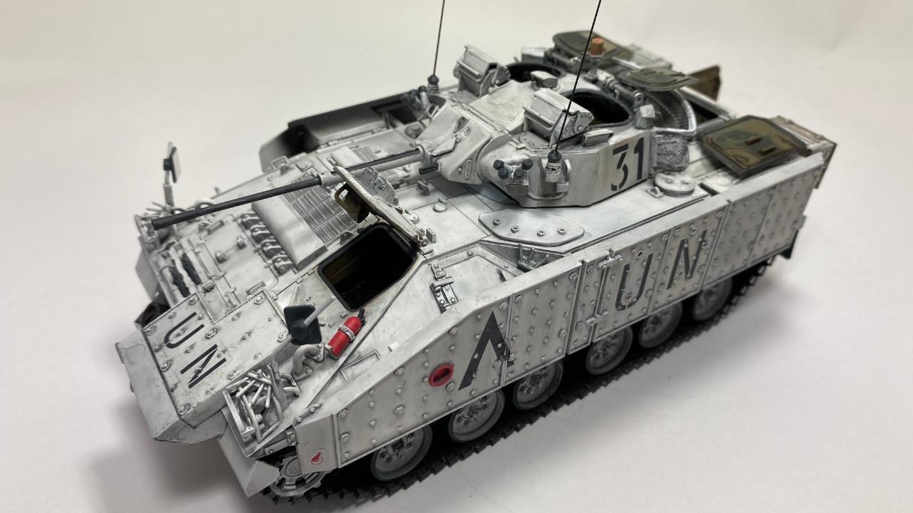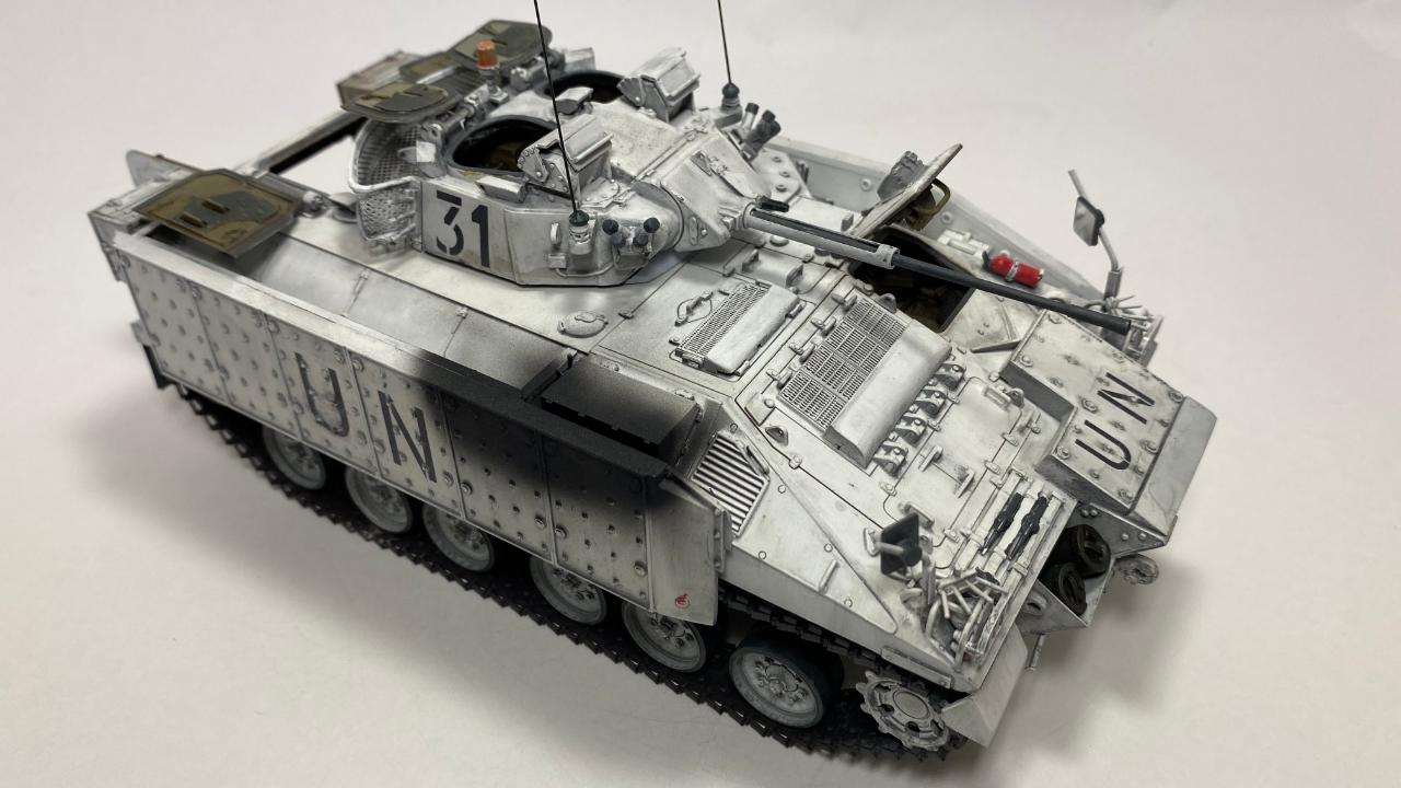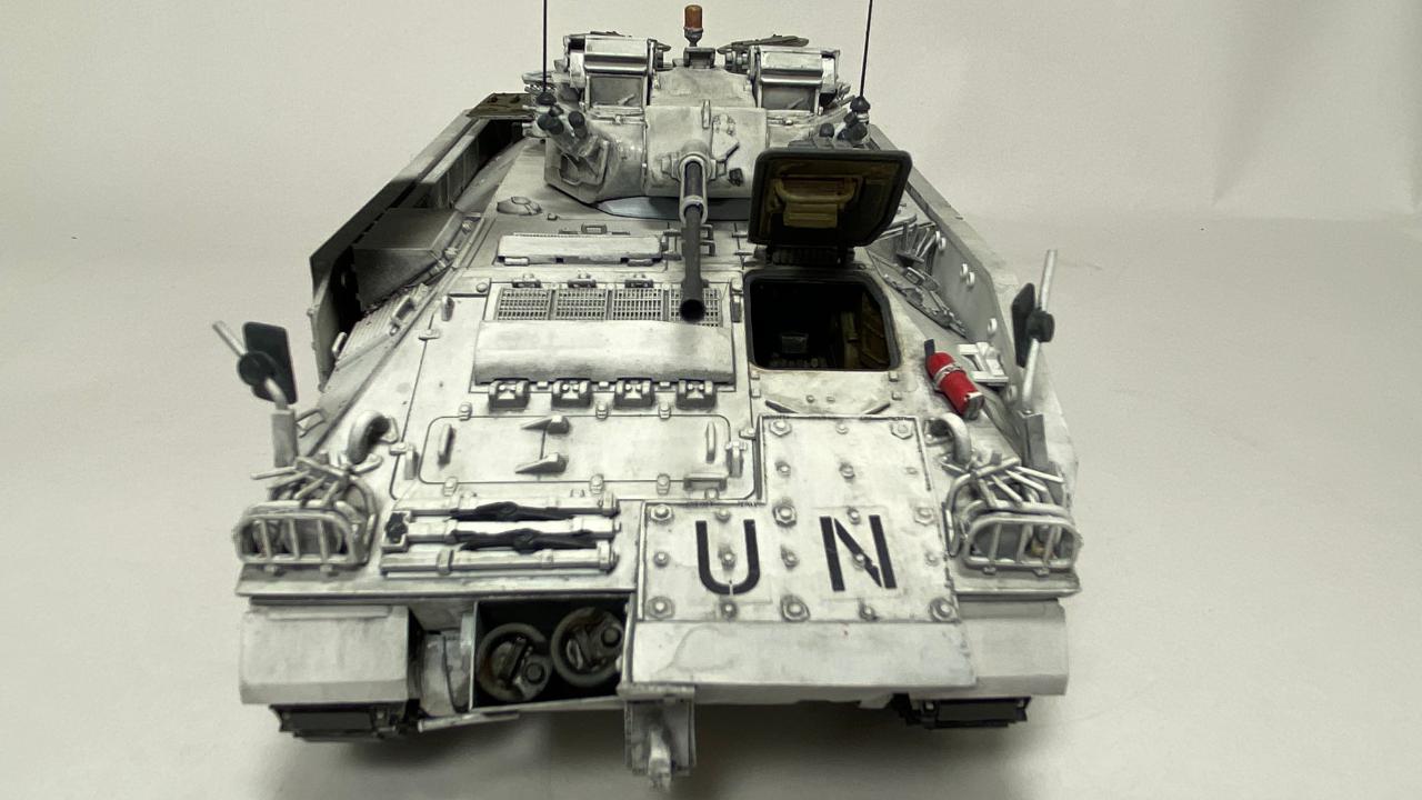 만들고 있는 1995년즈음의 보스니아 내전을 배경으로 한 디오라마에 사용하려고 만든 것이라 지면의 색상을 반영한 하체의 진흙표현이나 배경에 맞는 웨더링이 덜 되어있는 상황입니다. UN군 소속의 흰색바탕 도장은 처음해보는 것이라 긴장을 많이 했더니 아직 좀 어색합니다. 디오라마에 얹기 전에 추가적인 웨더링을 더 해서 자연스럽게 만들어보고 싶습니다.