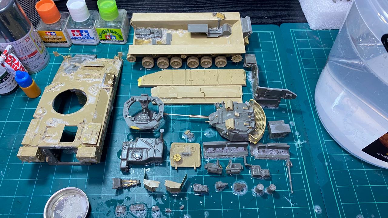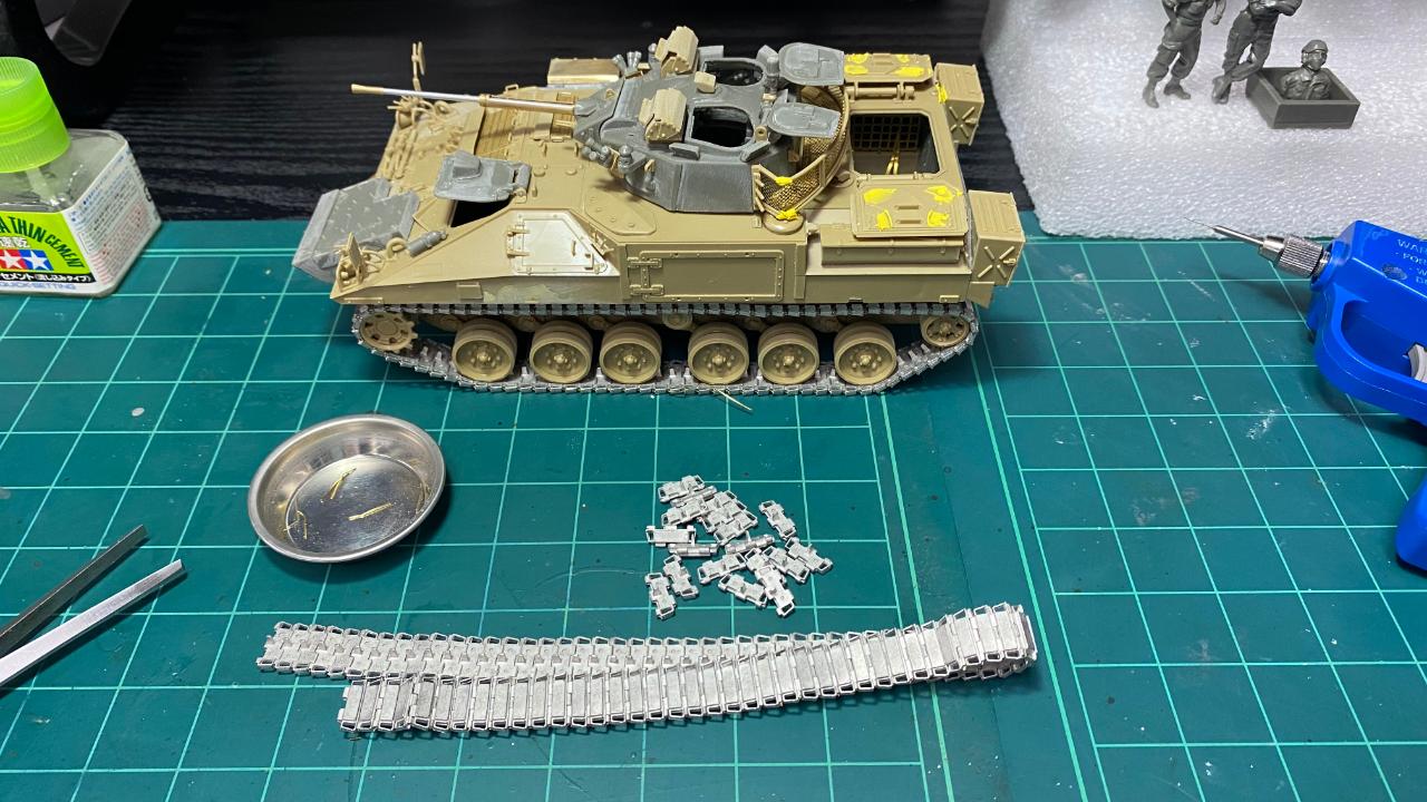 사용한 키트는 아카데미과학의 Warrior MCV키트에 Accurate Armour의 인테리어세트(A088)와 업데이트세트(A056), 프리울트랙과 RB모델제 Rarden기관포 등을 사용하였습니다. 인테리어세트는 포탑쪽의 난이도가 좀 높았고 어렵사리 만들었는데 사진에는 대부분 잘 보이지 않아 아쉽습니다. 데칼은 키트에 들어있는 것을 그대로 사용했는데, 사용한 키트가 1990년대에 발매된 구판키트여서 UN군사양의 데칼이 들어있습니다. 데칼이 생각보다 너무 잘게 바스러져서 간신히 이어붙이기를 했습니다.