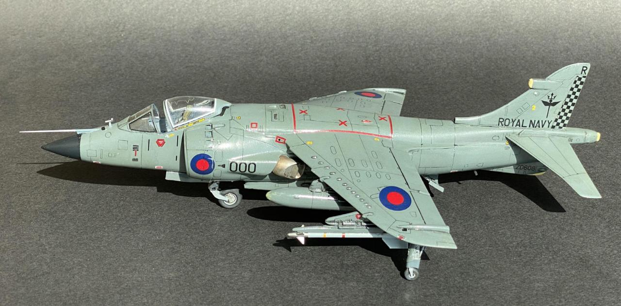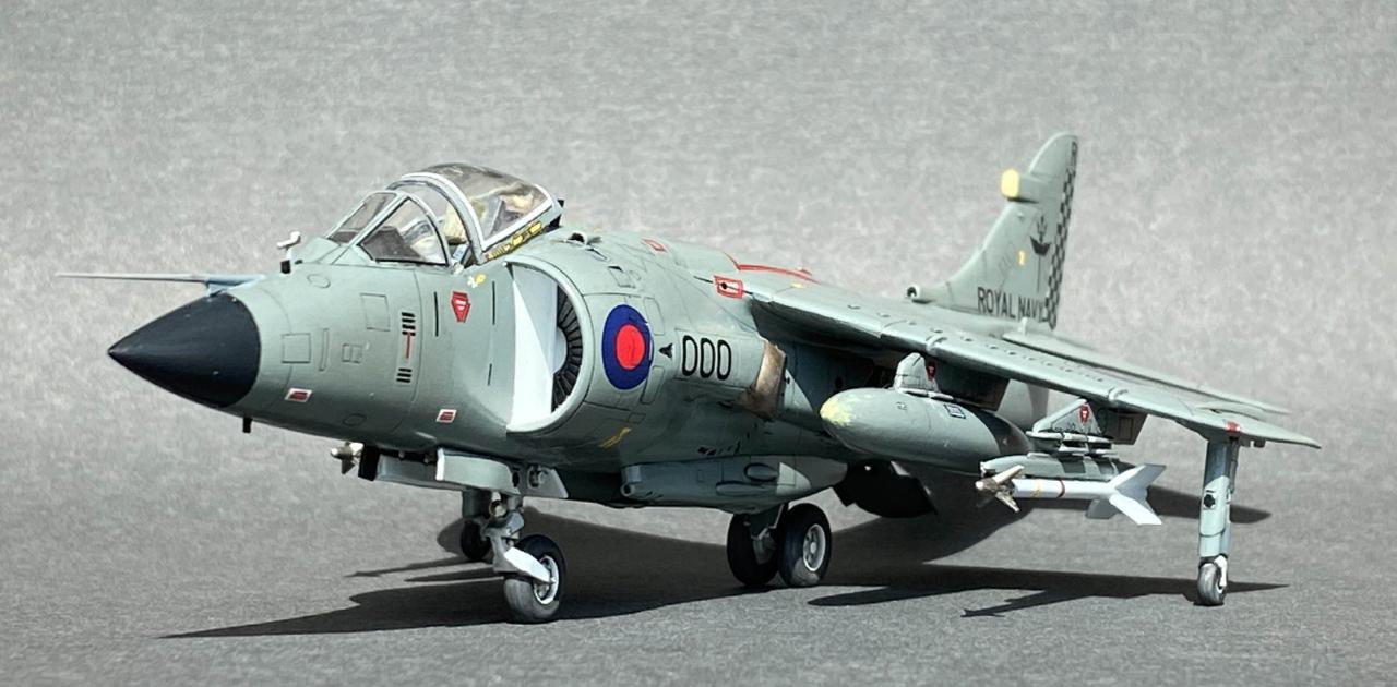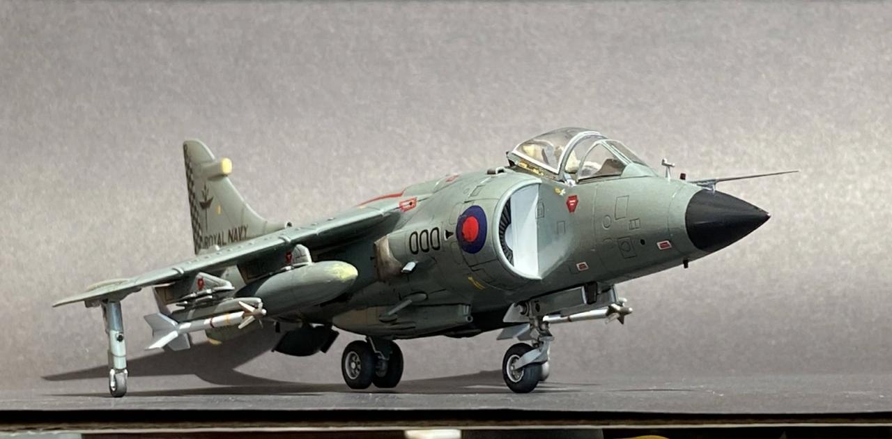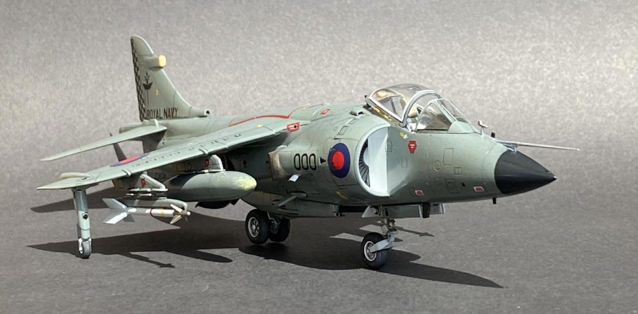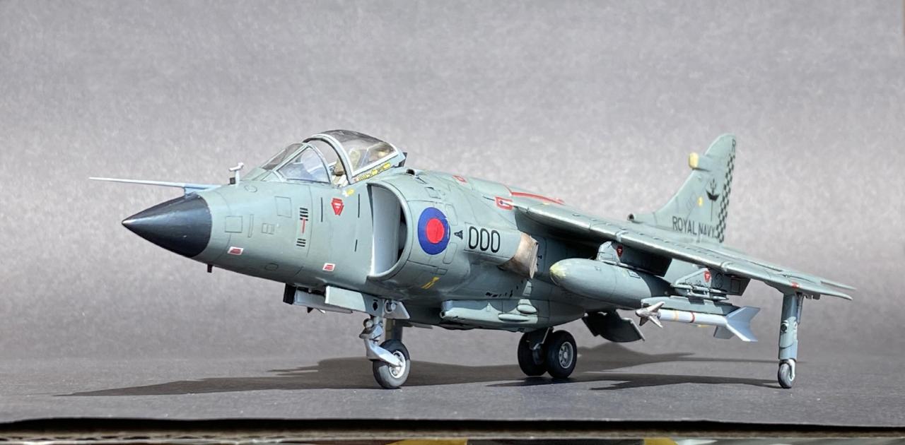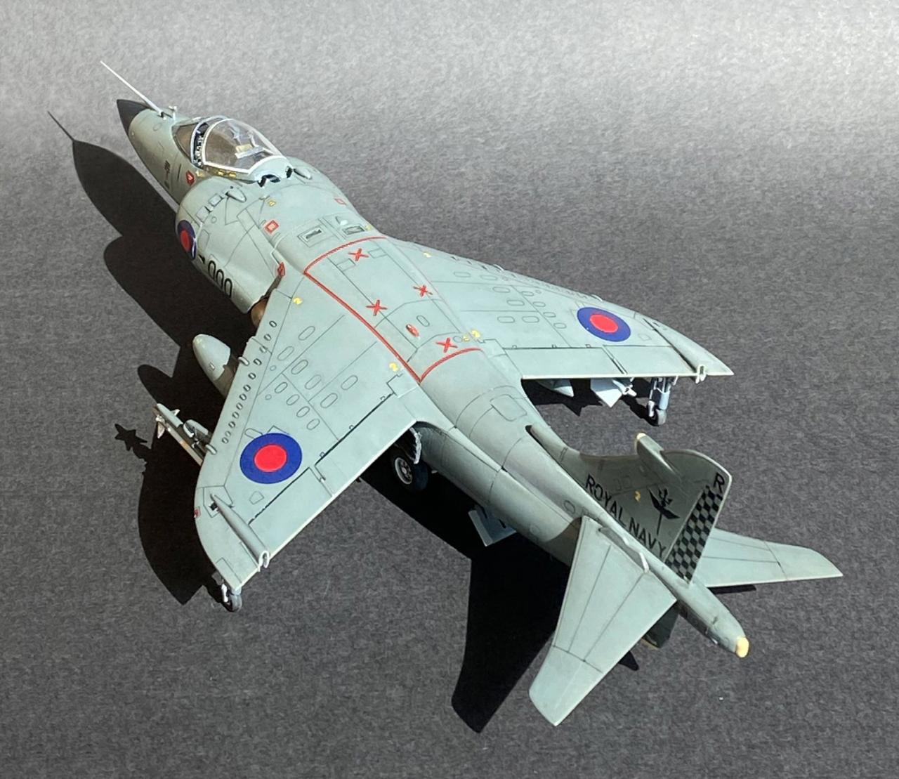 예전에 대충 만들었던 것을 다시 손봐서 마무리 지었는데 별다른 디테일이 없는 캇핏 내에 좌석 벨트를 추가하였으며 부러져서 없어진 안테나와 피토관 등을 다시 만들어 붙였습니다. 포클랜드 전쟁에 참전했던 기체 마킹이며 아크릴 붓도색 후 유광으로 마감하였고 실물 기체 사진을 참고하여 연료탱크 앞부분에 프라이머가 드러난 정도만 표현했습니다.
