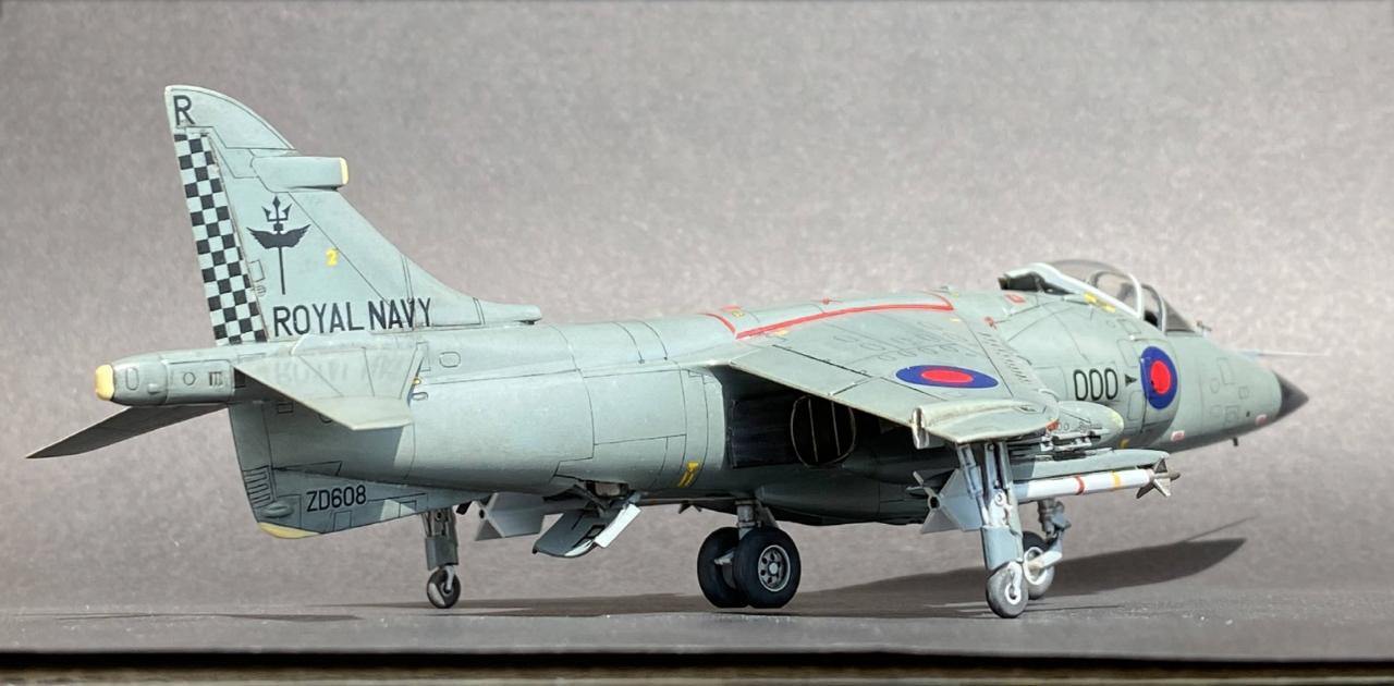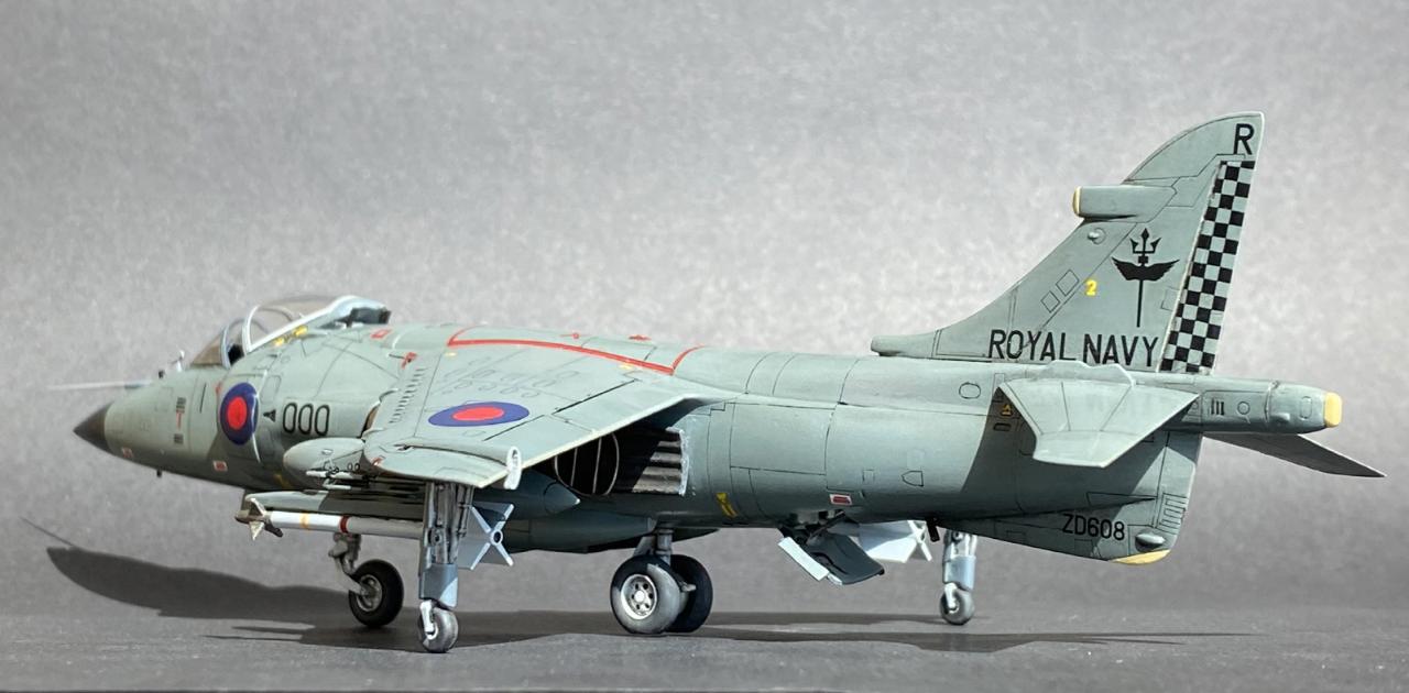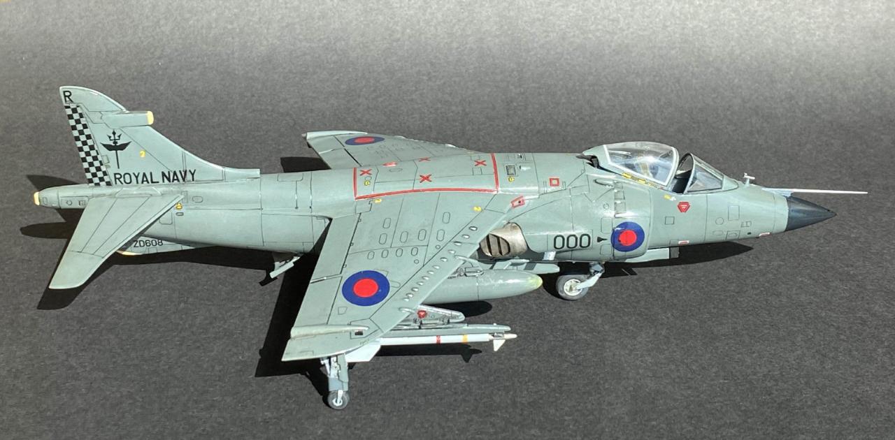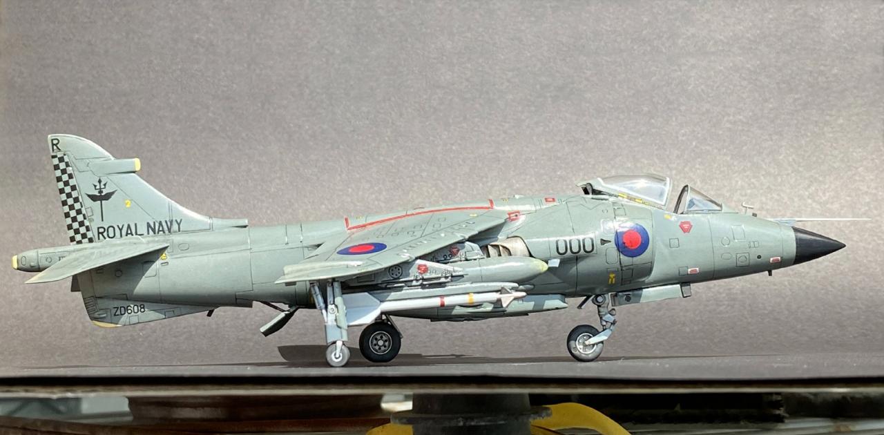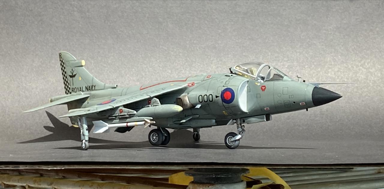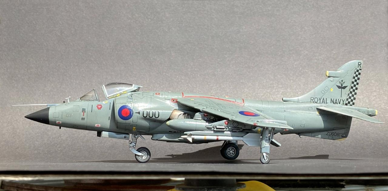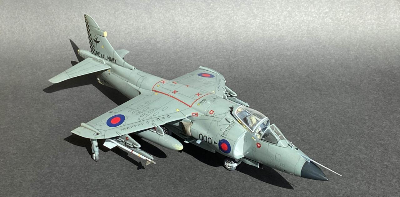 예전에 대충 만들었던 것을 다시 손봐서 마무리 지었는데 별다른 디테일이 없는 캇핏 내에 좌석 벨트를 추가하였으며 부러져서 없어진 안테나와 피토관 등을 다시 만들어 붙였습니다. 포클랜드 전쟁에 참전했던 기체 마킹이며 아크릴 붓도색 후 유광으로 마감하였고 실물 기체 사진을 참고하여 연료탱크 앞부분에 프라이머가 드러난 정도만 표현했습니다.