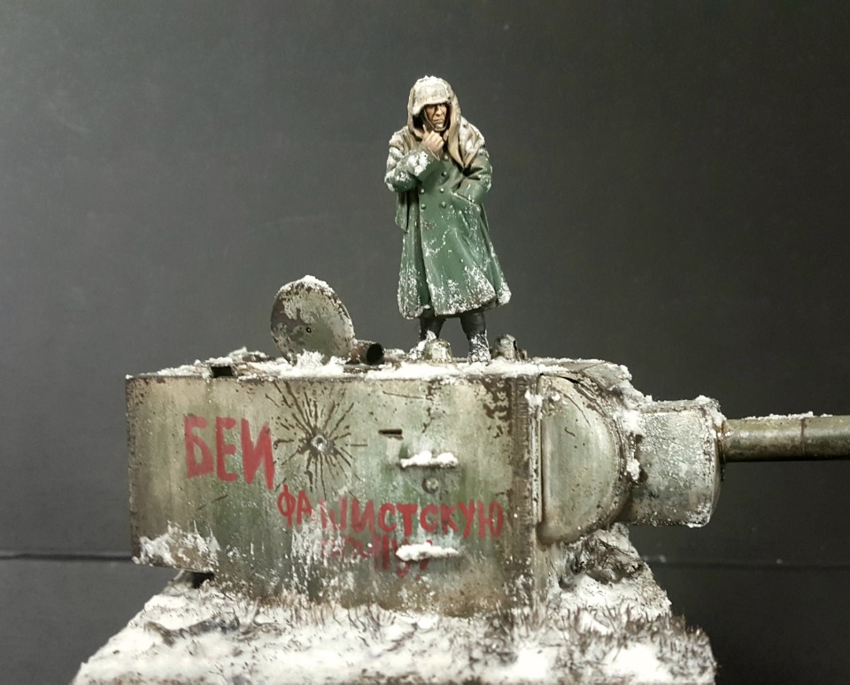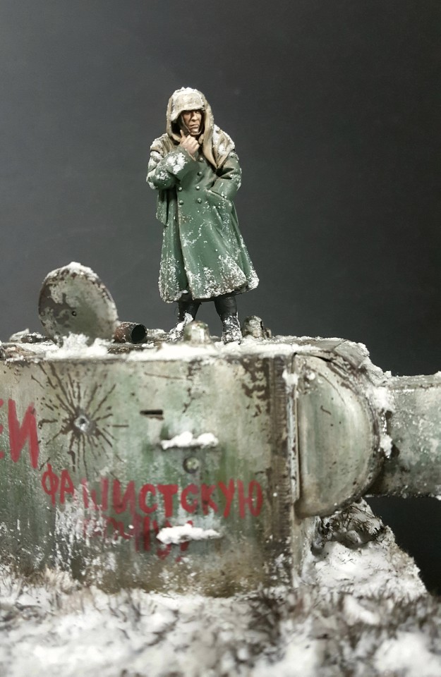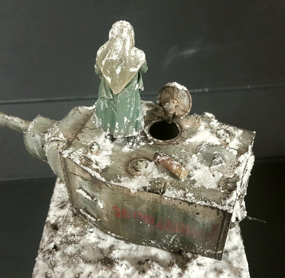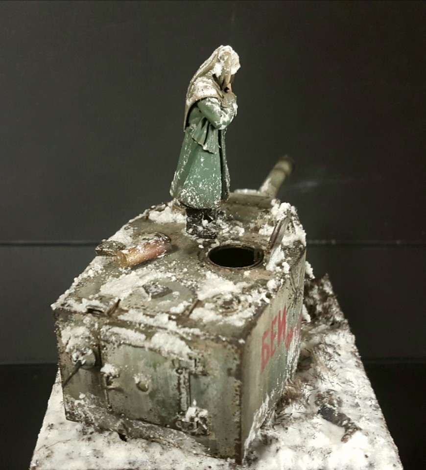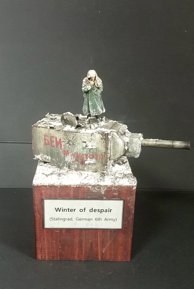 적당한 크기의 나무베이스에 눈 내린 러시아 평원 모습을 표현하고, 가지고 있던 도색된 인형과 KV2 포탑을 배치후 분위기에 맞게 추가 덧칠을 통해 완성하였습니다.