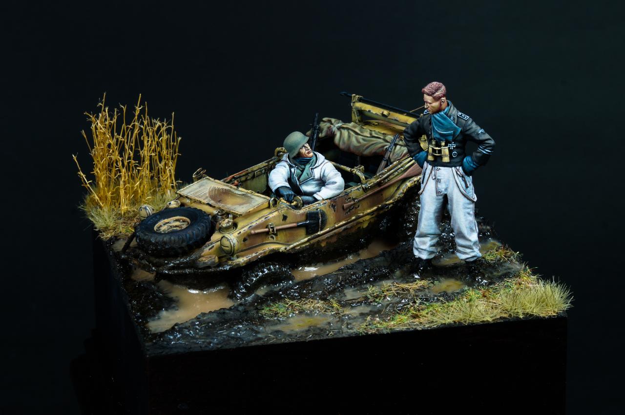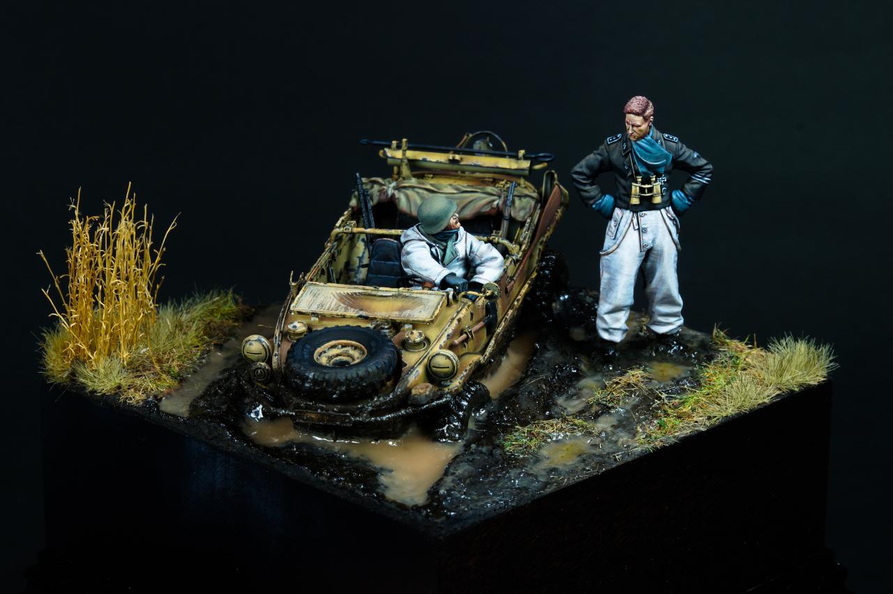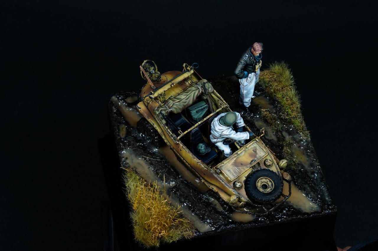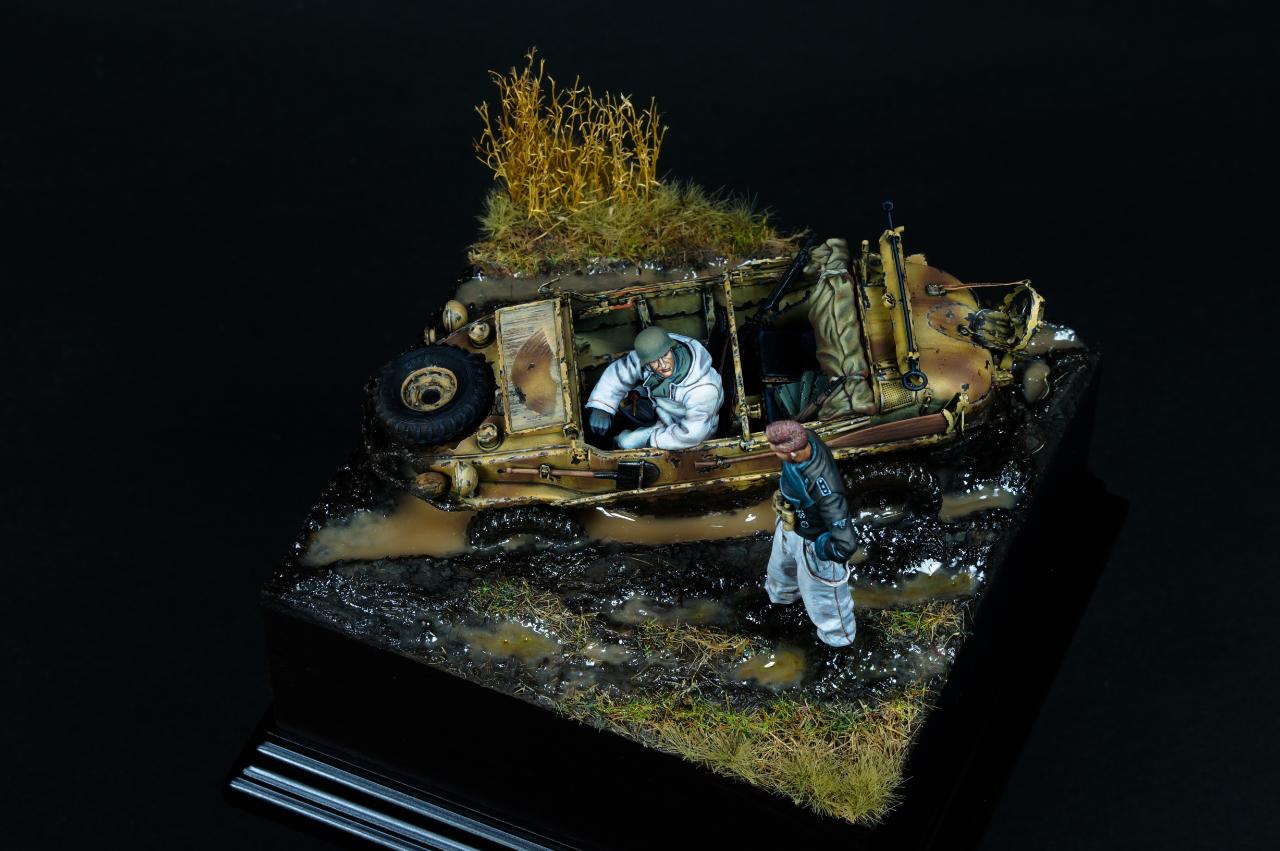 안녕하세요? 오랜만에 1/35 스케일 비넷작업을 해 보았습니다. 진흙에 갇힌 Schwimmwagen과 이를 난처해하는 모습을 컨셉으로 작업해 보았습니다.