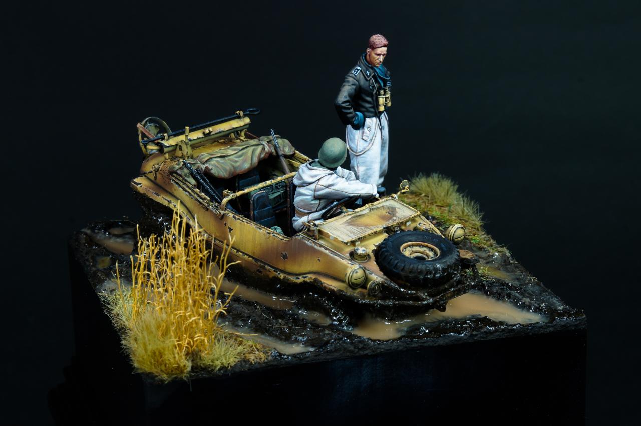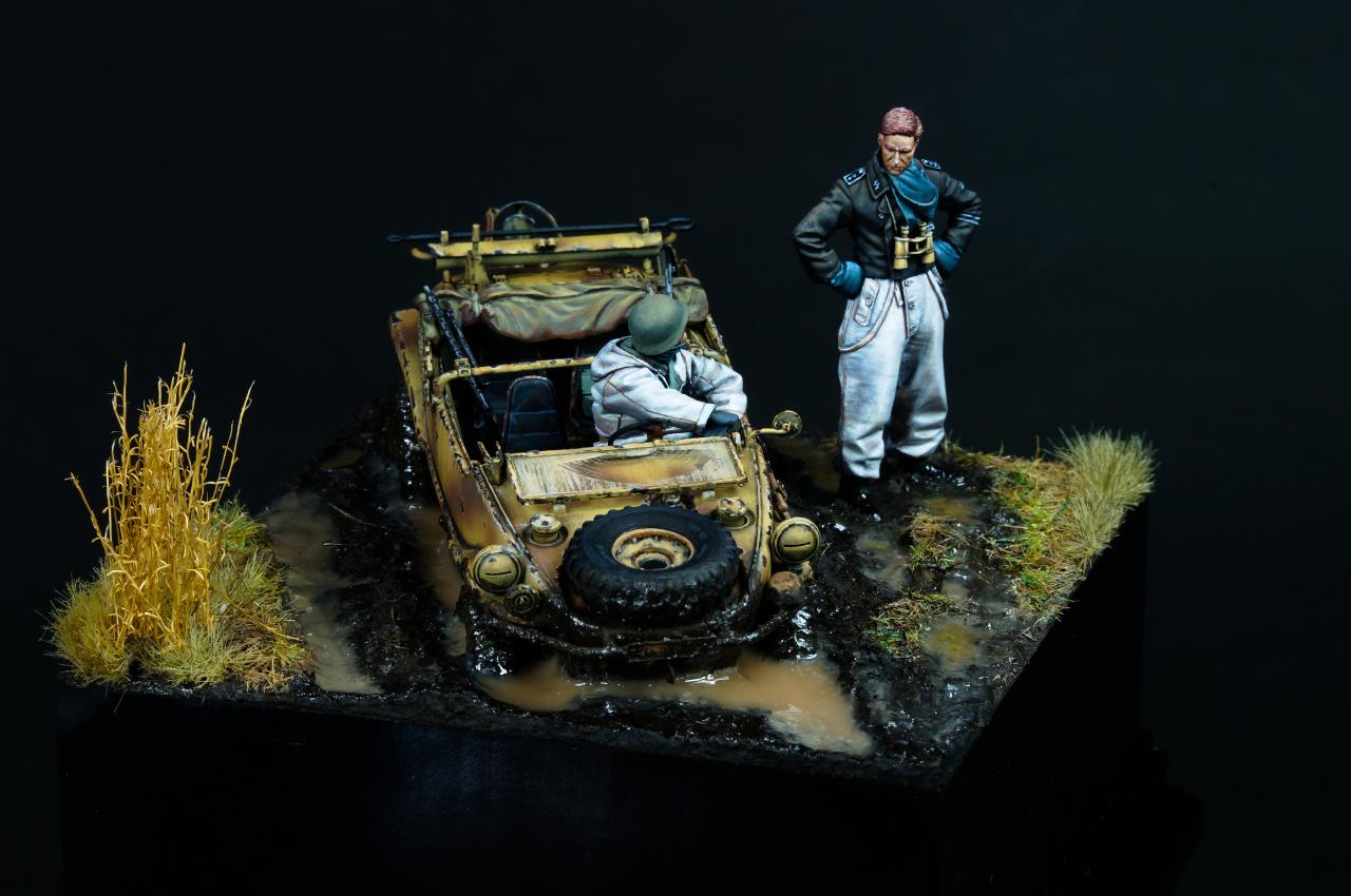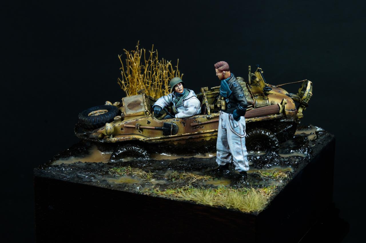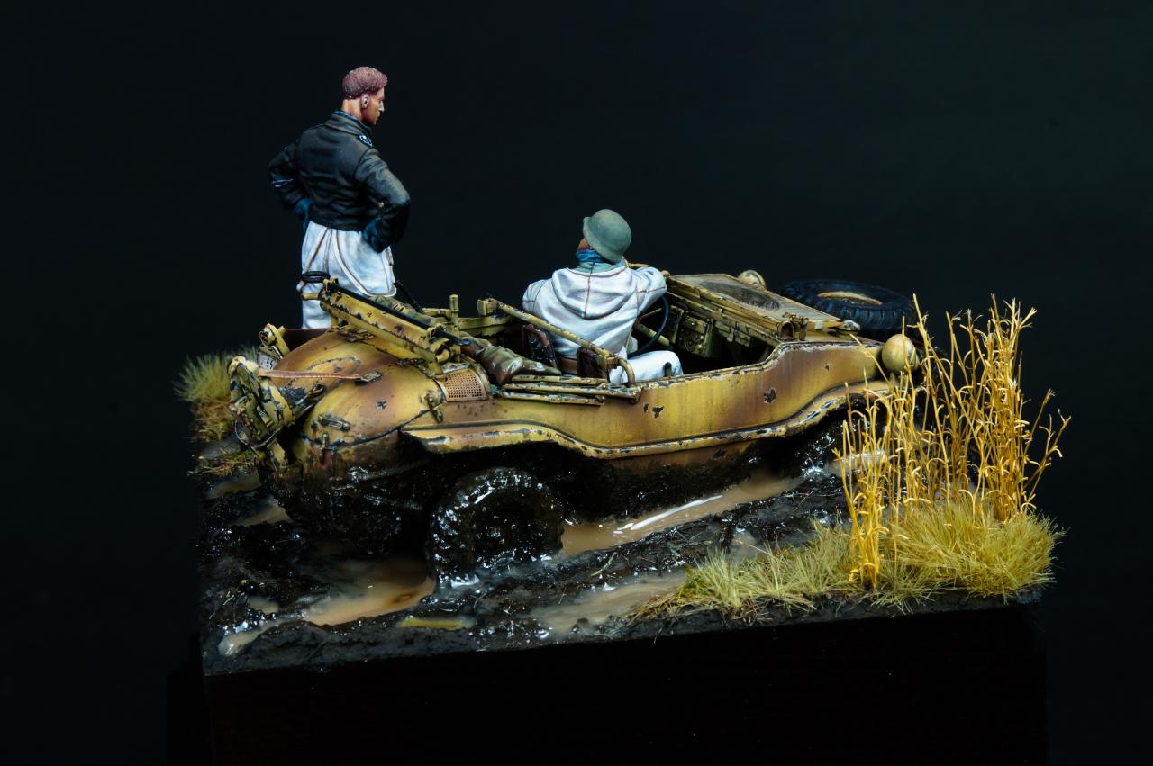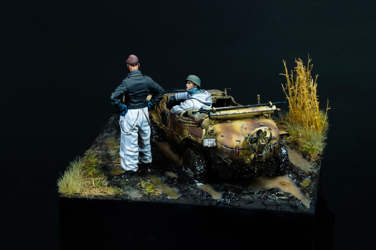 안녕하세요? 오랜만에 1/35 스케일 비넷작업을 해 보았습니다. 진흙에 갇힌 Schwimmwagen과 이를 난처해하는 모습을 컨셉으로 작업해 보았습니다.
